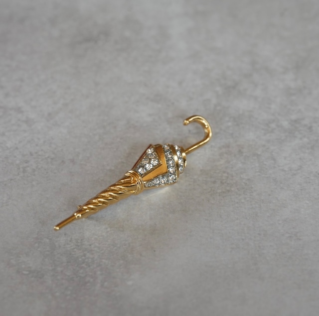 凛とした雰囲気が漂うシャープなデザインのアンブレラブローチ。(傘、よりもアンブレラという呼び方が似合うと思いました)キラキラのビーズでほんの少しの華やかさも忘れていません。 サイズ 長さ約7㎝ 材質 メタル