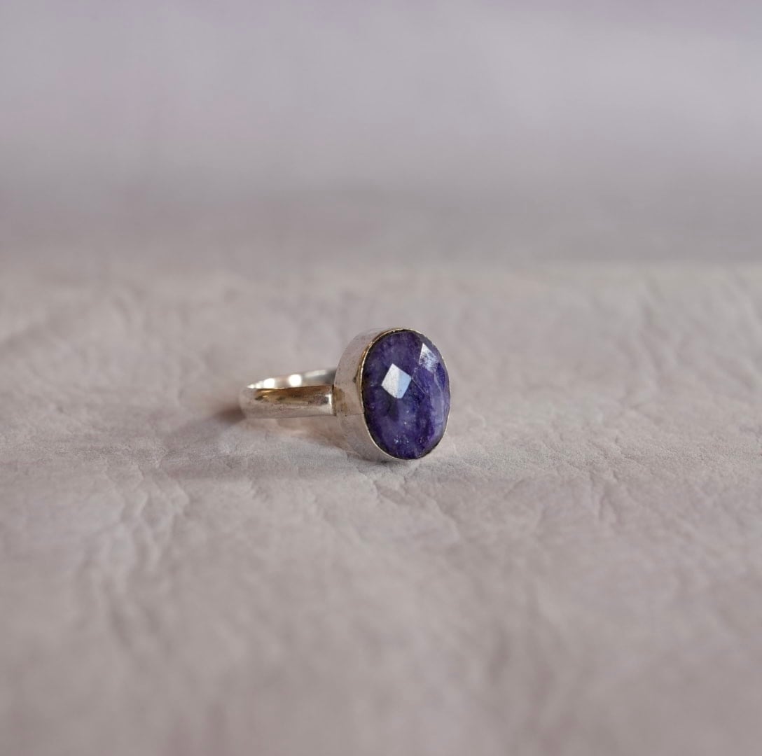 落ち着いたブルーのサファイア、原石をカットしたシンプルなリングです。