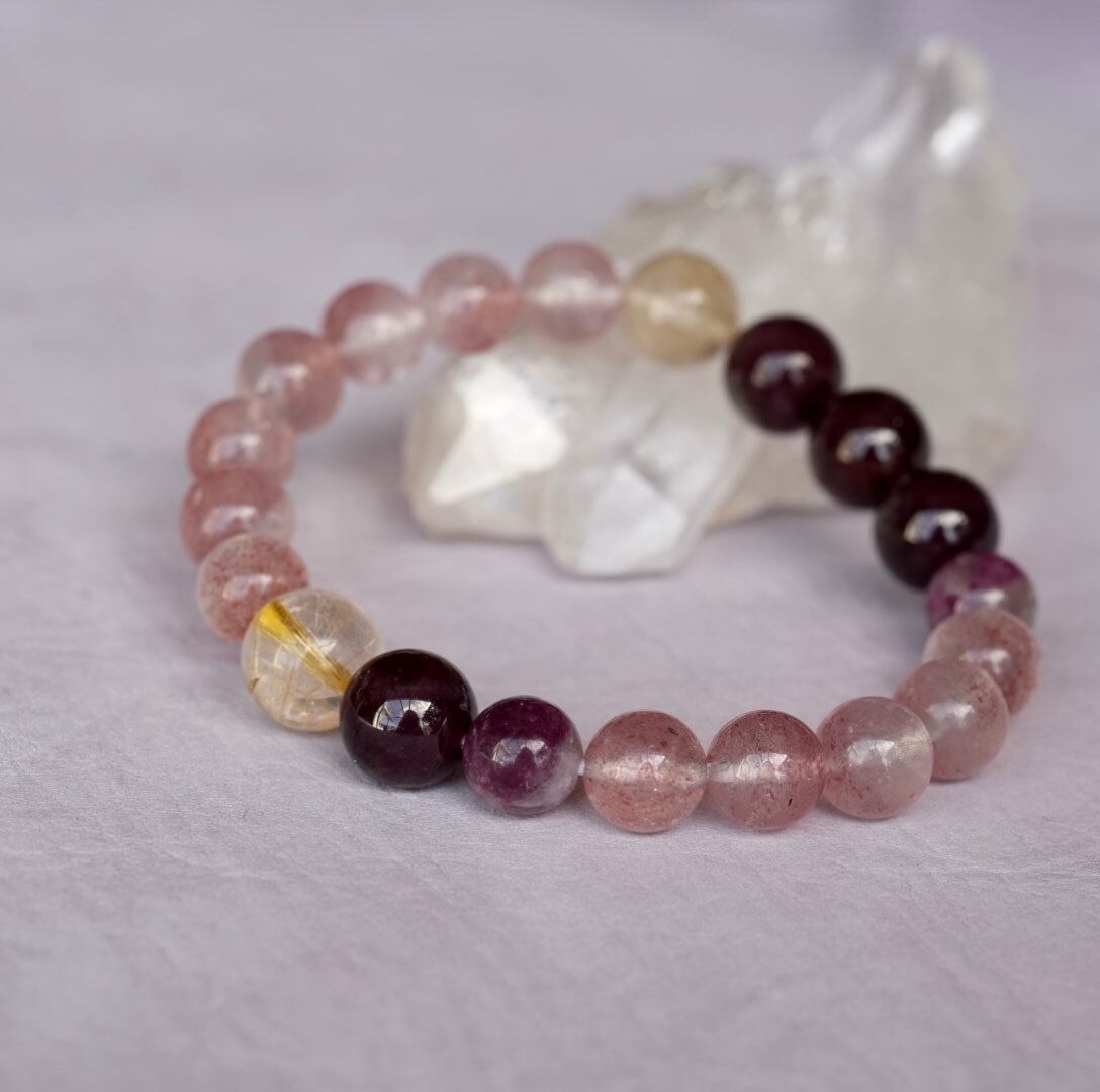 やわらかな透明感のあるピンク色のストロベリークォーツ。甘すぎないピンク色は肌馴染みが良く定番人気です。光をかざすと星がきらりと見える落ち着いた赤のスターガーネット、珍しいラズベリーカラーのピンクトルマリンシリカで奥行きのある絵画のように仕上がりました。ゴールドルチルクォーツを二粒加えてさらなる幸運呼び込みます。