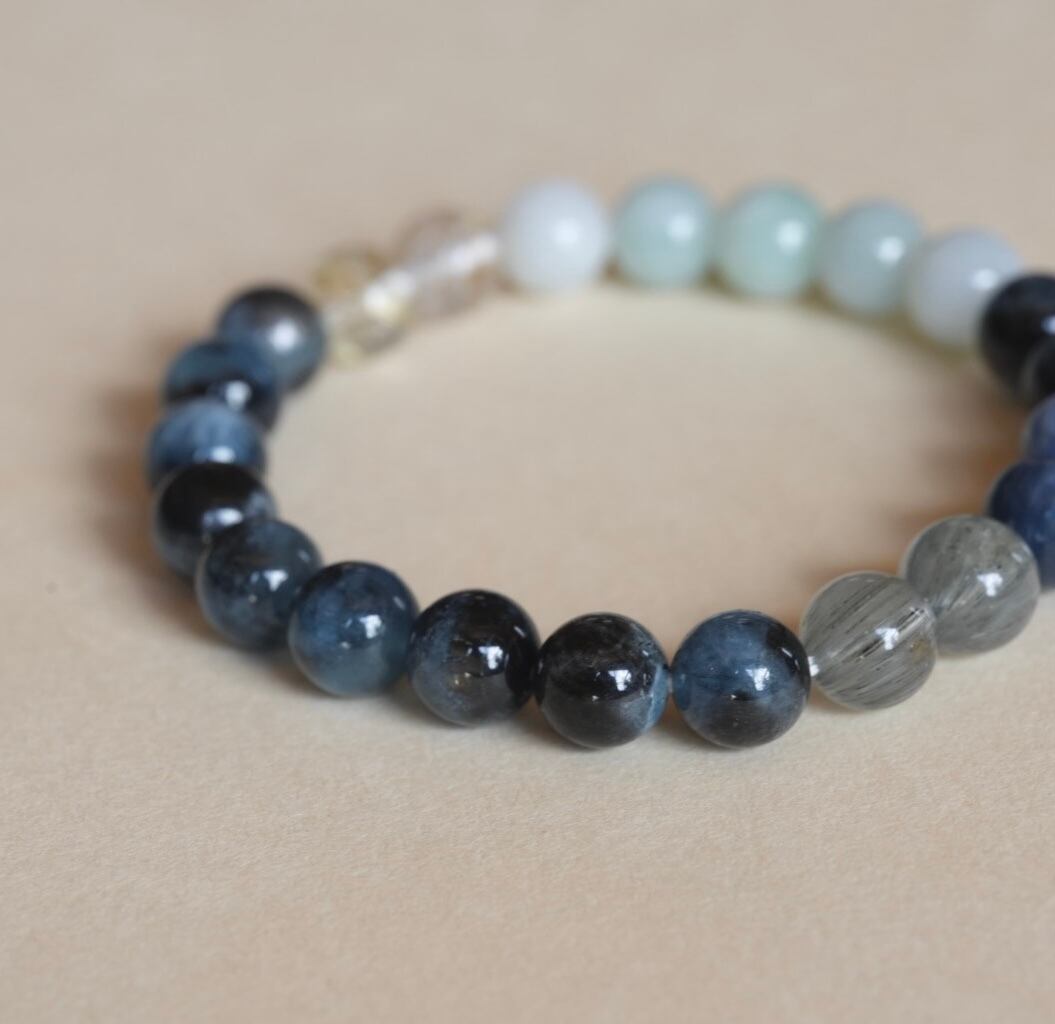 シックな藍色、とはいえ天然石ならではのシラーがあり、銀河系のようにも見える神秘的な石ー「ディープカラーアクアマリン」中国の古代の染付けの壺にありそうな色合いにも見えて来ます。翡翠、ブルールチル、ゴールドルチルクォーツで大人のシノワズリーブレスレットに仕上げてみました。