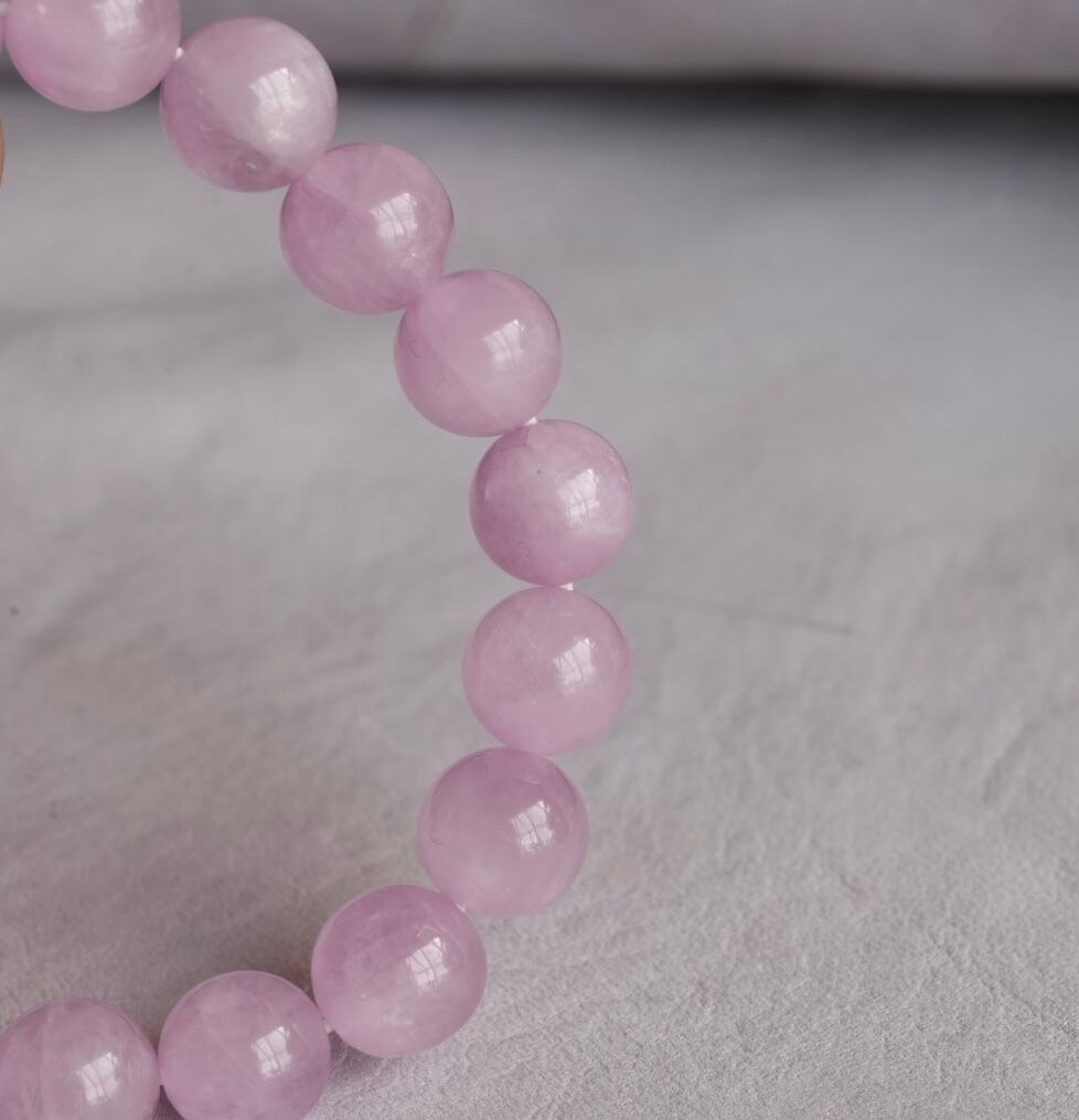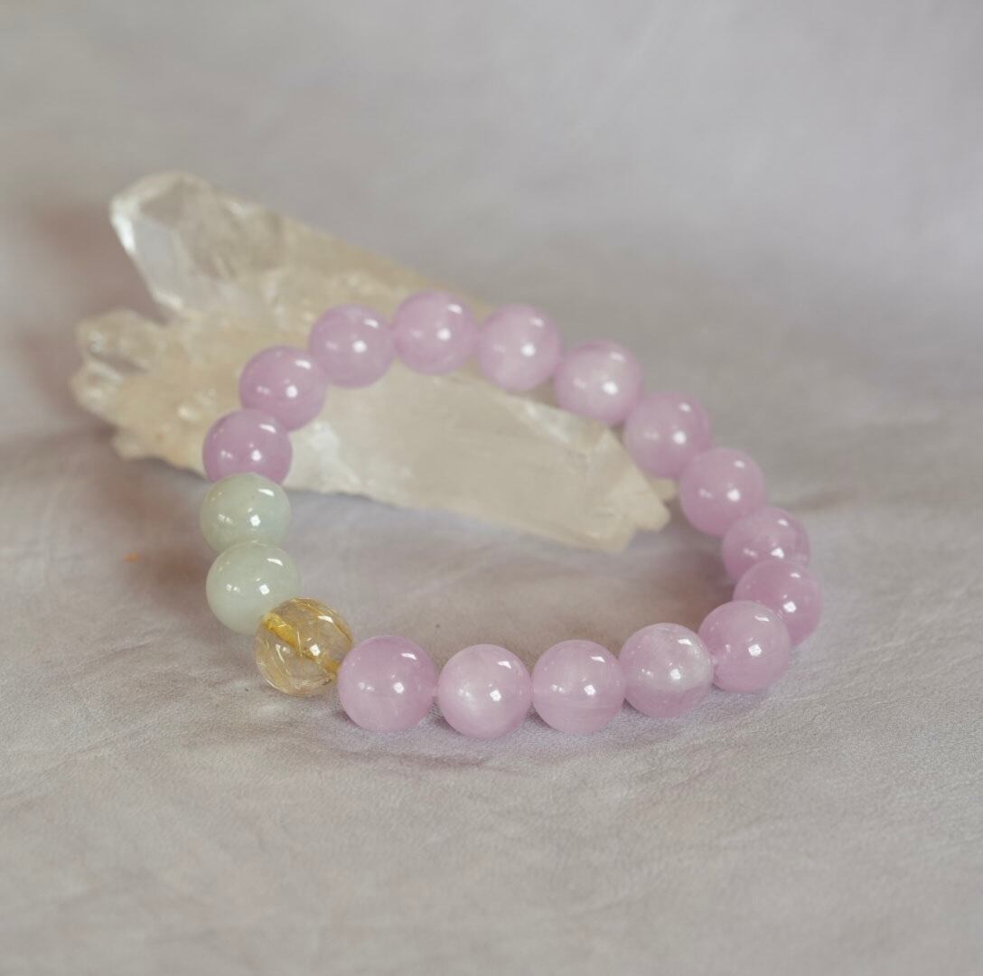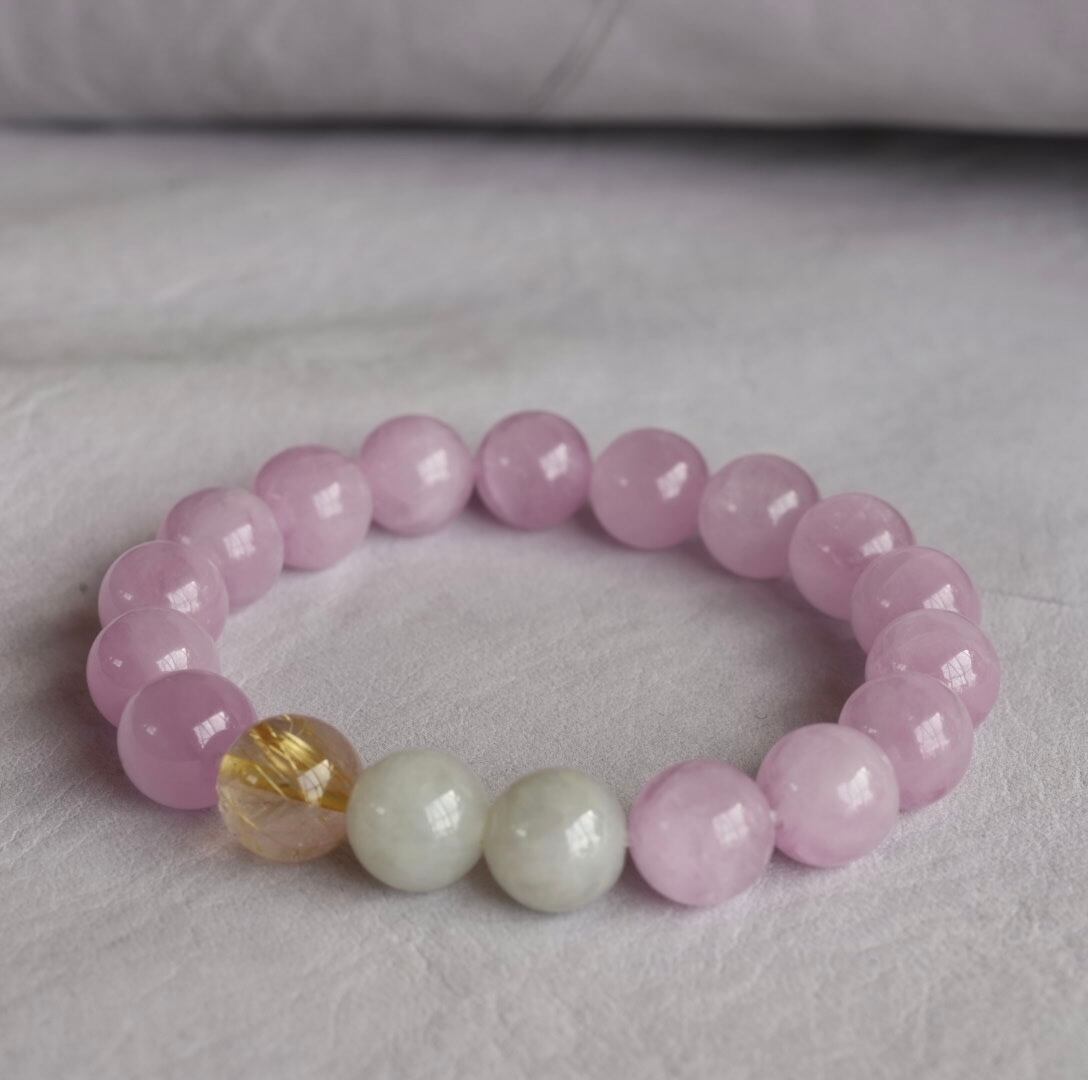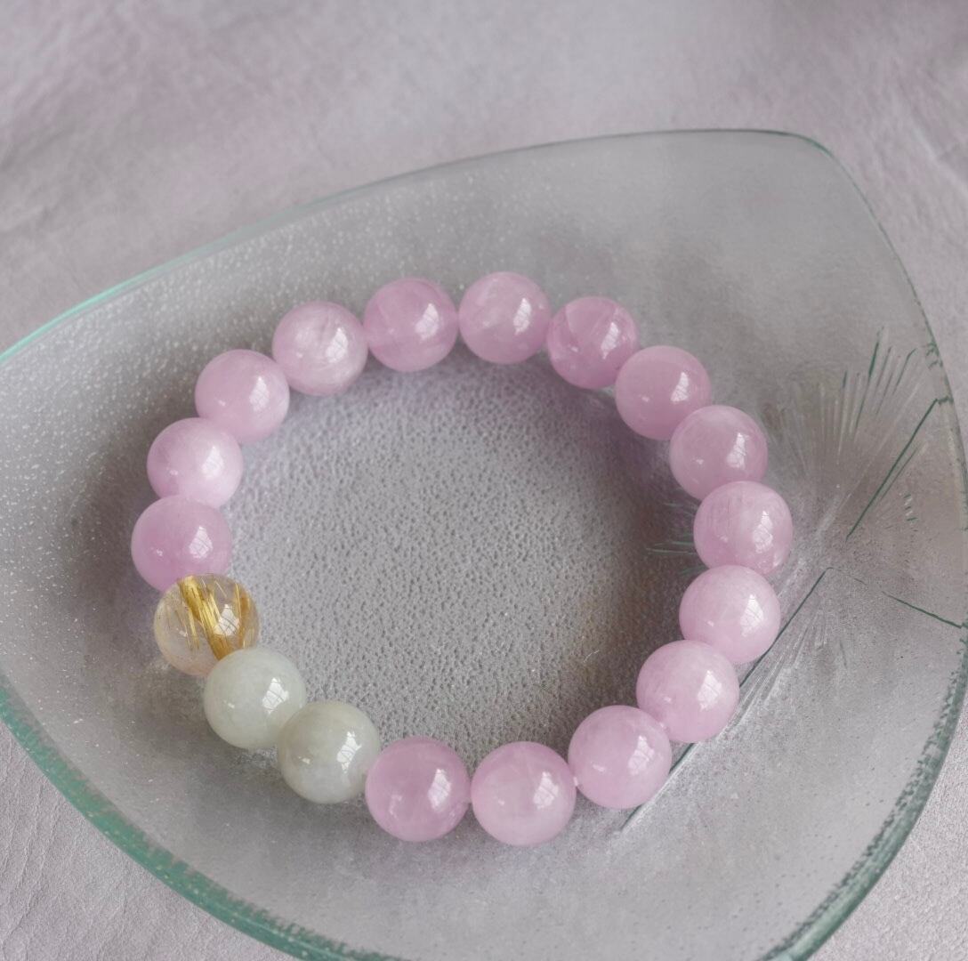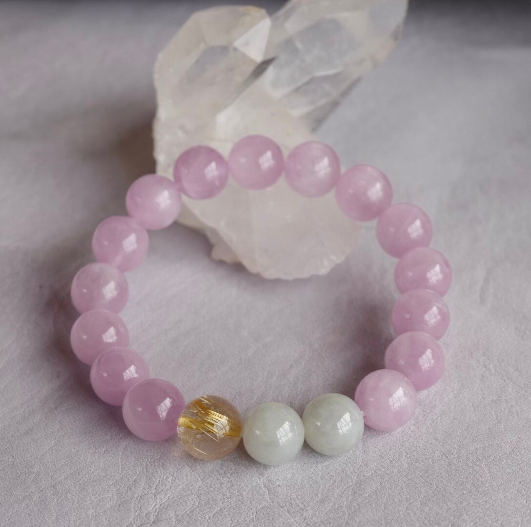 クンツァイトのうるうるとした艶感をしっかりと味わっていただけます。落ち着いた翠色のビルマ翡翠で程よい大人っぽさを加えています。透明感のあるゴールドルチルクォーツの煌めきは、さらに気持ちを華やかにしてくれそうです。うる艶の可愛いブレスレット、ずっと眺めていたくなります。