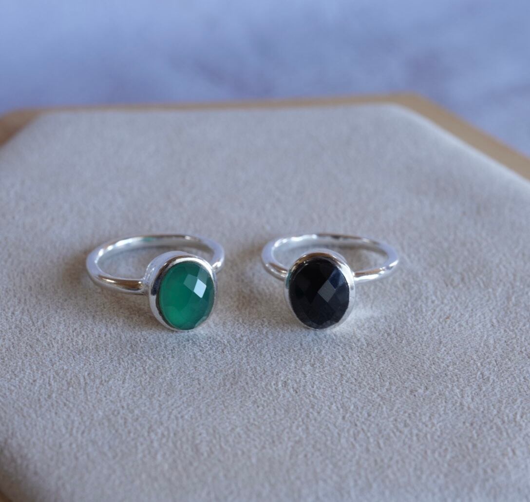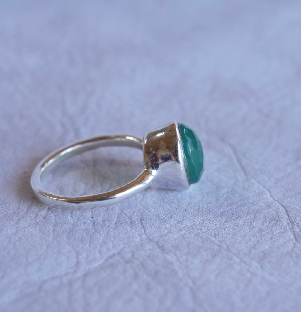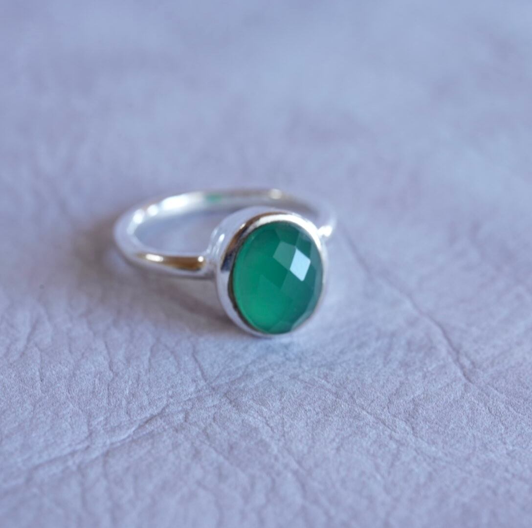 すっきりとしたシンプルなデザインの、グリーンオニキスのリングです。カットがほどこされているので、僅かに煌めきが見られるのも魅力です。