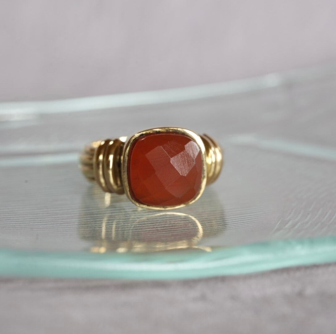 スクエアデザインがレトロな瑪瑙のリングです。カットがほどこされているので、煌めきも見られて華やかさが感じられます。