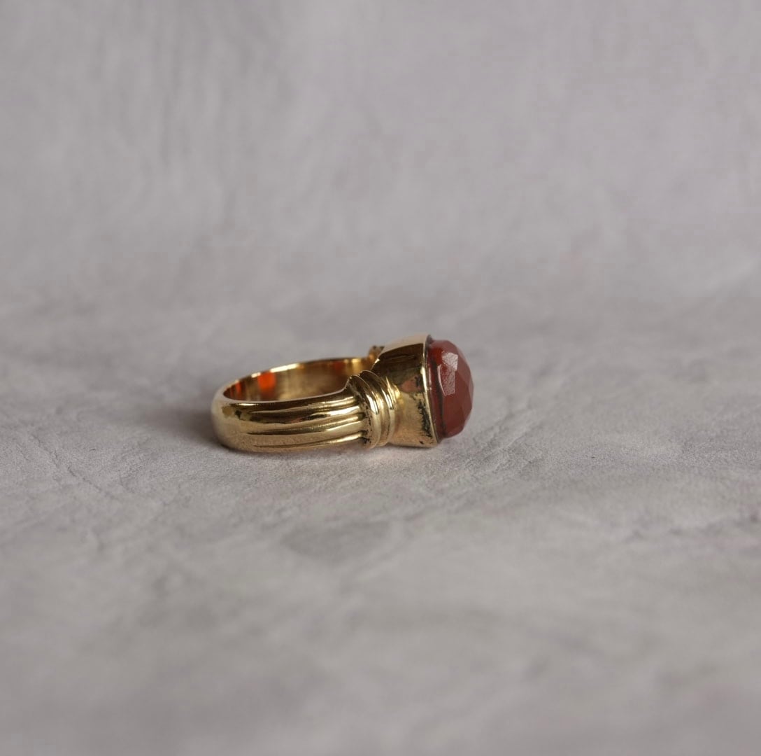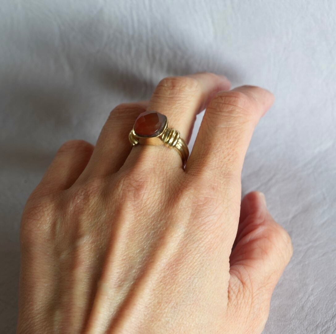 落ち着いた煉瓦色の瑪瑙らしい色合いです。リング部分のゴールドカラーが、瑪瑙の色合いを引き立たせています。