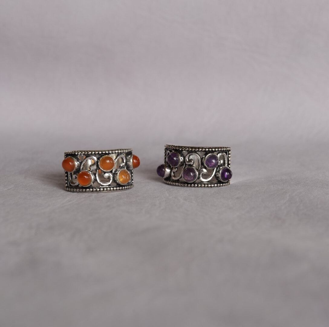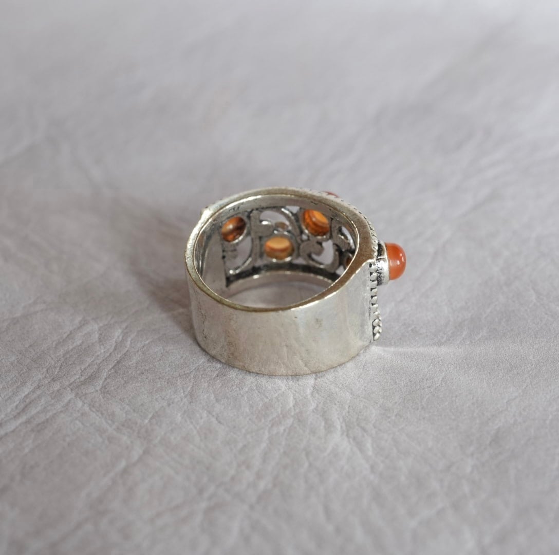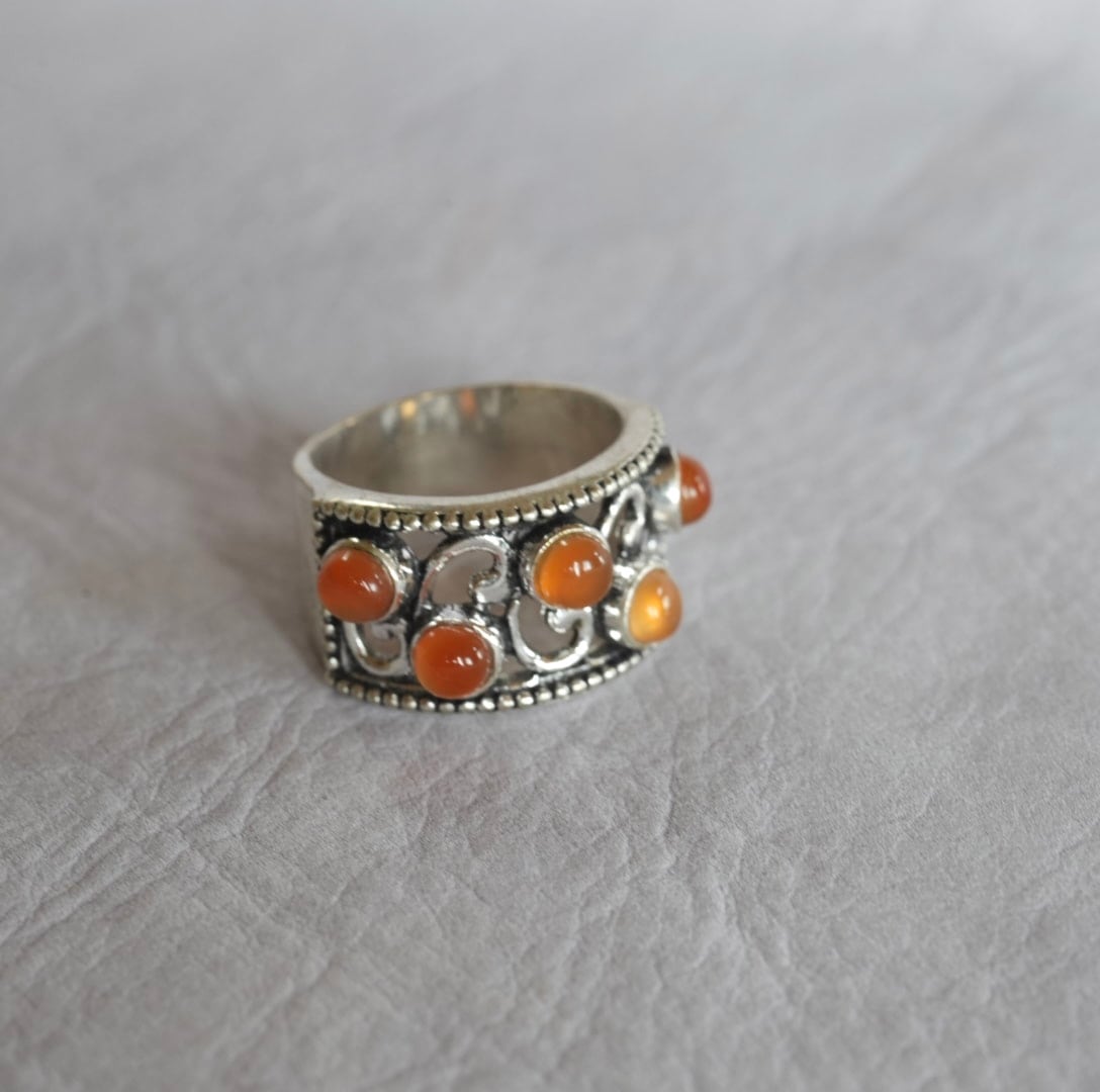 小さな瑪瑙が5つ並び、エキゾチックにデザインされたリングです。着けると存在感があり、凛としたかっこいい雰囲気になります。シンプルな装いのお供にぜひ。