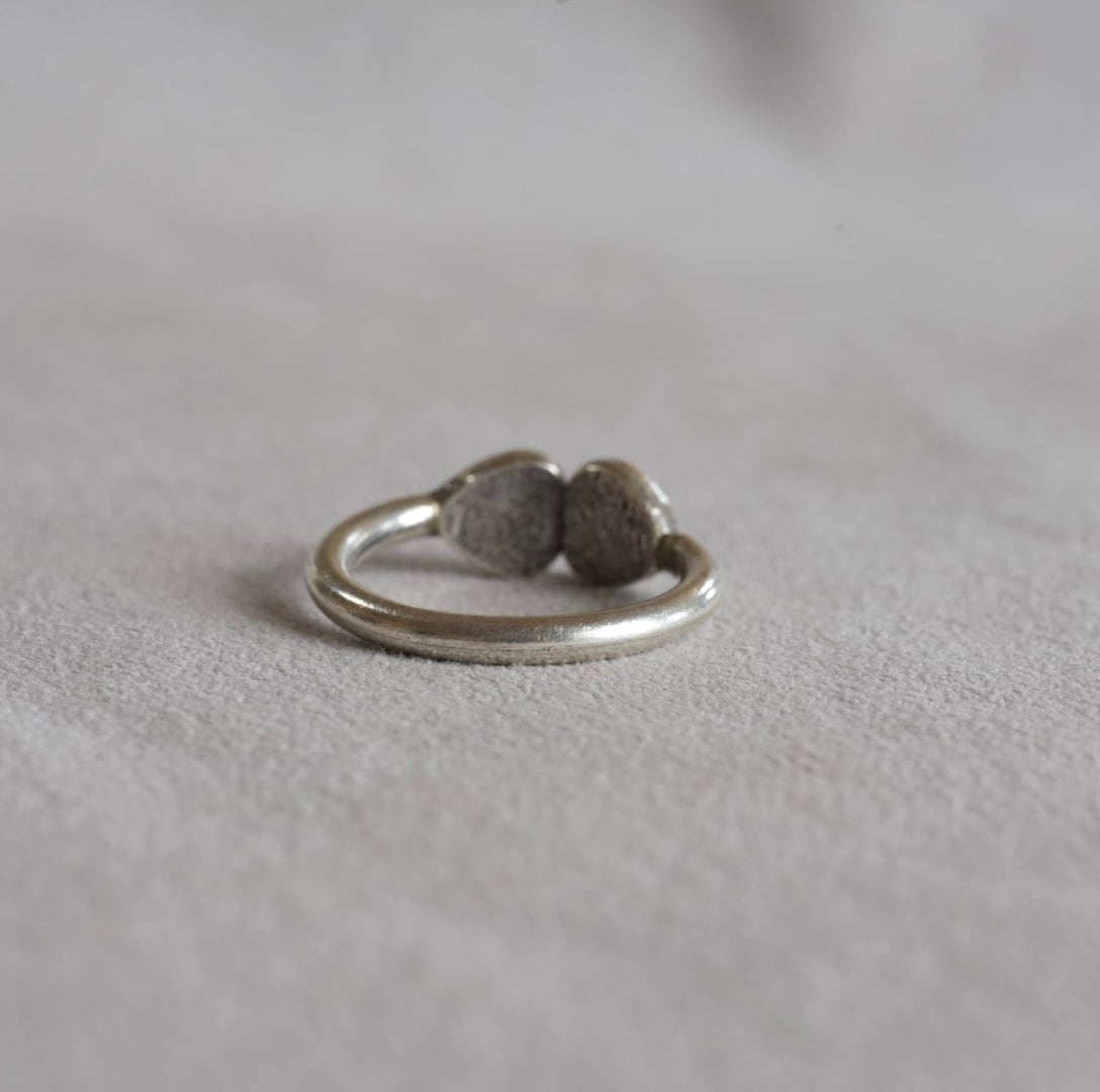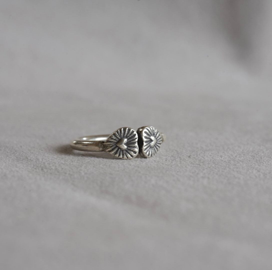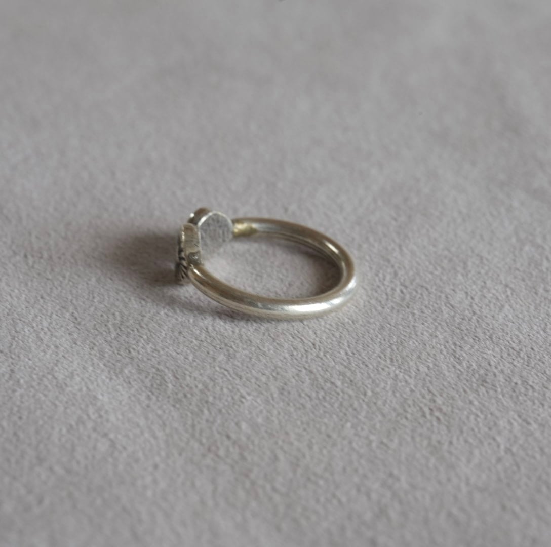 こちらはハートを二つ繋ぎ合わせたようなデザインです。控えめなデザインながらも、カレンシルバーの存在感を放っています。サイズは真ん中を