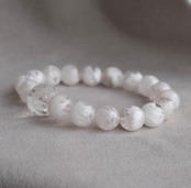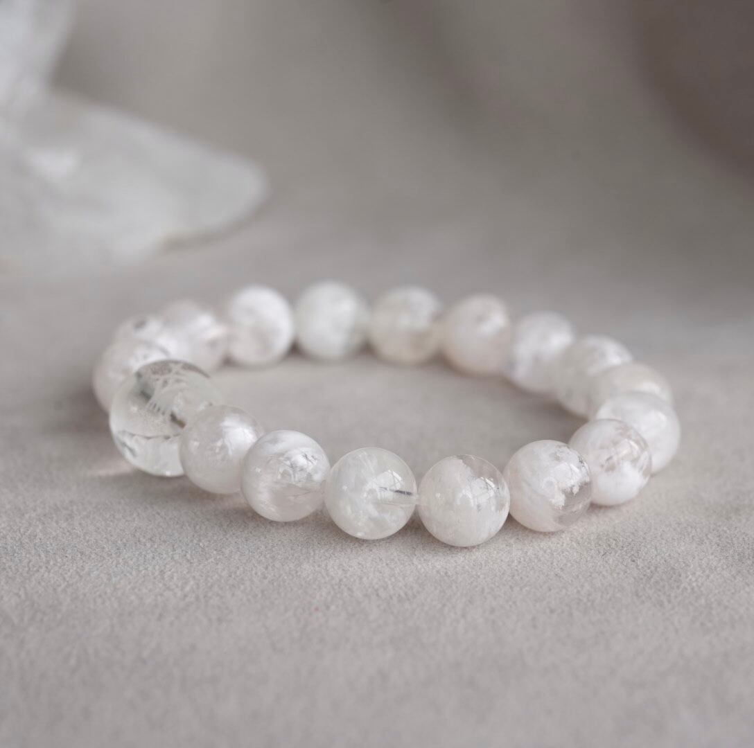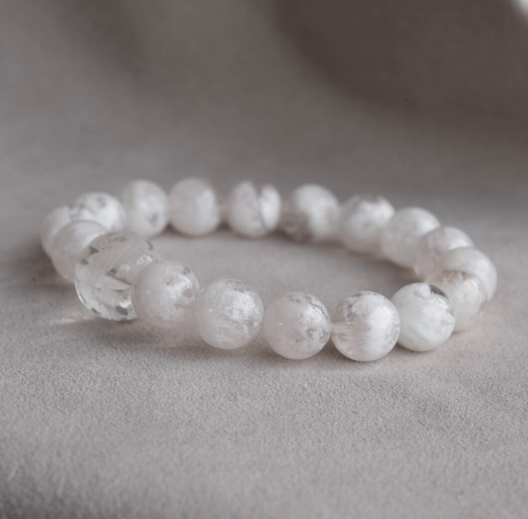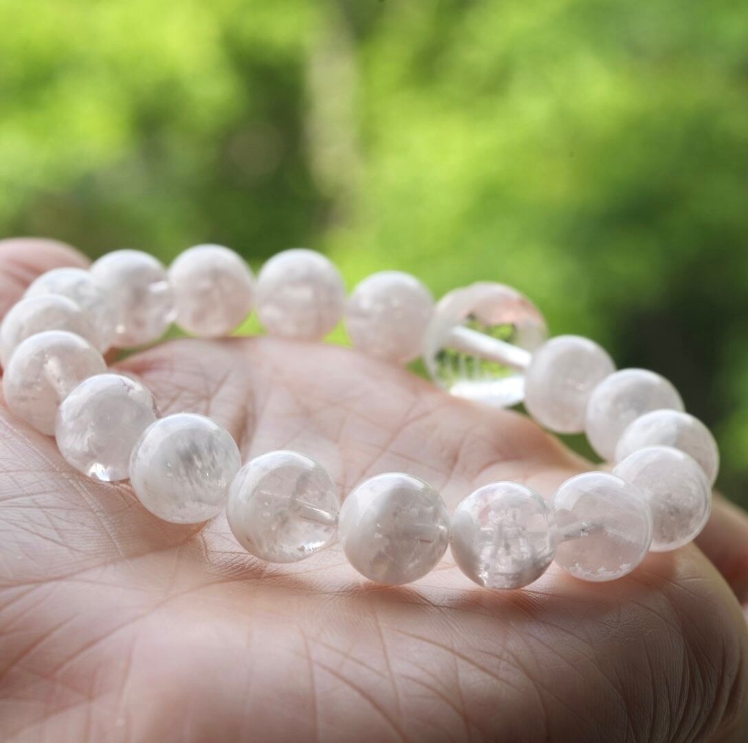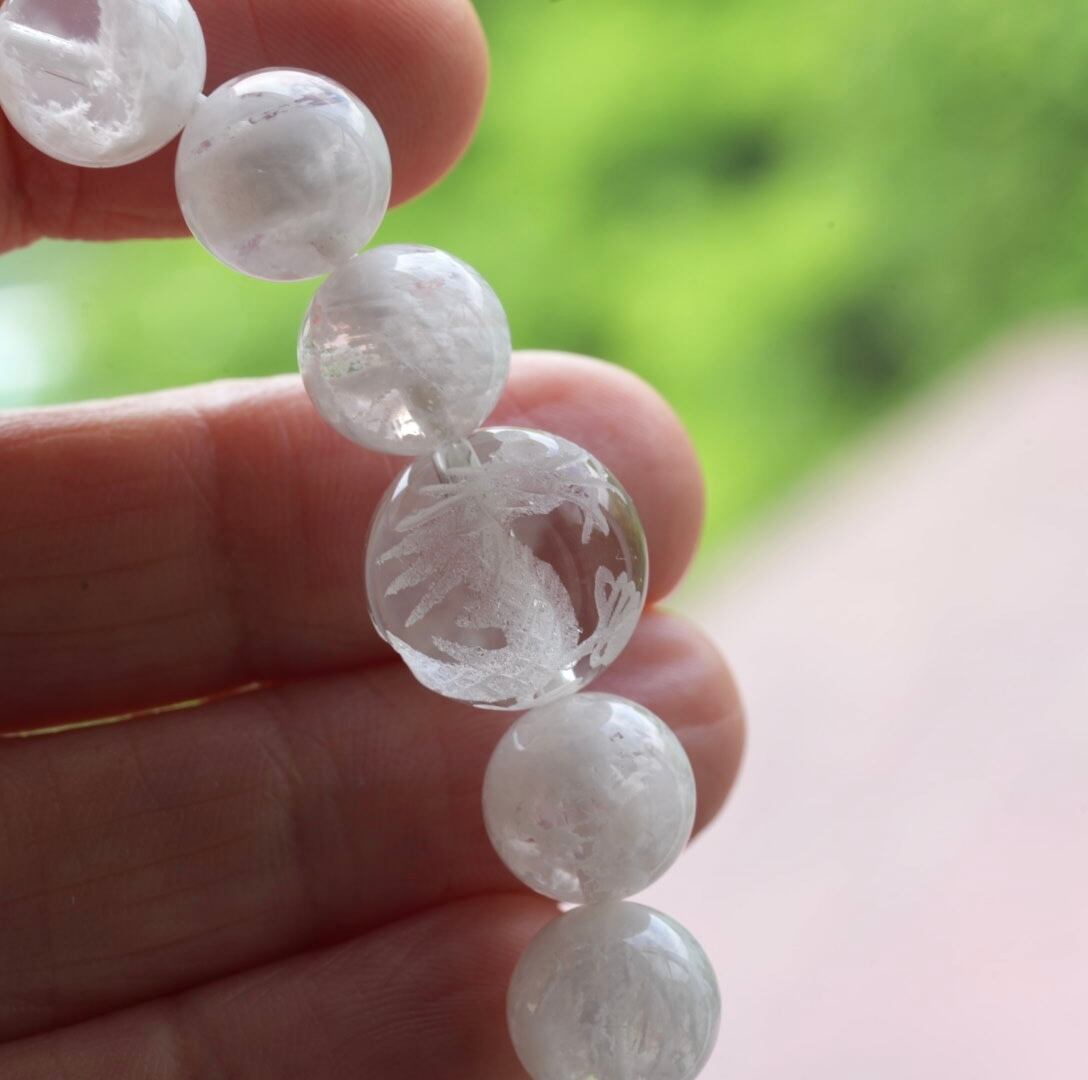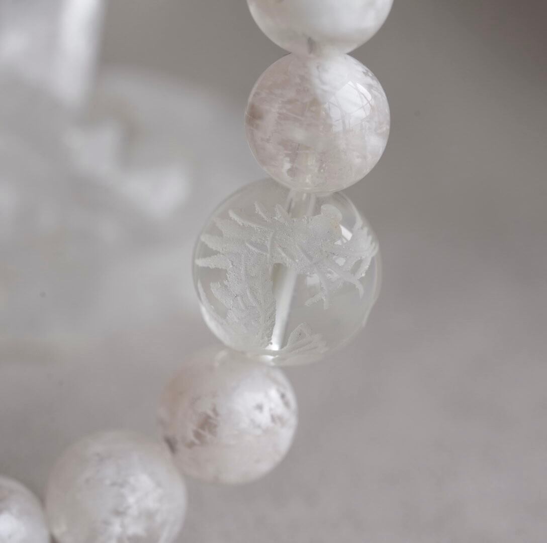広がるホワイトガーデンクォーツのブレスレットです。水晶の中に、白色の内包物が含まれることで生まれる幻想的で芸術的な天然石です。ふわりとした深雪のような石、つららのように見える石などあり、ずっと眺めていたくなります。