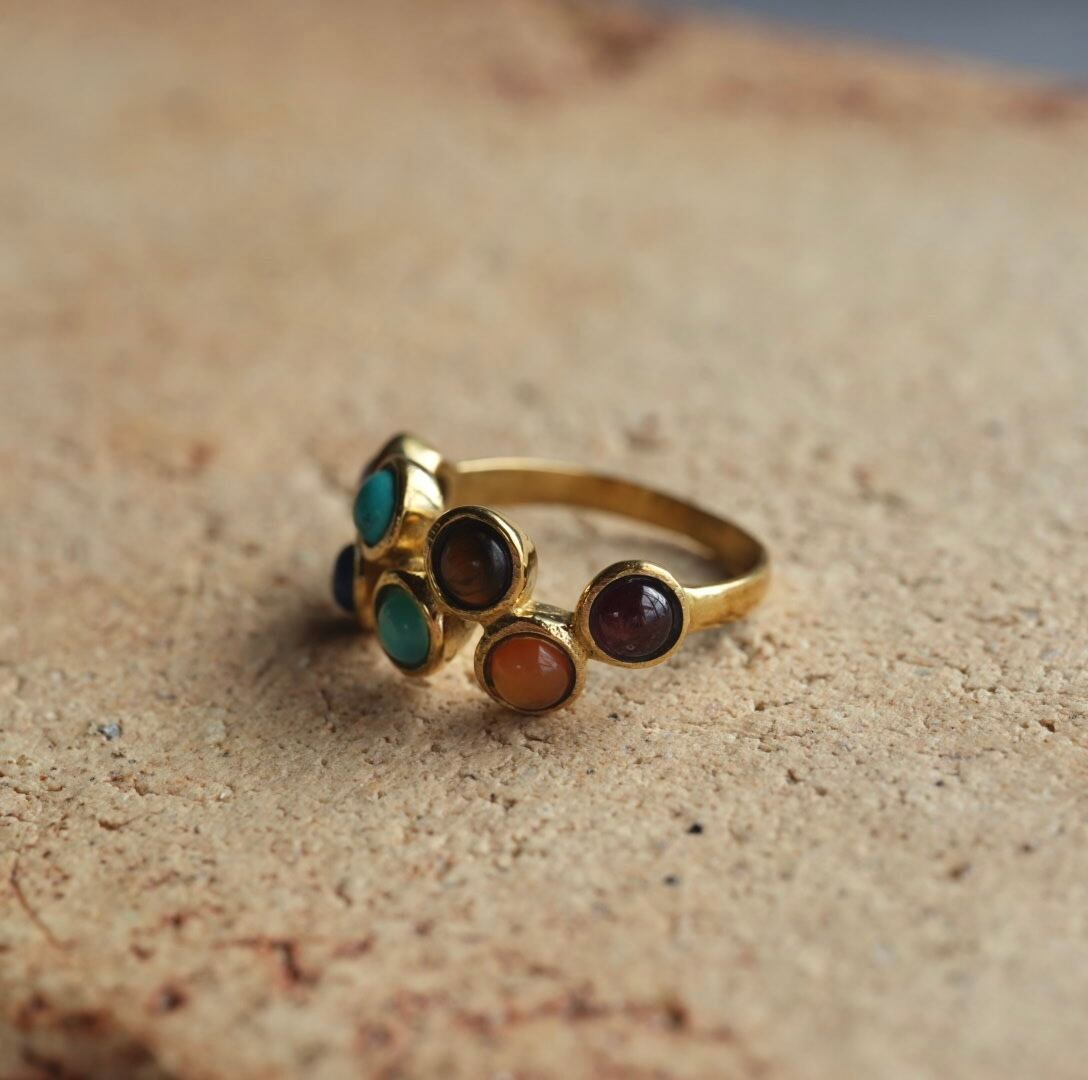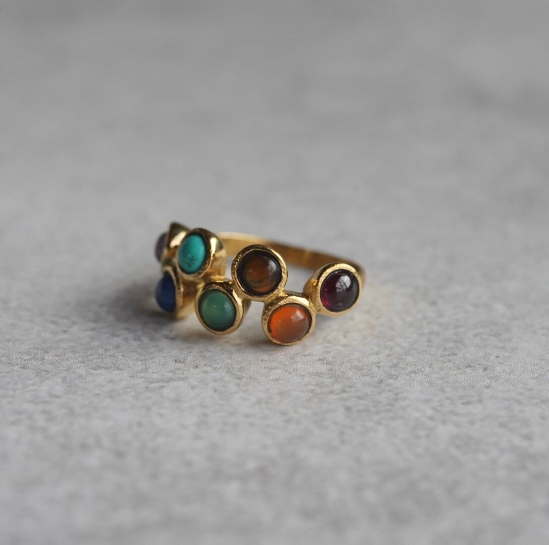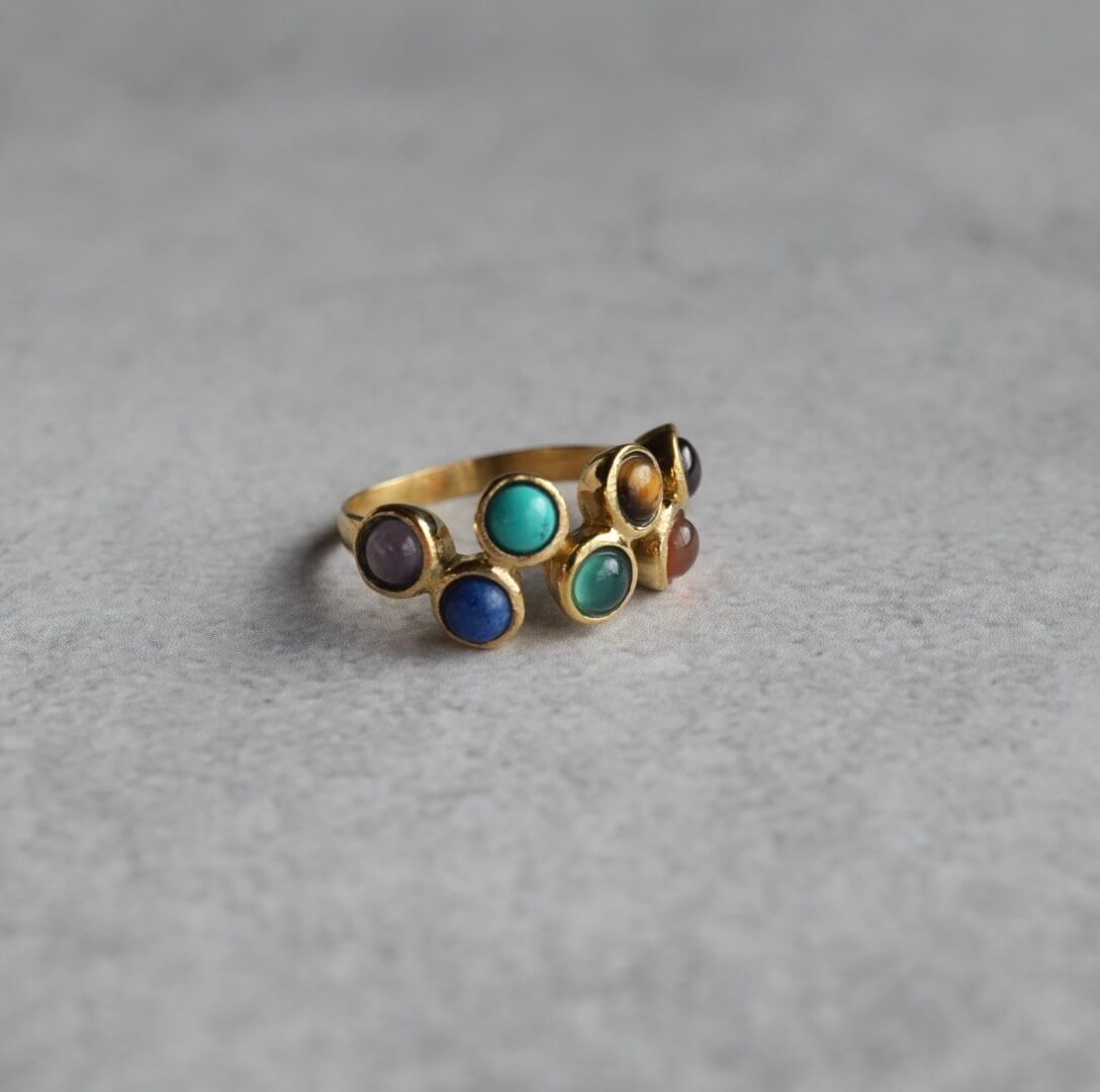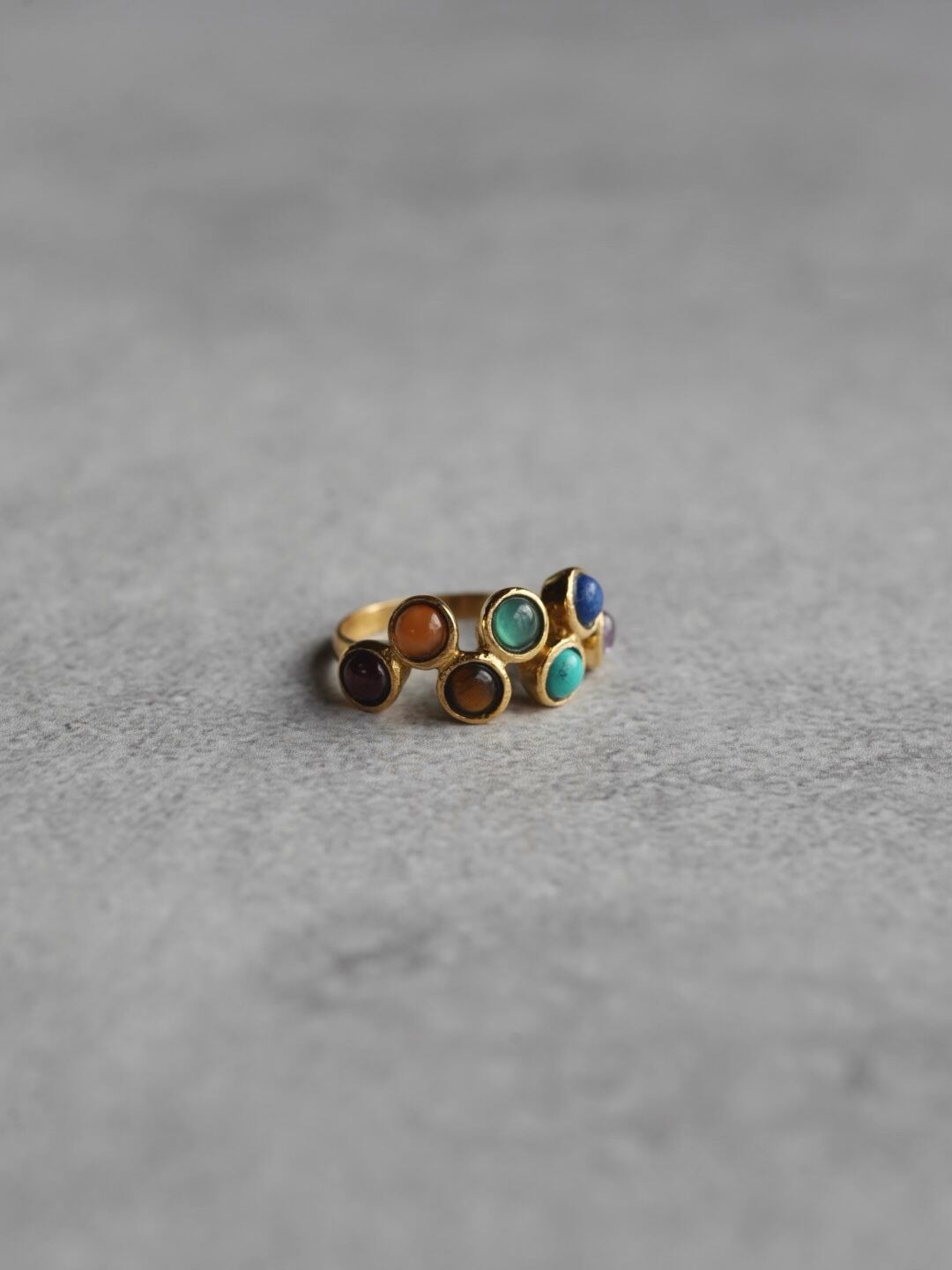 7種類の小さな丸い天然石が並んだリング、付けるとたちまち手元が華やかになります。