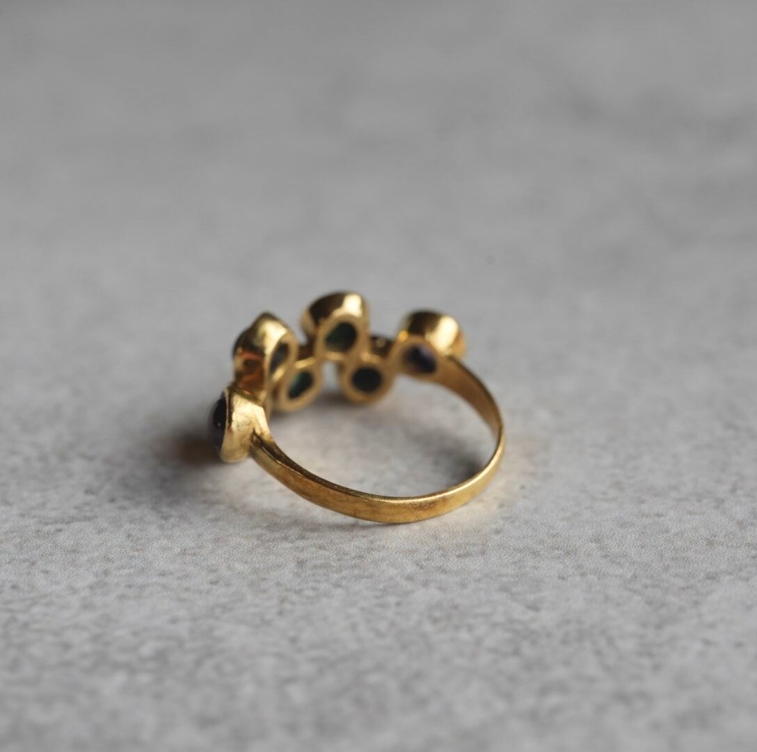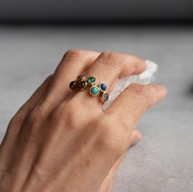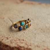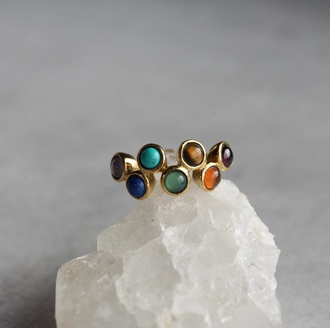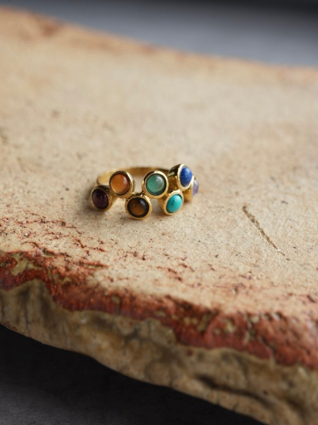 7種類の小さな丸い天然石が並んだリング、付けるとたちまち手元が華やかになります。