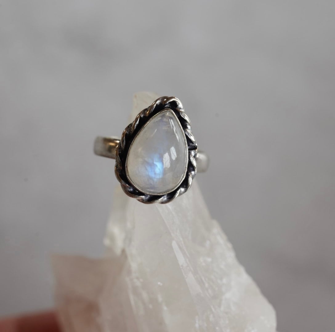 揺れる星屑を閉じ込めたような、神秘的な輝きが魅力的なムーンストーンリング。大ぶりのドロップ形が手元を華やかに彩ります。