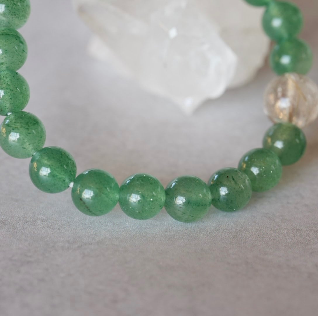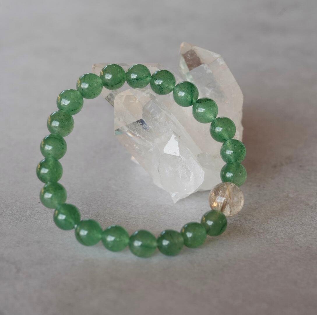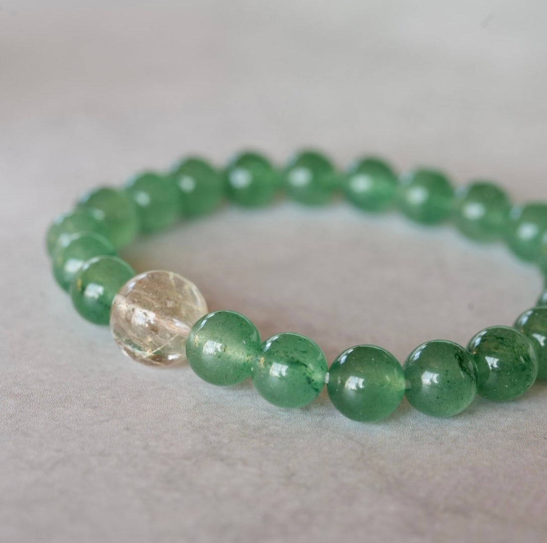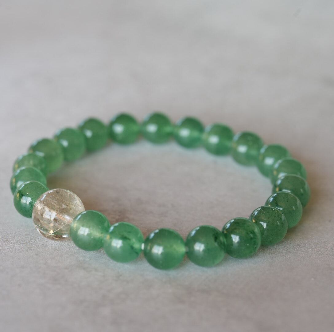 華やかな明るい緑色が目を引くグリーンストロベリークォーツ、ところどころにある濃い緑色の粒々がアクセントになっています。煌めきの美しいゴールドルチルクォーツを合わせて、金運アップもお願いしています。眺めているだけで心が穏やかになれそうなブレスレットです。