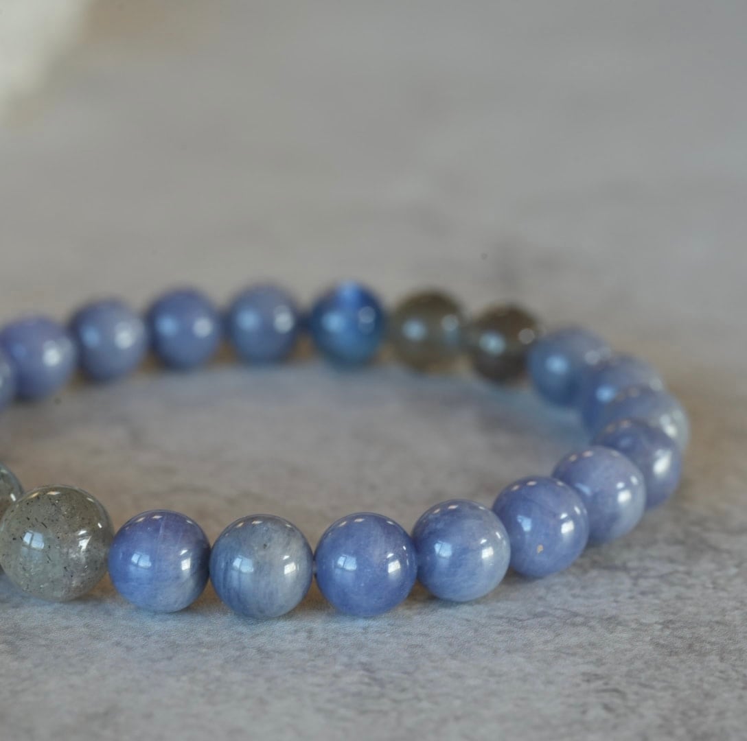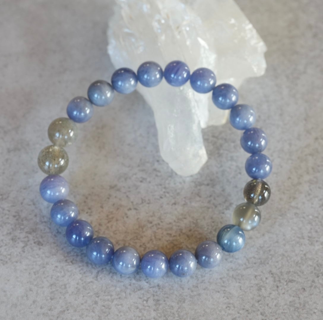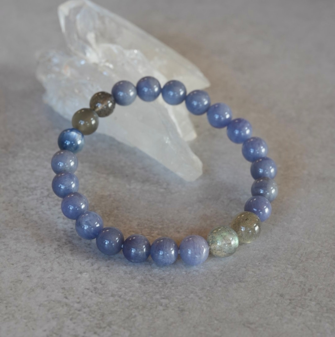 「タンザニアの石」を意味するタンザナイト。落ち着いたシックな青紫に、グレー系の色味が混ざったような色合いです。グレー系のラブラドライト、シルバームーンストーンを合わせて全体にほんの少し抑揚をつけてみました。肌馴染みがよく、身につけるととても落ち着くブレスレットです。