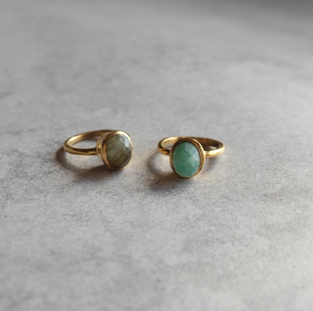 すっきりとしたシンプルなデザインの、アベンチュリンのリングです。カットがほどこされているので、僅かに煌めきが見られるのも魅力です。可愛らしい明るいグリーンのアベンチュリン、大きすぎず、小さすぎずの程よいサイズです。手元を華やかに演出てくれます。