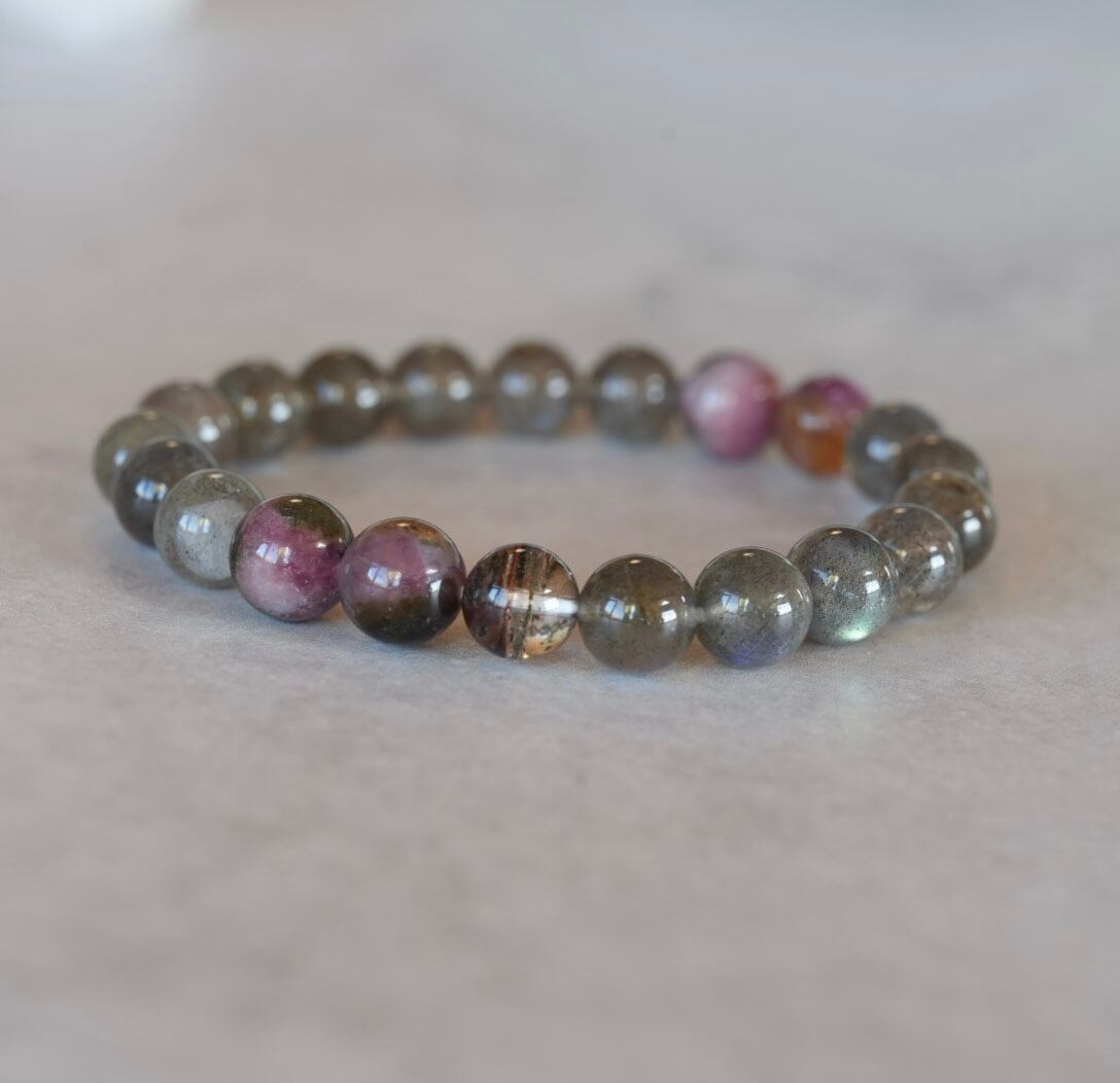 シックなグレーの中に、角度によって幻想的な青い輝きが見られるラブラドライト。今回再入荷分はしっかりとしたブルーのシラーや虹色の輝きが見られる上質な粒です。全体を少しまろやかにするバイカラートルマリンは、ピンク色に黒が混ざってまるで油絵の名画にありそうな石です。眺めていてると願いが叶いそうな魅力あふれる色合いのブレスレットに仕上がりました。