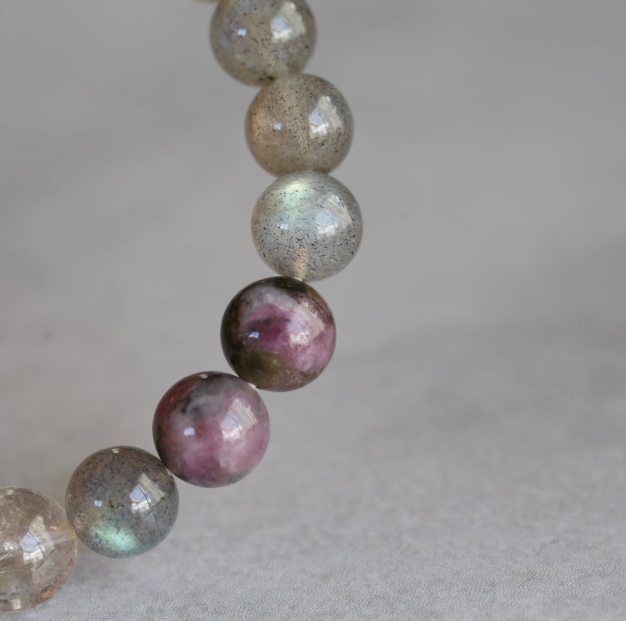 シックなグレーの中に、角度によって幻想的な青い輝きが見られるラブラドライト。今回は全体的にグレーが淡め、あまりにもダークな色目は得意ではない方にも取り入れやすい色目です。バイカラートルマリンは、ピンク色に黒が混ざって、まるで油絵の名画にありそうな石です。ゴールドルチルクォーツを合わせて、少し軽やかさを加えています。