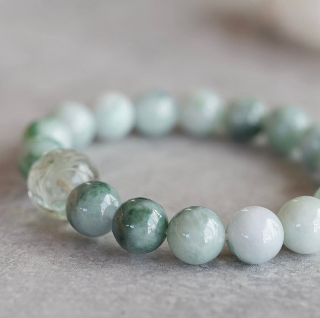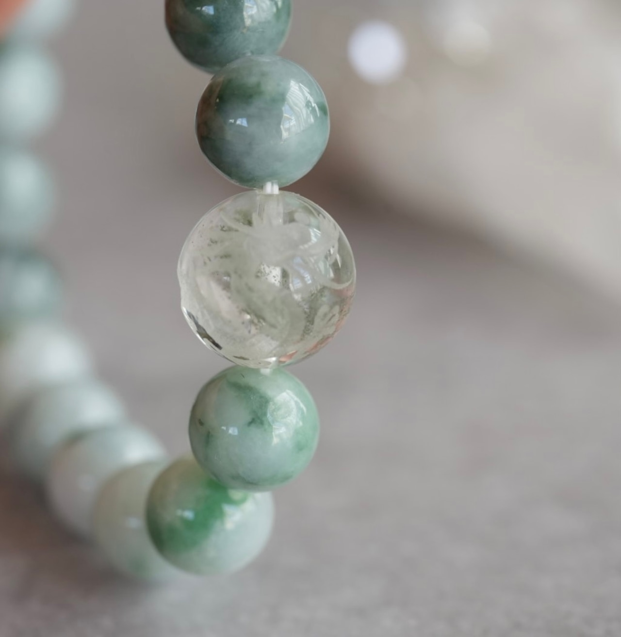 翠色をほんのり含む手彫りの龍のガーデン水晶で、さらに縁起の良いブレスレットになりました。