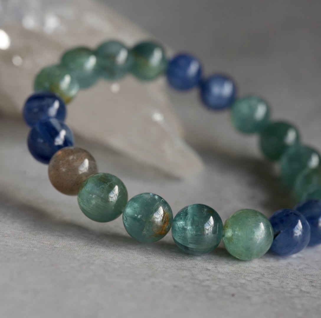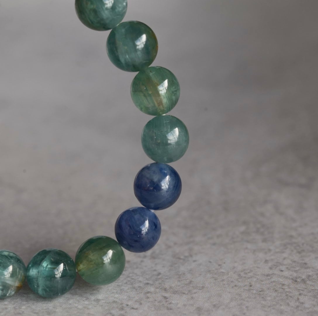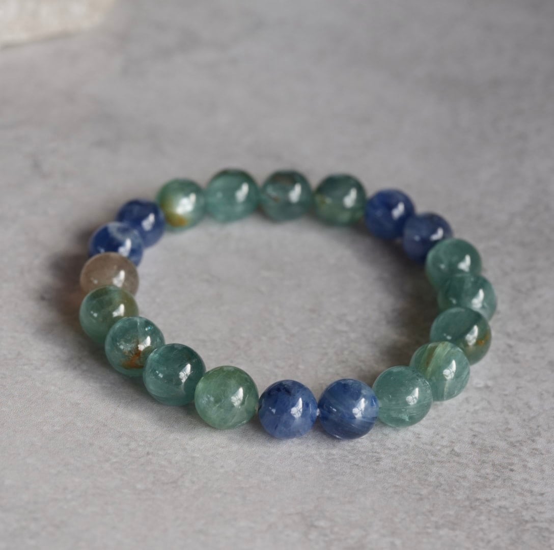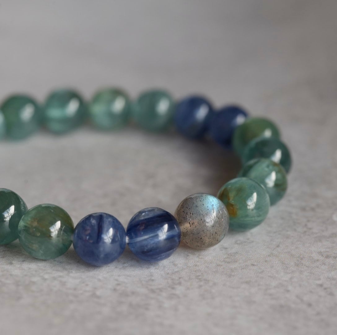 ブルーグリーンの色目です、とひとことでは言い表せない「グリーンカイヤナイトシリカ」グリーンの落ち着いた色合いに、透明感と艶が含まれるので、おとなしくなりすぎることが無い華やかさもある石です。光の加減で深い緑や明るくかわいらしい緑に見えるので、眺めていて飽きることがないですね。明るいブルーのカイヤナイトを合わせて、美しい海を眺めているような穏やかなブレスレットに仕上がりました。ラブラドライトを一粒加えて、さらに艶やかでずっと眺めていたくなるようなブレスレットに仕上げてみました。