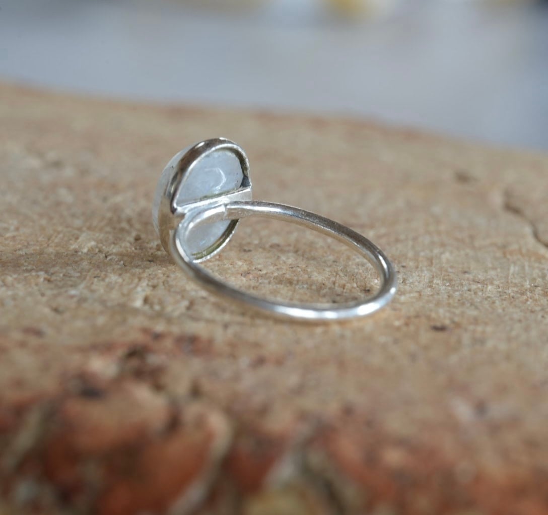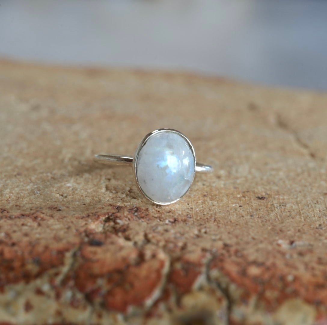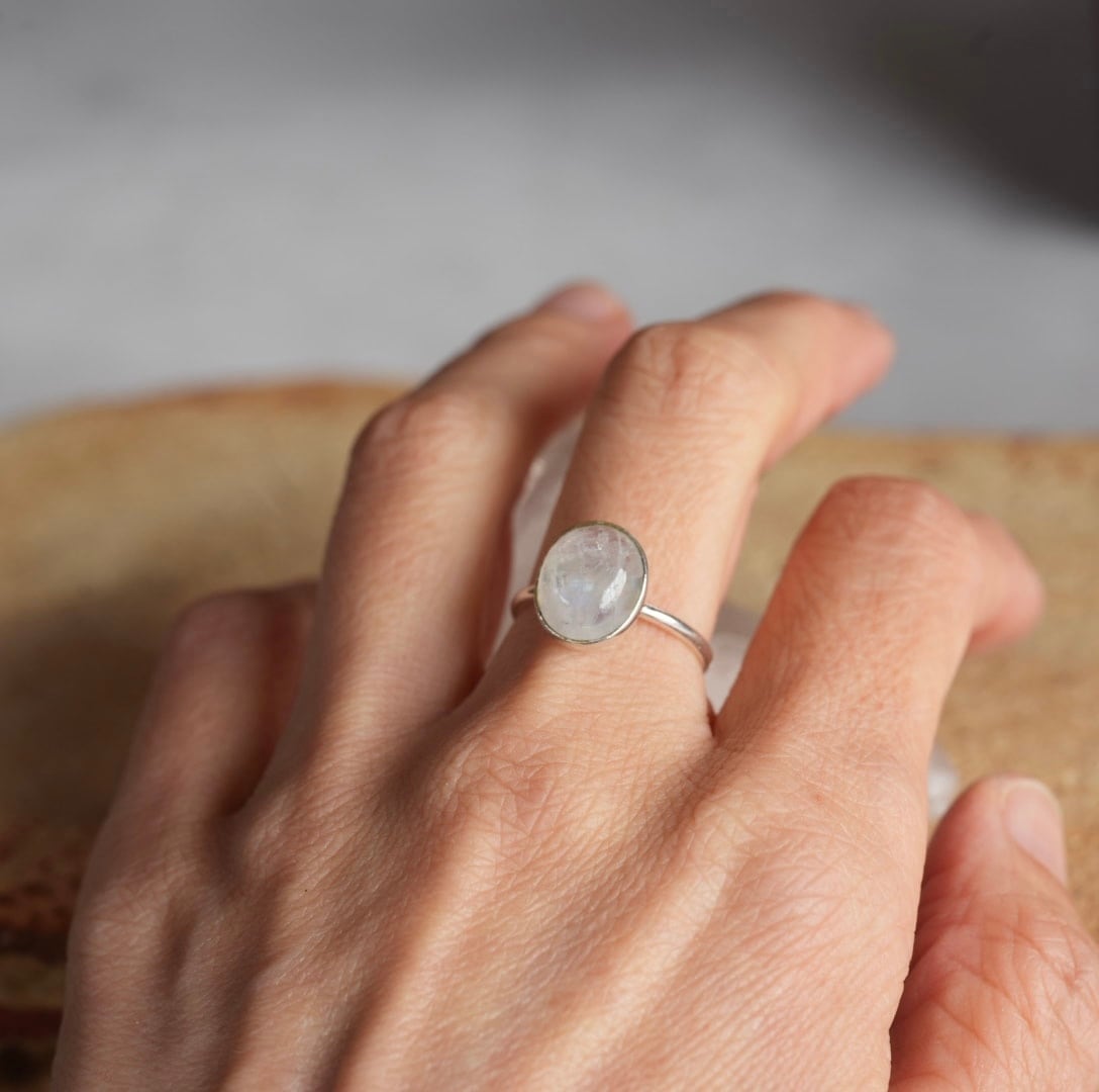 揺れる星屑を閉じ込めたような、神秘的な輝きが魅力的なムーンストーンリング。身につけやすいオーバルデザインで、角度によってブルーの輝きが見られます。いろいろな角度から異なる表情をお楽しみいただけます。