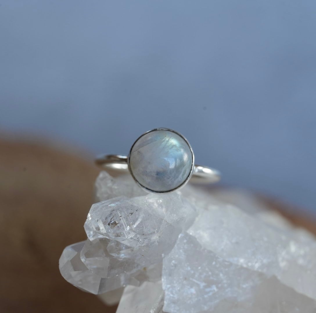 揺れる星屑を閉じ込めたような、神秘的な輝きが魅力的なムーンストーンリング。可愛らしい丸いデザインです。角度によって虹色の輝きが見られ、いろいろな角度から異なる表情をお楽しみいただけます。
