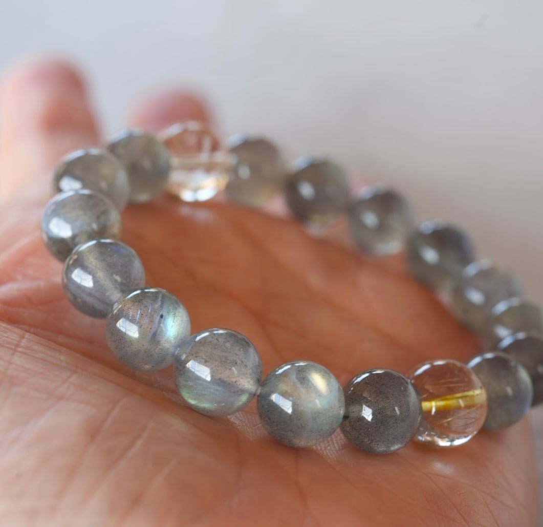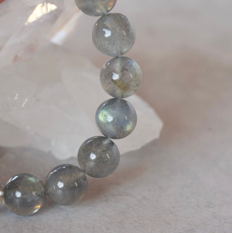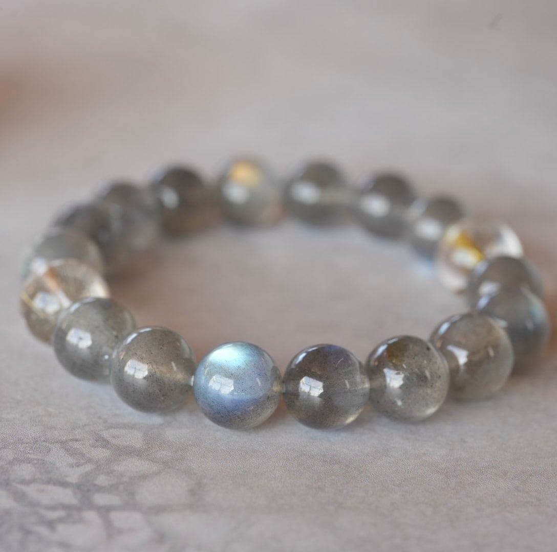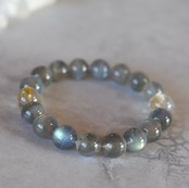虹色の輝きがたっぷり見られるラブラドライトのブレスレット、大粒の約10㎜サイズが入荷しました。一見するとグレーの地味色ですが、その内に秘めた美しさにはっとします。