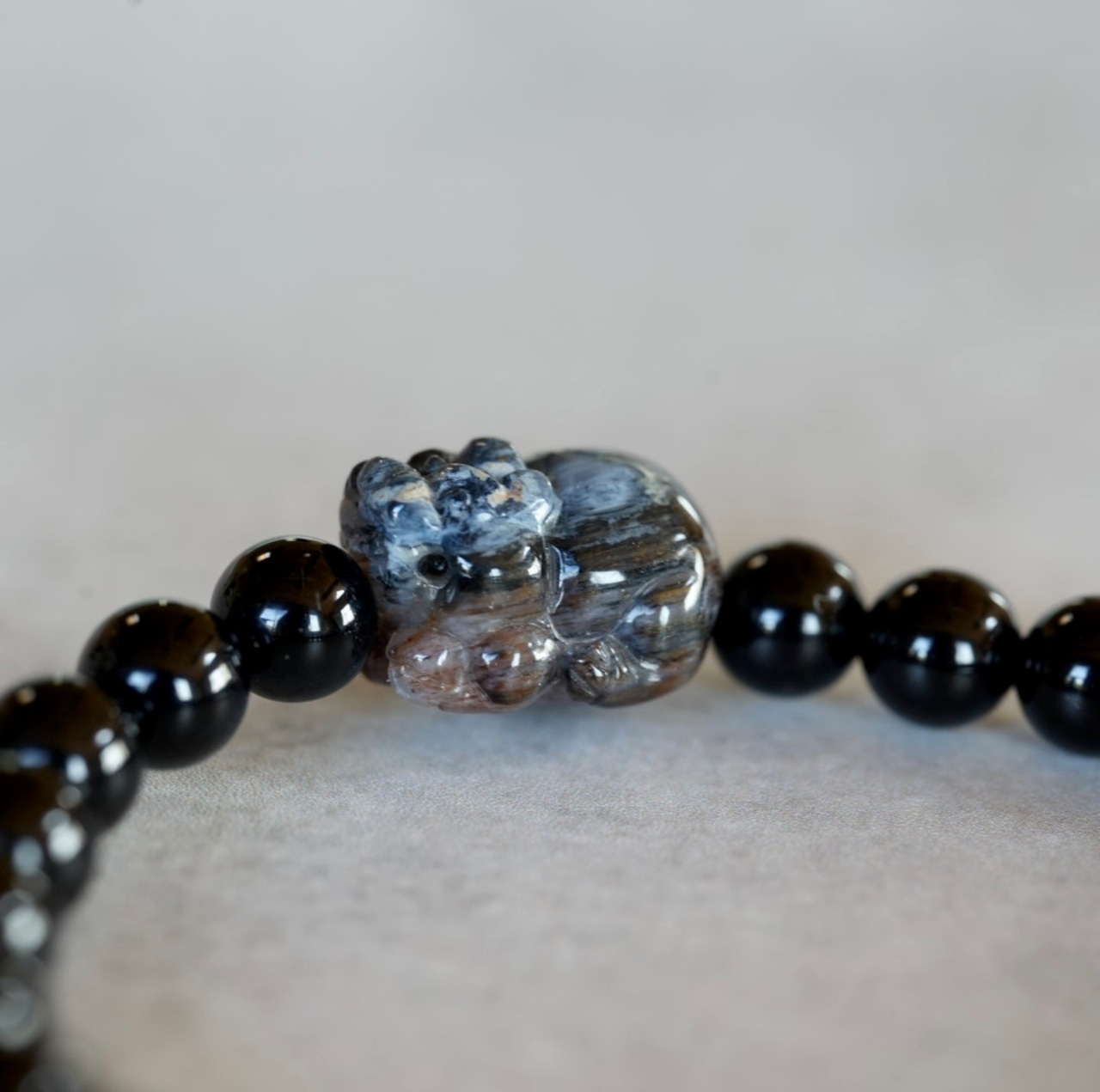 落ち着いたブルーとブラウンの色目が混ざり合ったピーターサイトの貔貅です。まるで油絵のような味のある色合いで、貔貅の形もぷっくりと愛らしくてずっと眺めていたくなります。ブラックのオニキスで全体をシックにまとめています。