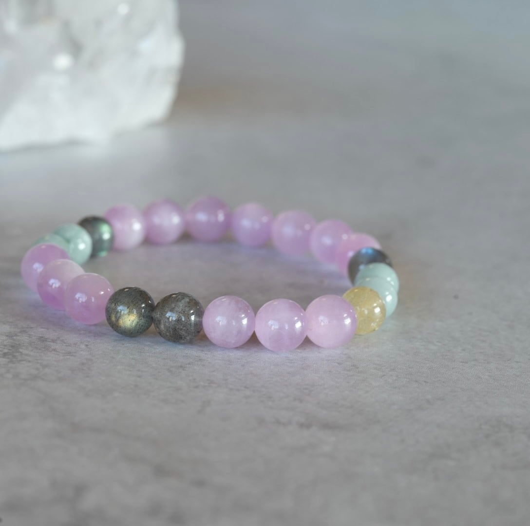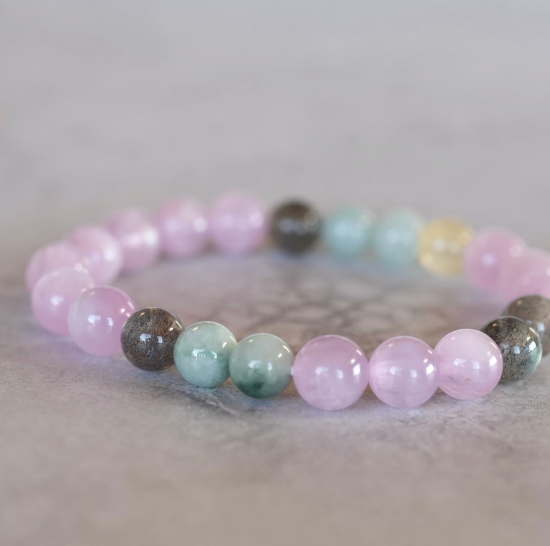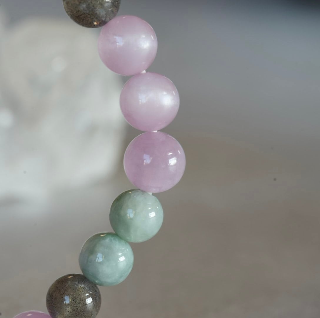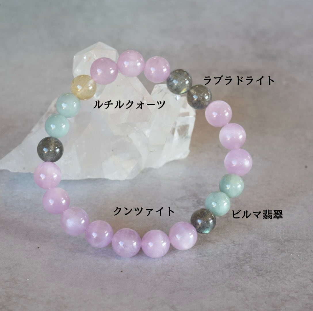 優しい翠色のビルマ翡翠、ゴールドルチル、ラブラドライトを加えて甘く可愛いだけではない大人の凛とした雰囲気のブレスレットに仕上げています。