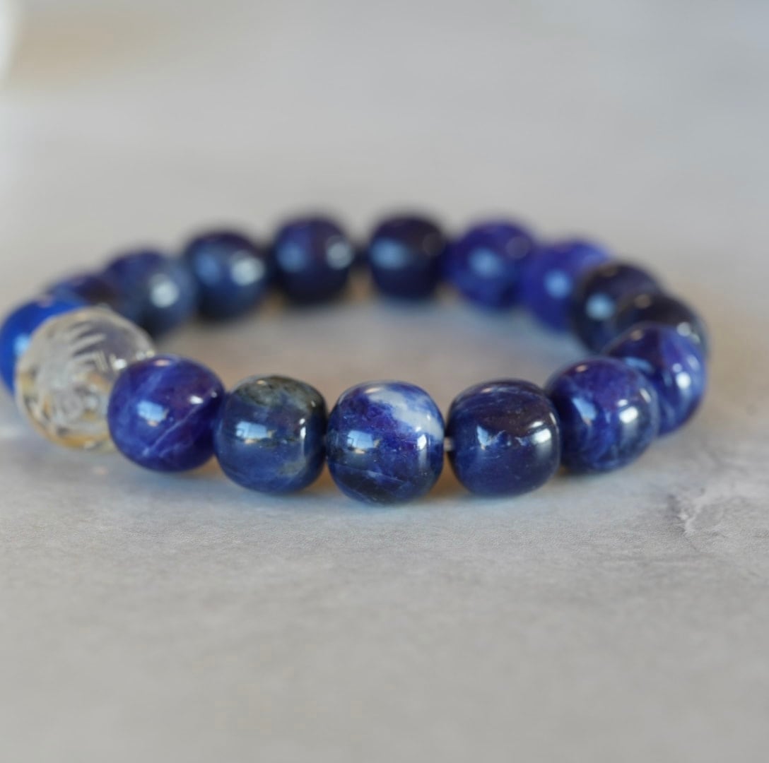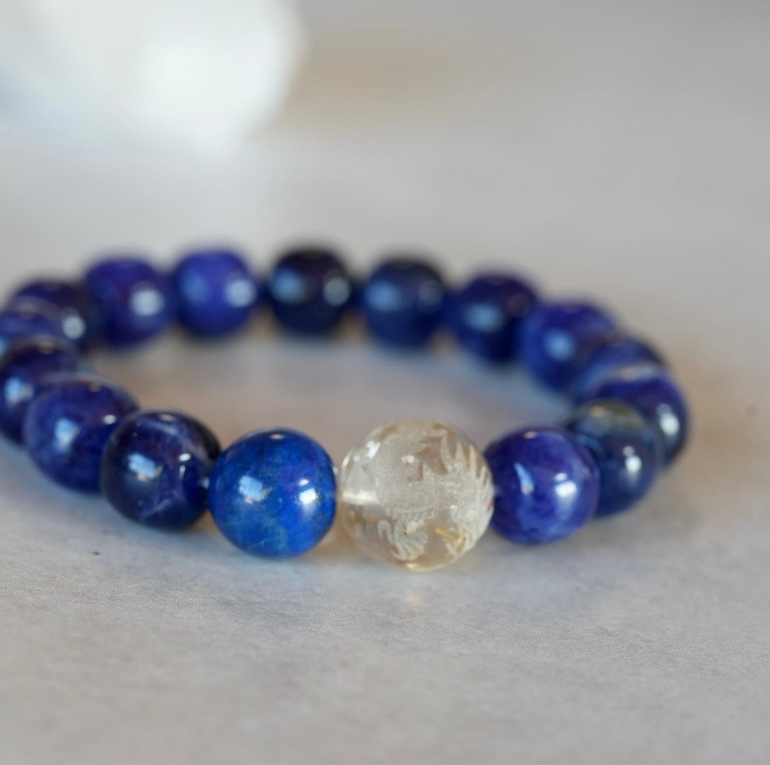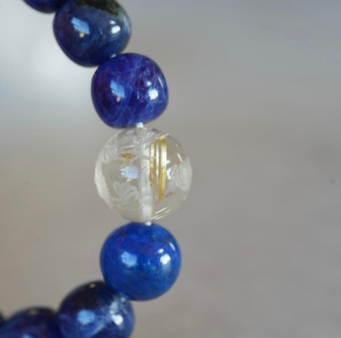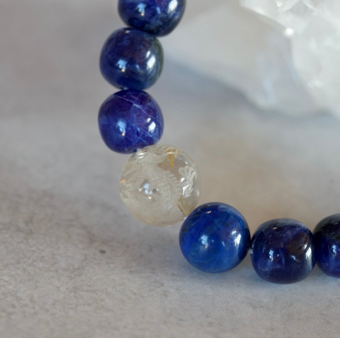 吸い込まれそうな深いブルーの色が美しいソーダライト。ブルーの中に時折見られるマーブル状の白がまるで銀河系のよう。瑠璃色のラピスラズリーを一粒合わせて、より神秘的に仕上げています。さらに手彫りの龍のゴールドルチルクォーツで煌めきをプラス。心躍る未来が待っている、そう思えそうなパワーのあるブレスレットになりました。