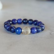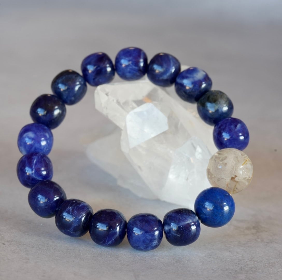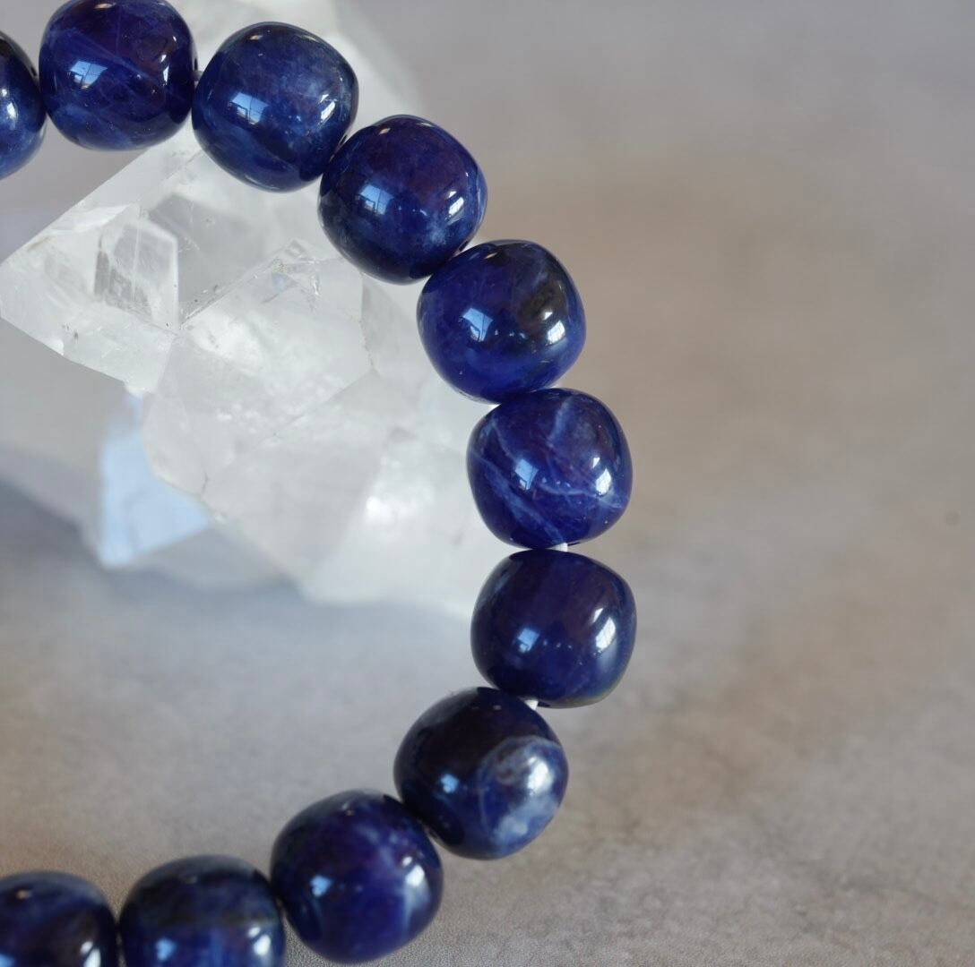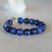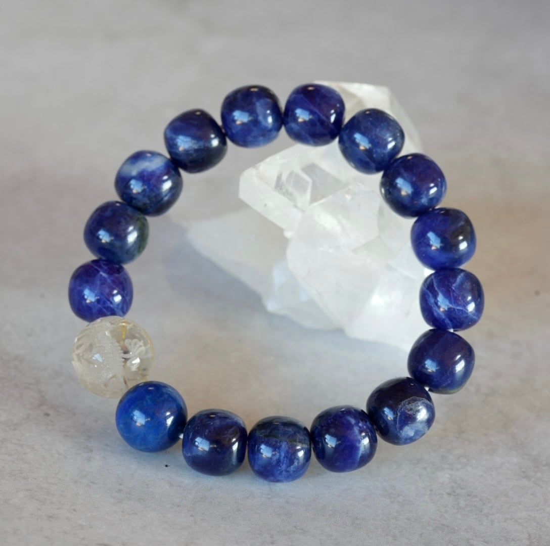 吸い込まれそうな深いブルーの色が美しいソーダライト。ブルーの中に時折見られるマーブル状の白がまるで銀河系のよう。瑠璃色のラピスラズリーを一粒合わせて、より神秘的に仕上げています。さらに手彫りの龍のゴールドルチルクォーツで煌めきをプラス。心躍る未来が待っている、そう思えそうなパワーのあるブレスレットになりました。