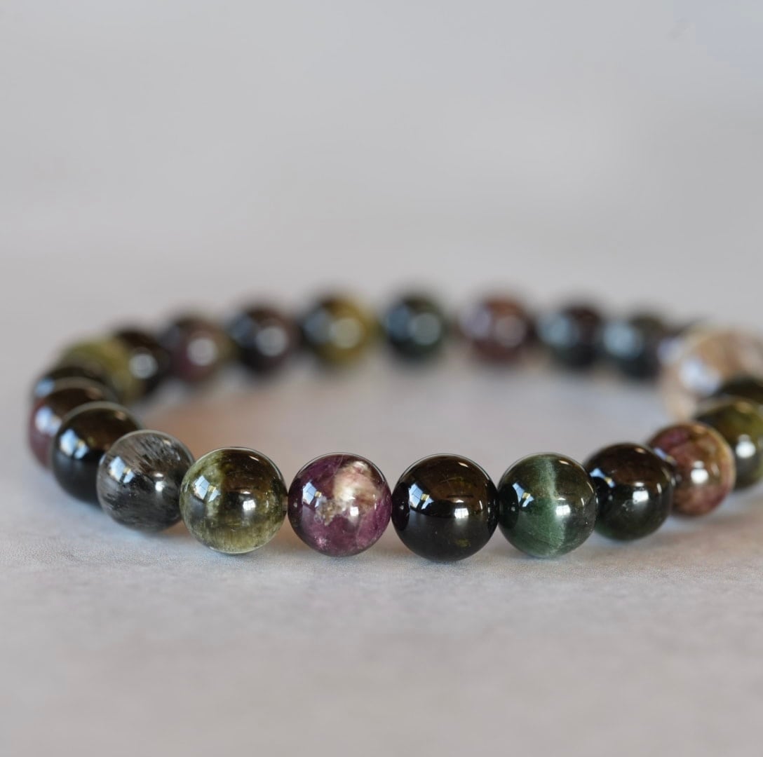 遠目で見ると落ち着いた色合いのブレスレットですが、近づいて見るとなんとも言えない多彩な色合いが混ざり合っているマルチカラーのトルマリンキャッツアイです。ピンク、グリーン、ブラックと一粒づつ表情が異なり、光にかざすとさらにきらきらと煌いて見えます。嬉しいことにインスピレーションや直感を高めてくれるとも言われています。角度を変えてずっと眺めていると良いアイディアが浮かんで来そうですね。
