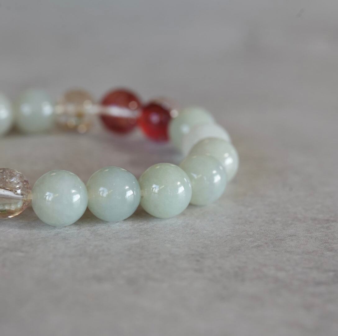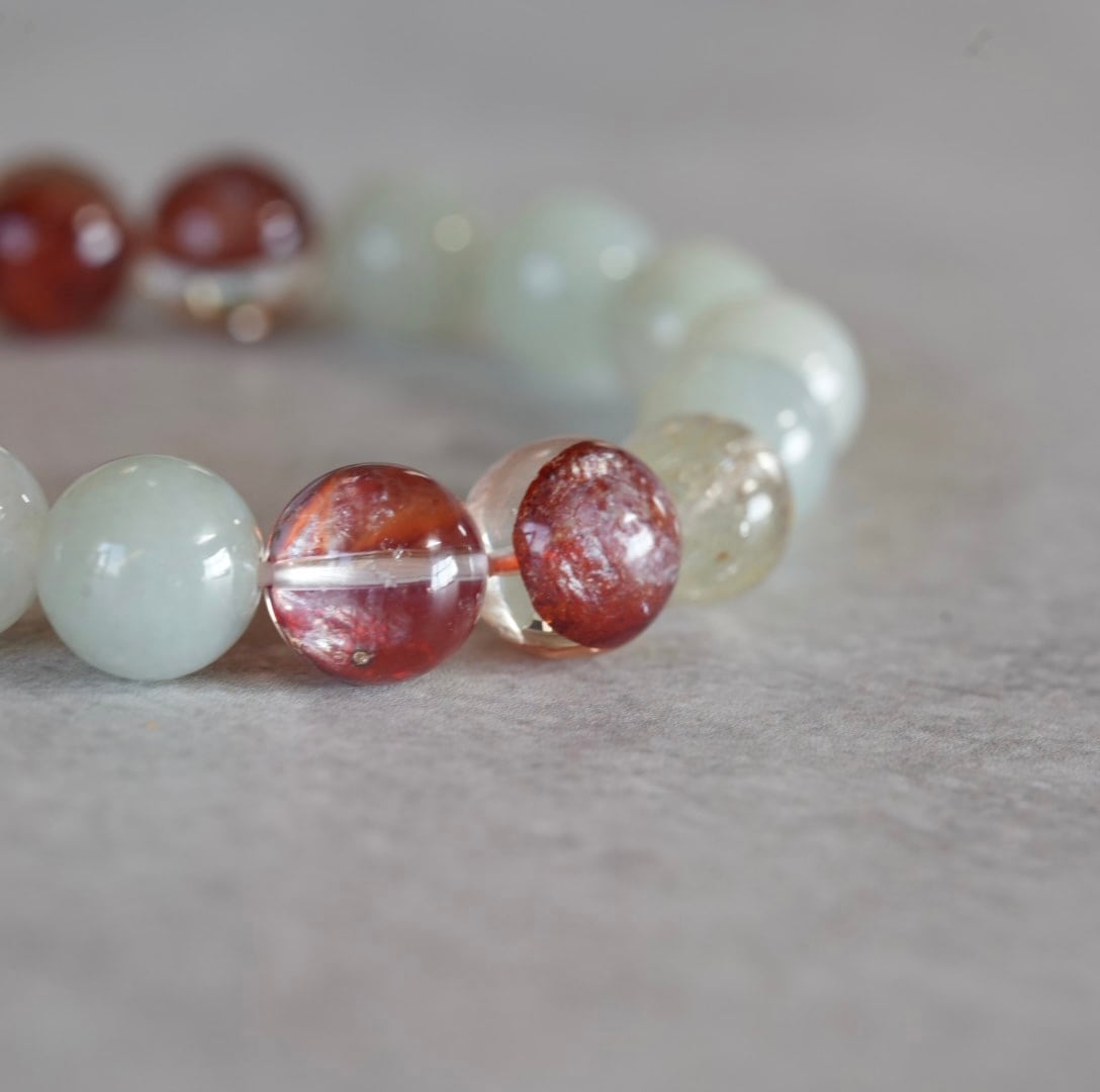 深い赤色が印象的なレッドヘマタイトクォーツ、淡い翠色の翡翠と組み合わせることでやわらかな雰囲気になりました。透明感の中に赤が入ったレッドヘマタイトクォーツは眺めていると活力が湧いて来て、そっと背中を押して応援してくれる色合いですね。ゴールドルチルクォーツを2粒加えて、金運効果も期待してます。