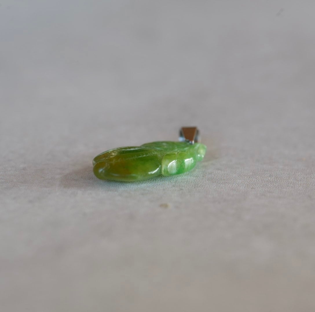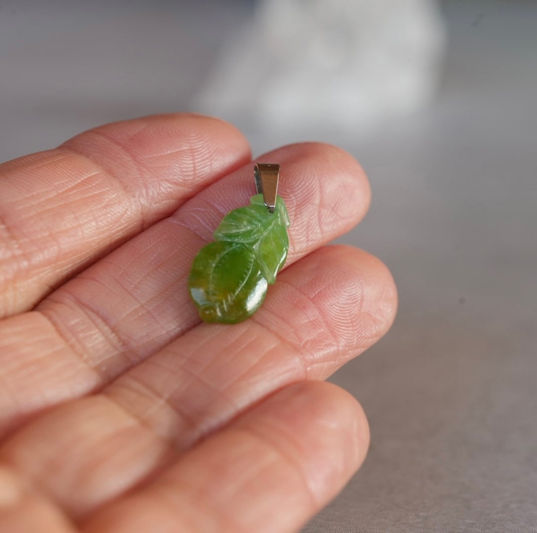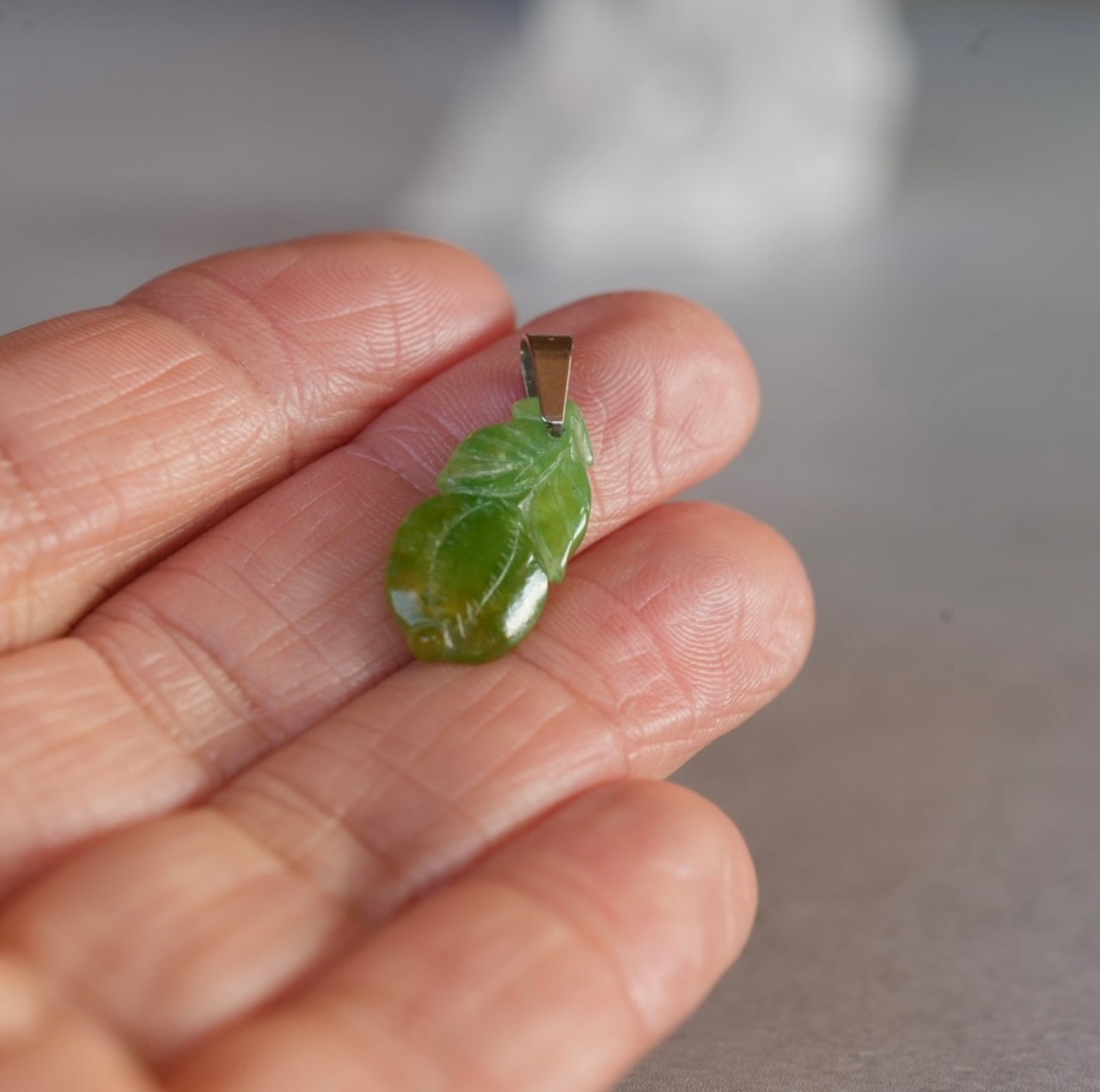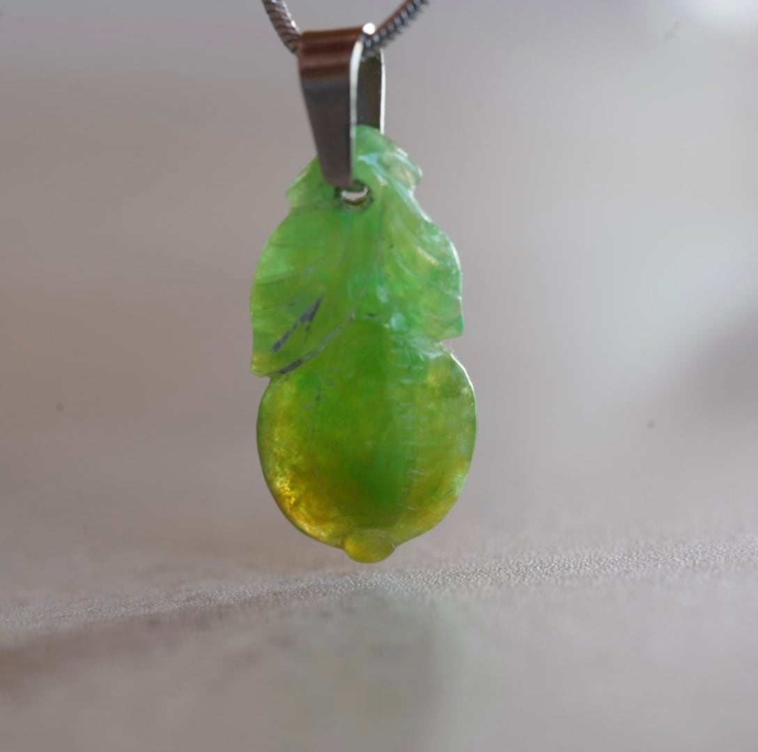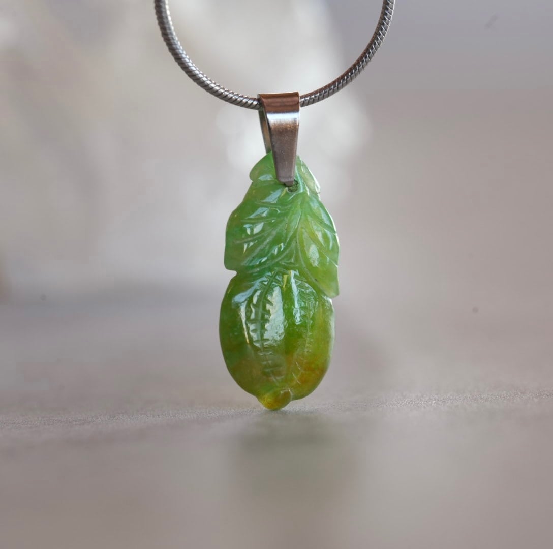 はっきりとした果実デザインで、彫も入っています。光のもとでは明るめの翠に黄色も混ざったような色合いです。光や角度でさまざまな表情を見せてくれる味わいのある翡翠、小さめでありながらも存在感たっぷりです。
