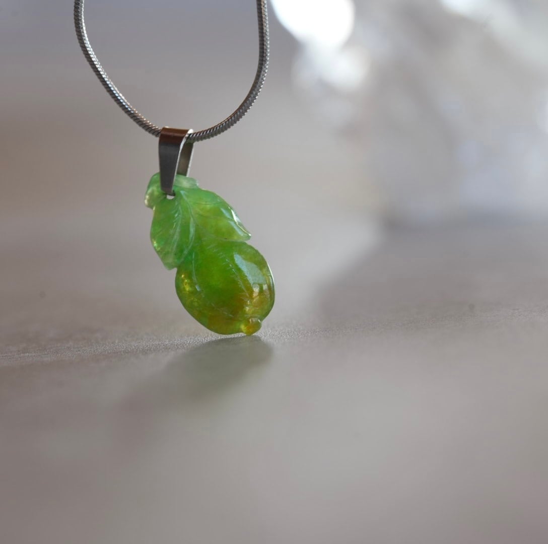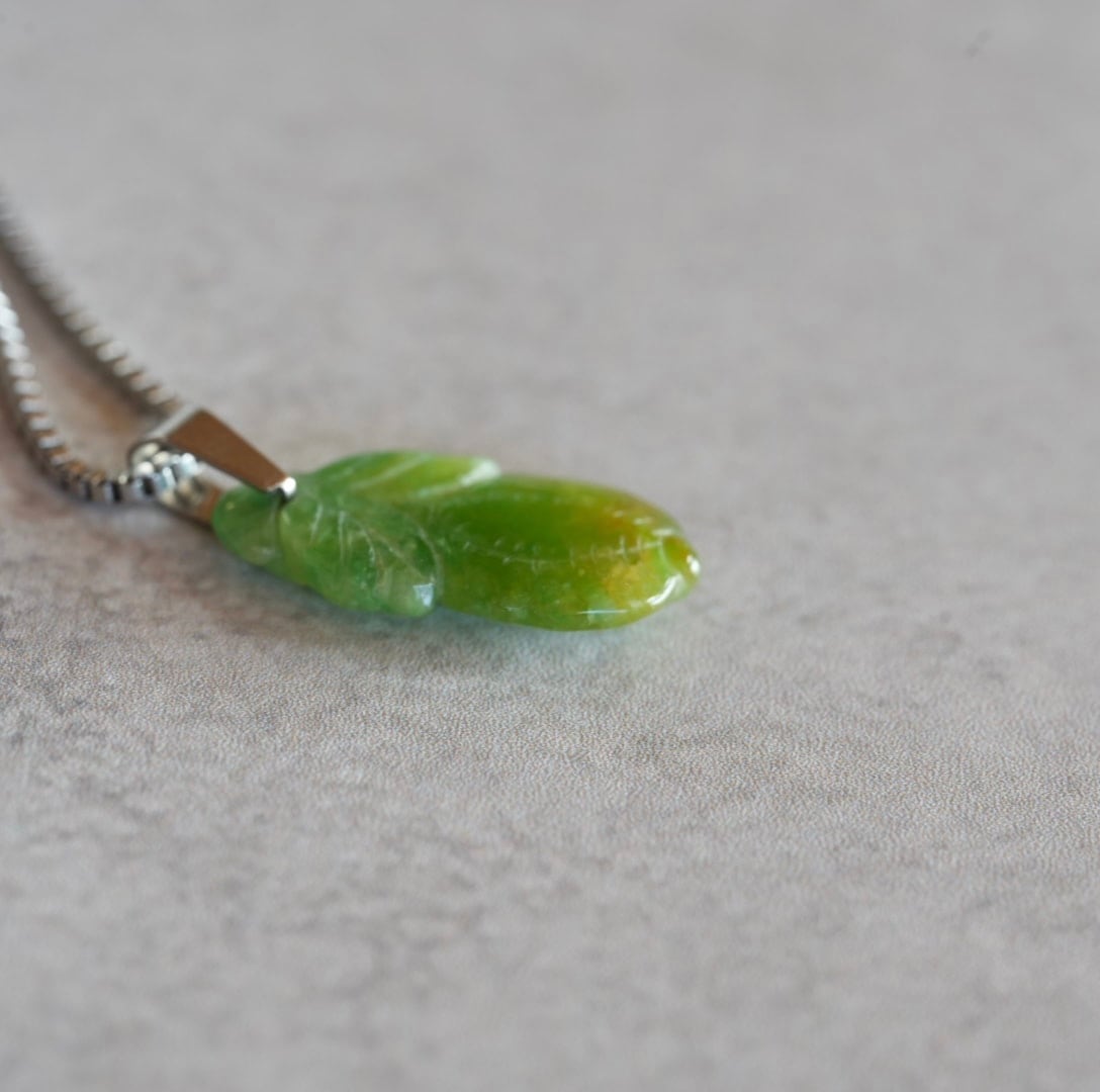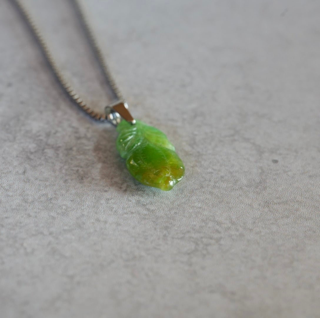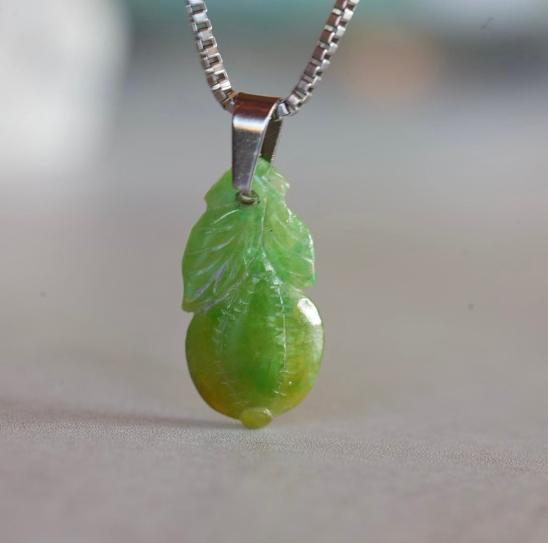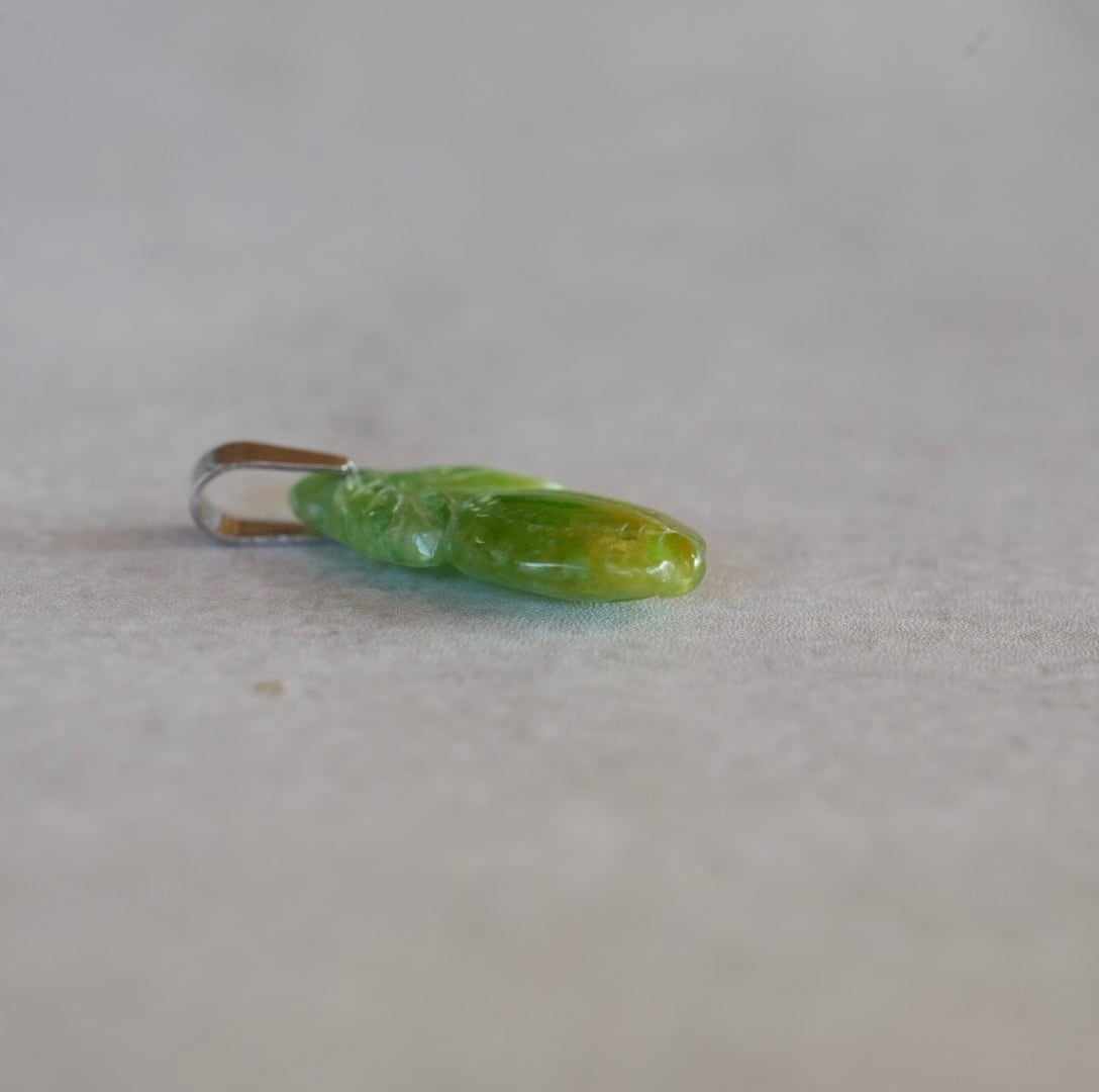 はっきりとした果実デザインで、彫も入っています。光のもとでは明るめの翠に黄色も混ざったような色合いです。光や角度でさまざまな表情を見せてくれる味わいのある翡翠、小さめでありながらも存在感たっぷりです。