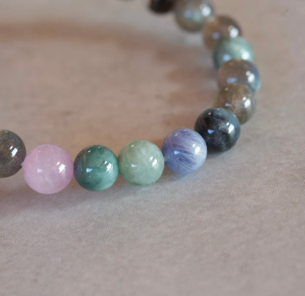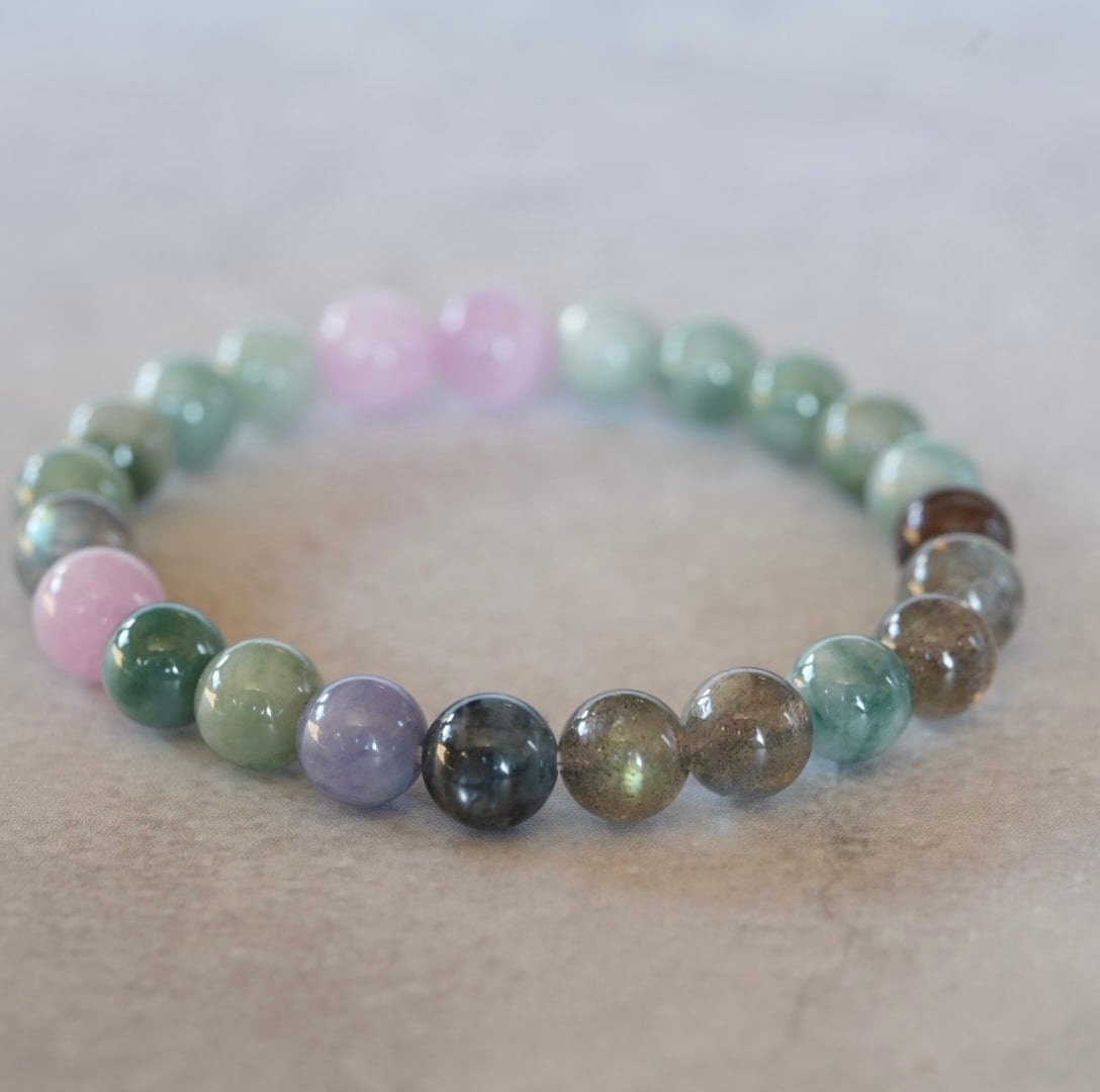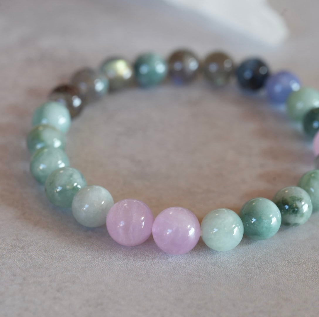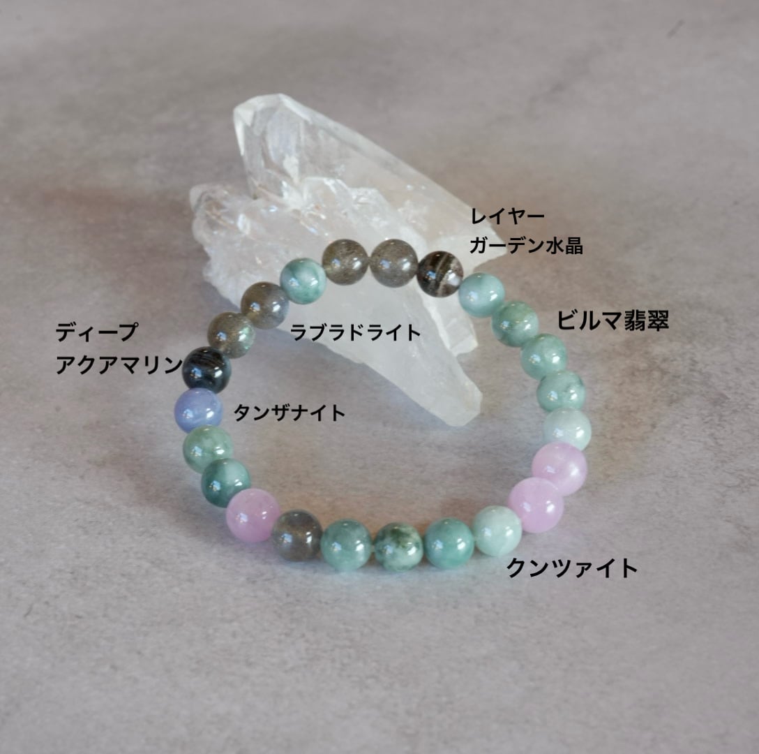 人気の翡翠のミックスブレスレット、やわらかな翠色の翡翠を主役に、かわいらしいクンツァイト、落ち着いた紫色のタンザナイト、深い藍色のディープアクアマリン、神秘的なラブラドライト、レイヤーガーデン水晶を合わせて奥行きがあり深みのあるブレスレットになりました。翡翠がベースになると、沢山の異なる石を合わせても肌なじみが良くなりますね。