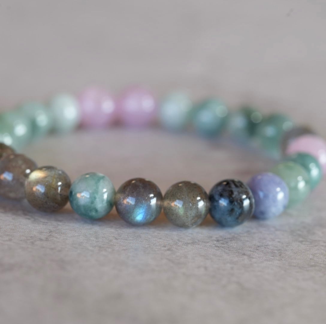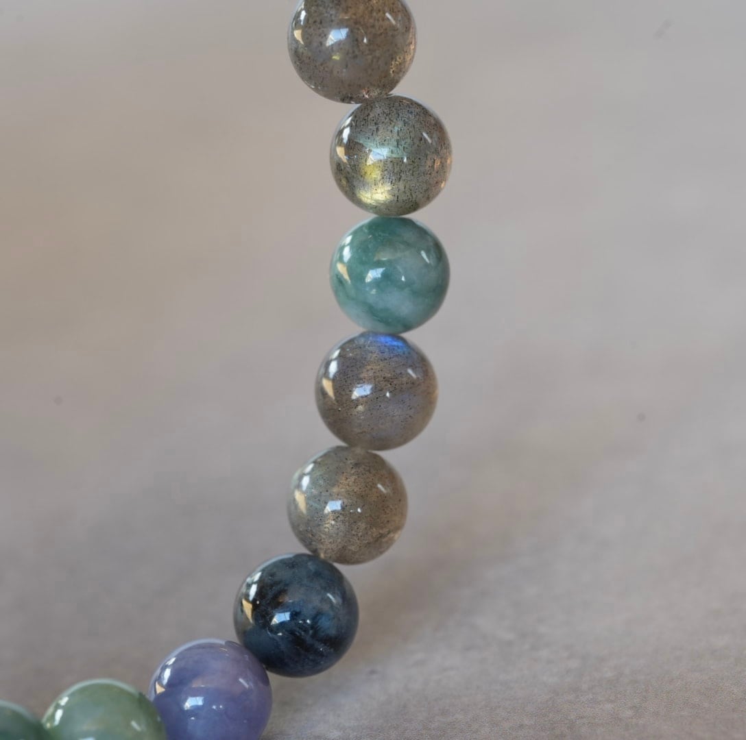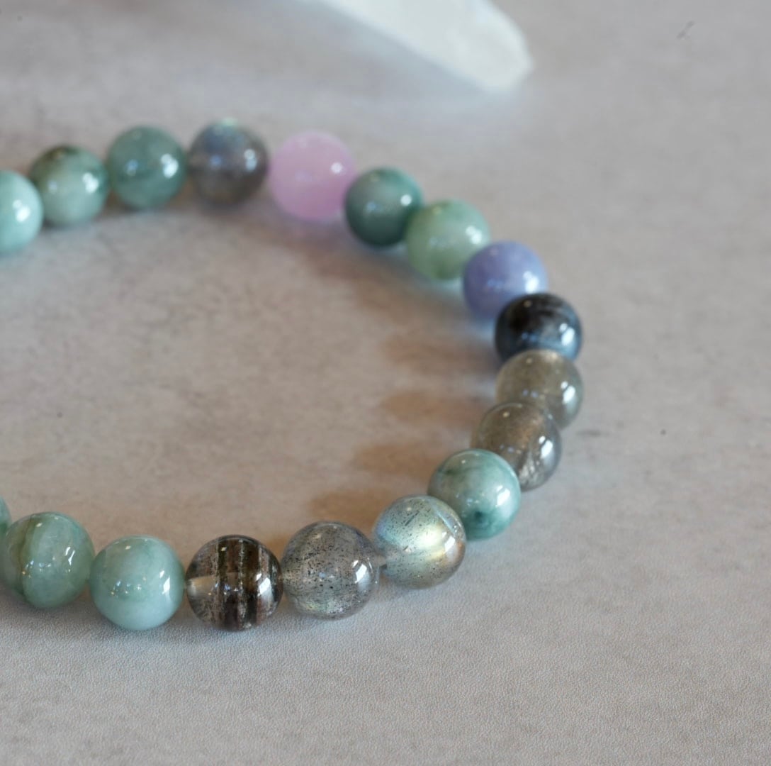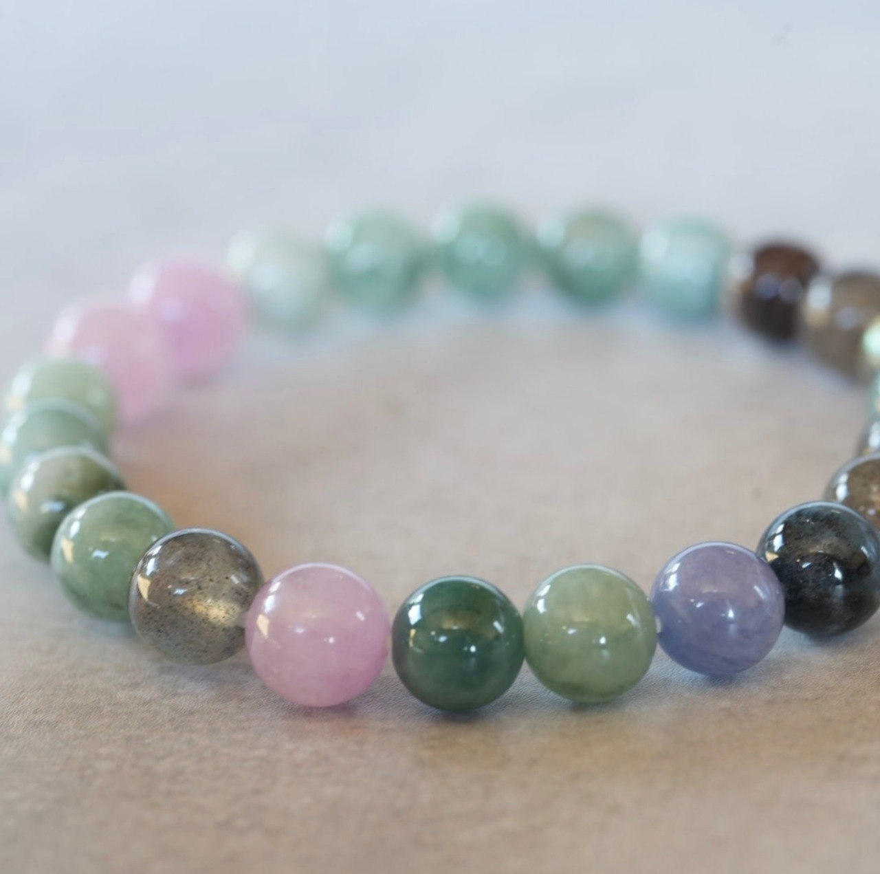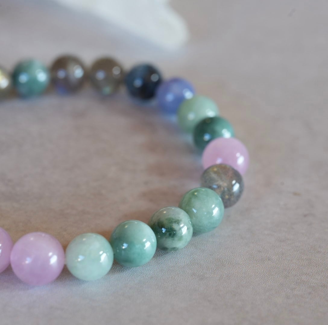 人気の翡翠のミックスブレスレット、やわらかな翠色の翡翠を主役に、かわいらしいクンツァイト、落ち着いた紫色のタンザナイト、深い藍色のディープアクアマリン、神秘的なラブラドライト、レイヤーガーデン水晶を合わせて奥行きがあり深みのあるブレスレットになりました。翡翠がベースになると、沢山の異なる石を合わせても肌なじみが良くなりますね。