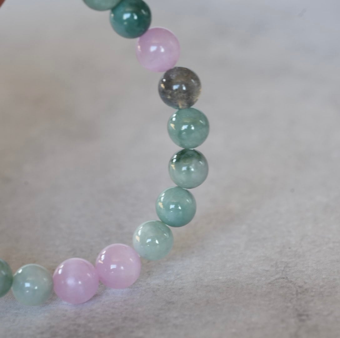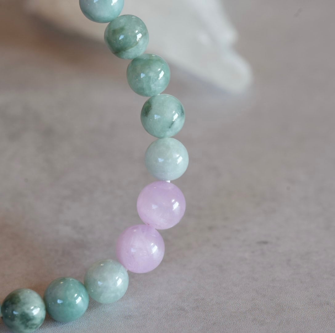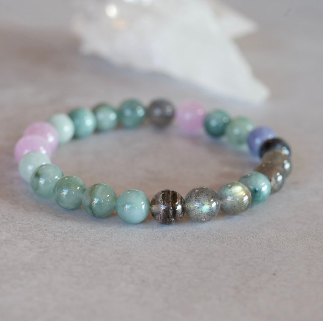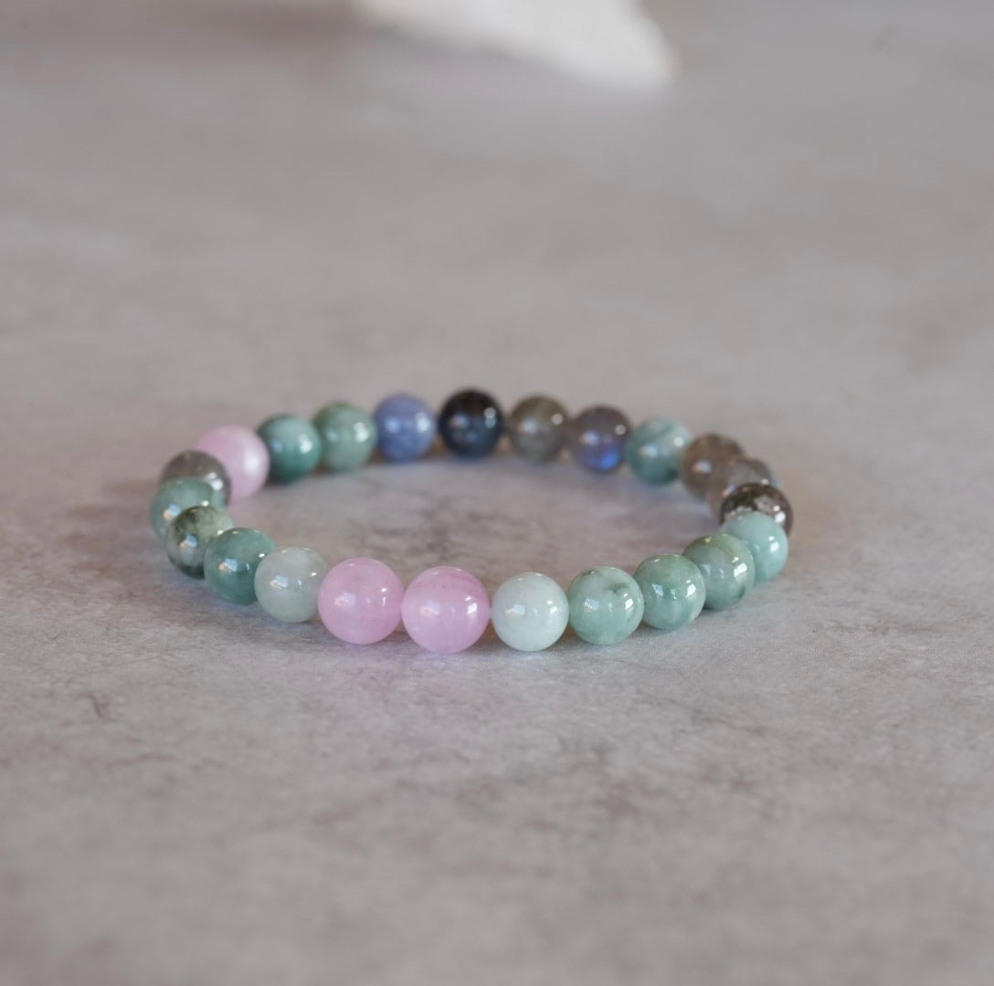 人気の翡翠のミックスブレスレット、やわらかな翠色の翡翠を主役に、かわいらしいクンツァイト、落ち着いた紫色のタンザナイト、深い藍色のディープアクアマリン、神秘的なラブラドライト、レイヤーガーデン水晶を合わせて奥行きがあり深みのあるブレスレットになりました。翡翠がベースになると、沢山の異なる石を合わせても肌なじみが良くなりますね。