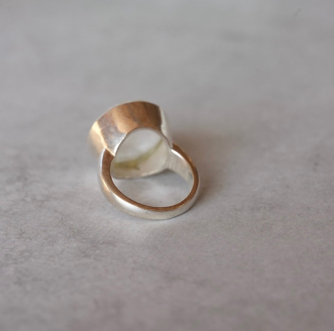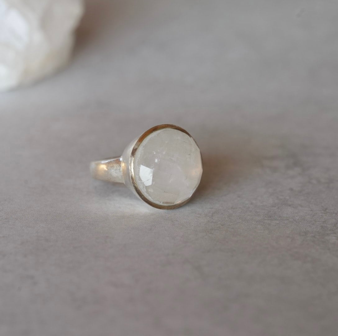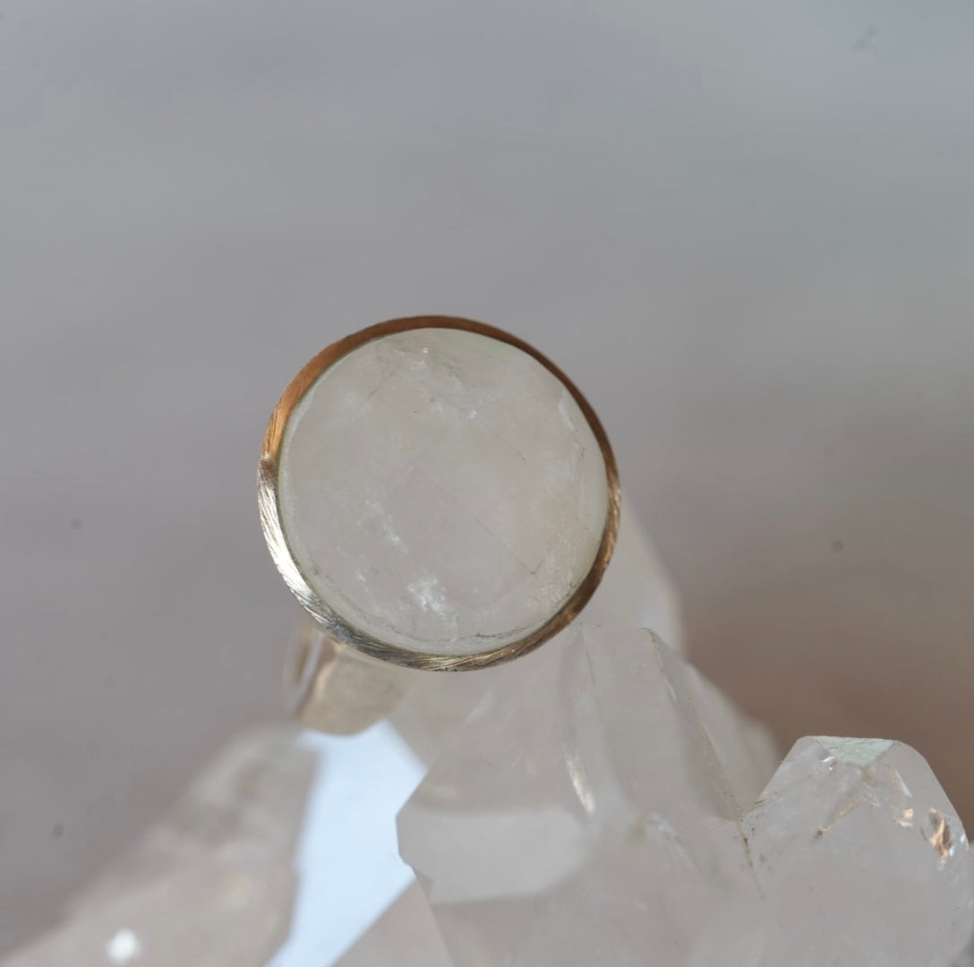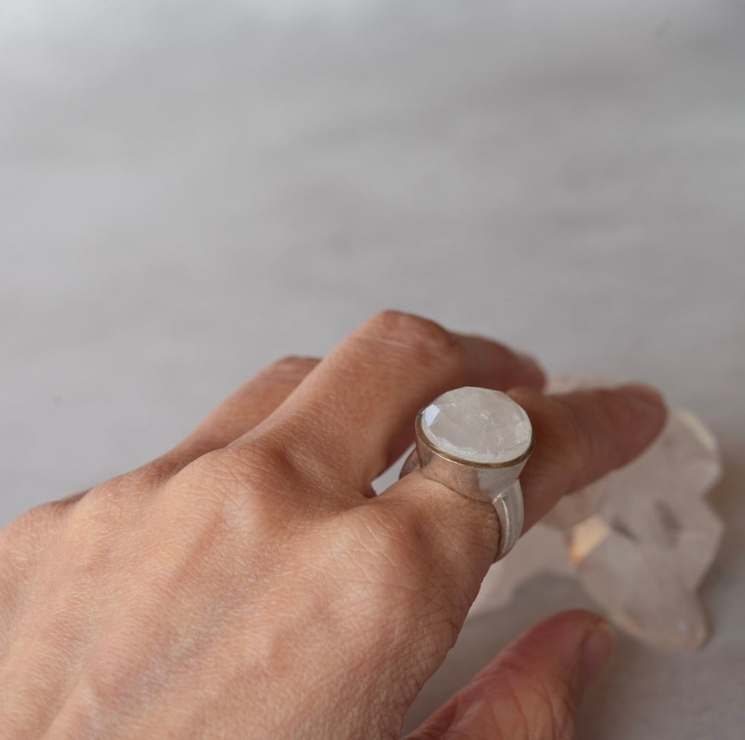 大きな丸い形にカットがほどこされたムーンストーンのリング、着けるだけでなんだかお洒落になれそうです。中に入っている鉱物が雪の結晶のようにも見えてなんだかロマンチックなリングです。