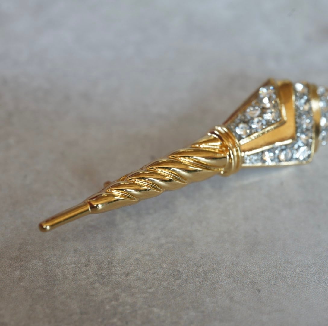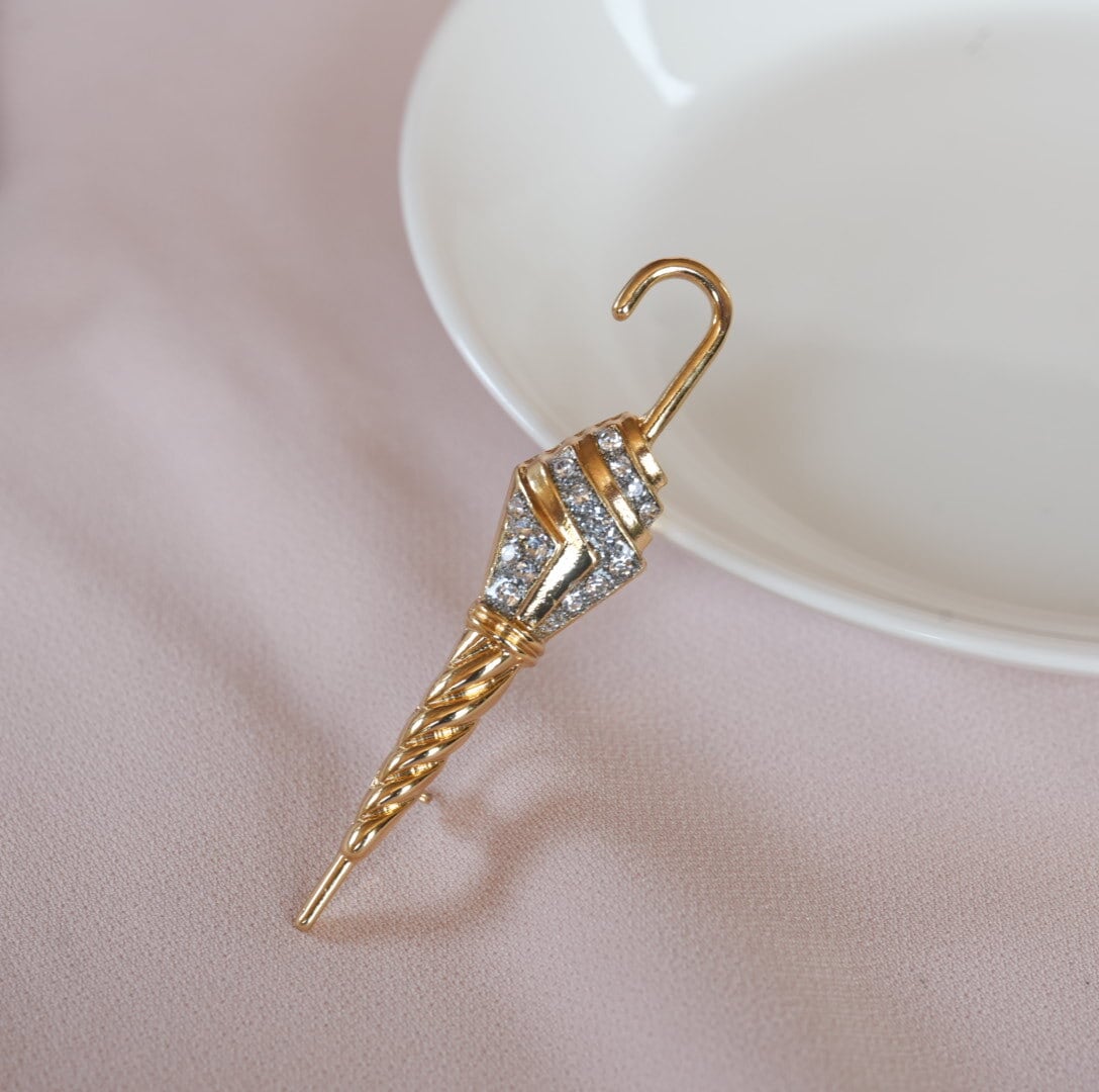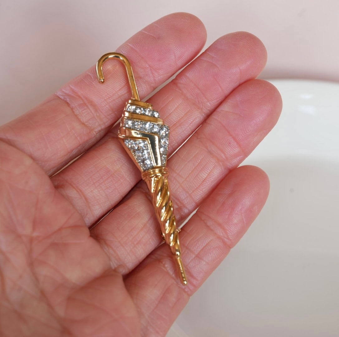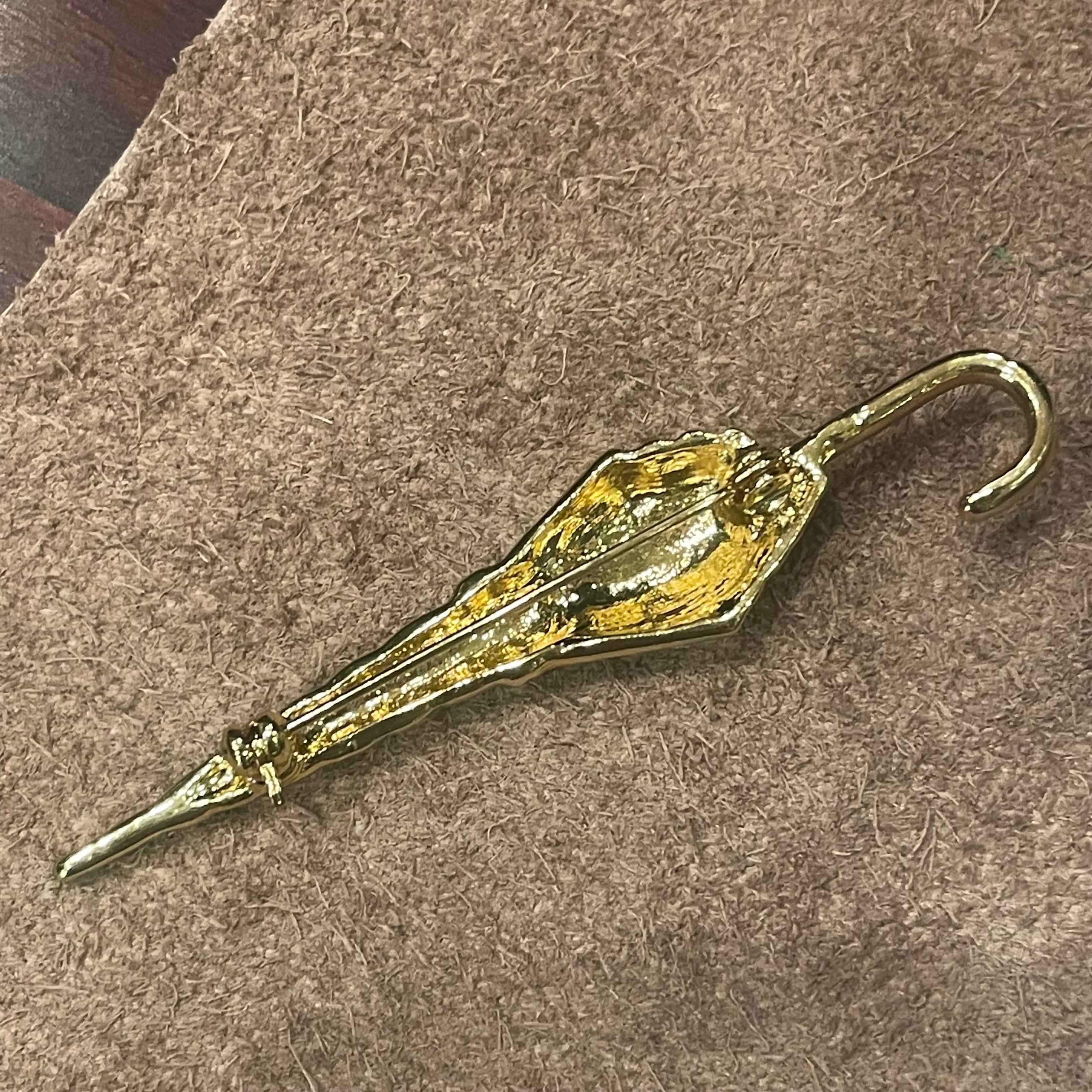 凛とした雰囲気が漂うシャープなデザインのアンブレラブローチ。(傘、よりもアンブレラという呼び方が似合うと思いました)キラキラのビーズでほんの少しの華やかさも忘れていません。