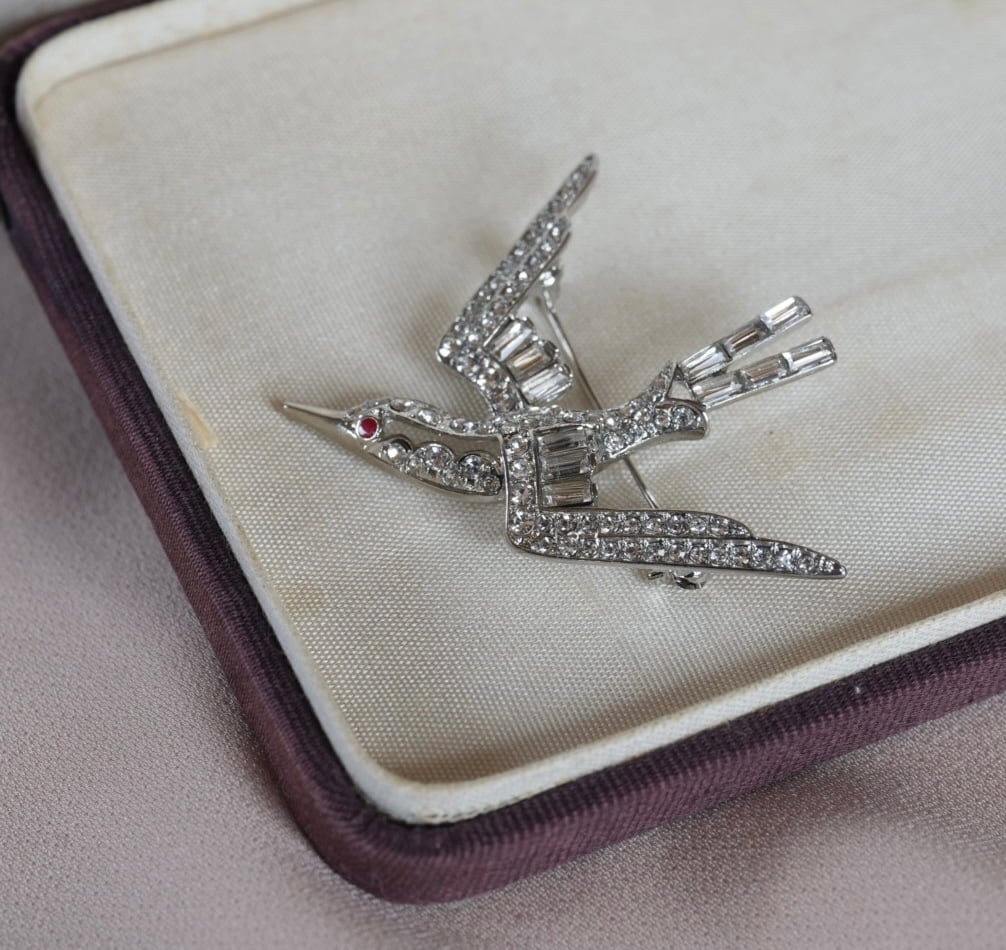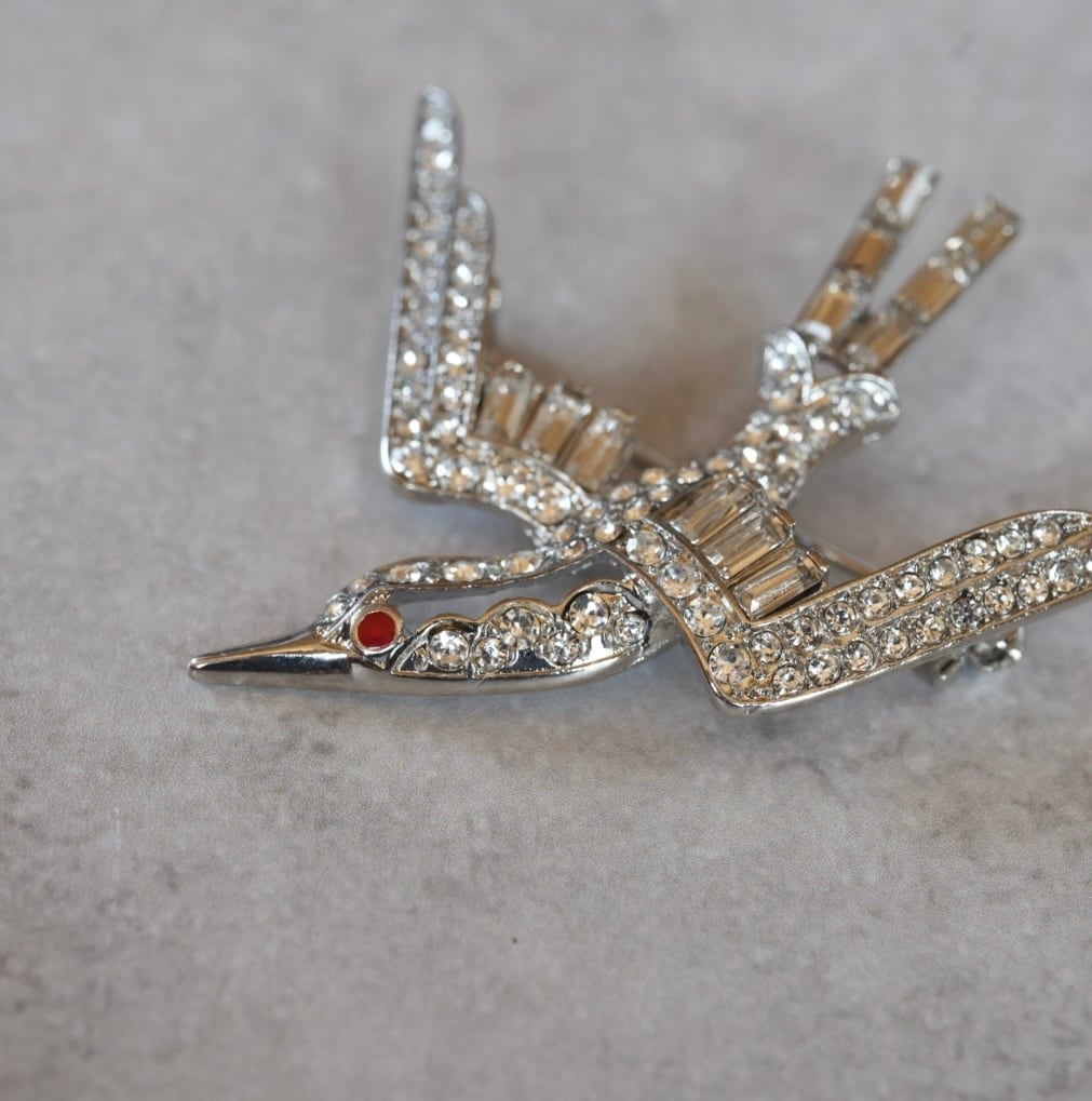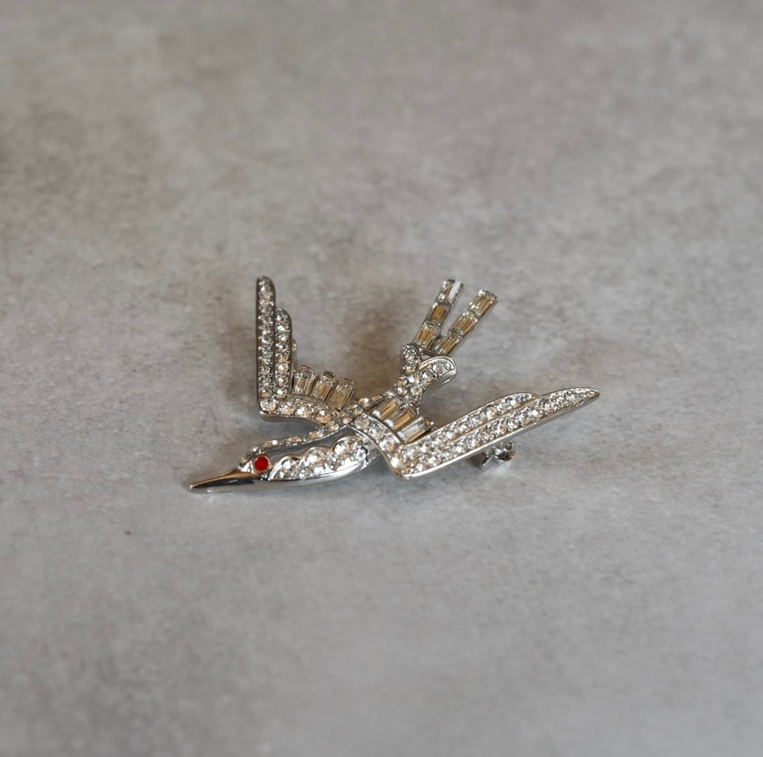 幸運のシンボル、ツバメのキラキラブローチです。赤い目がチャームポイントのツバメさん、少しシャープなラインが印象的です。