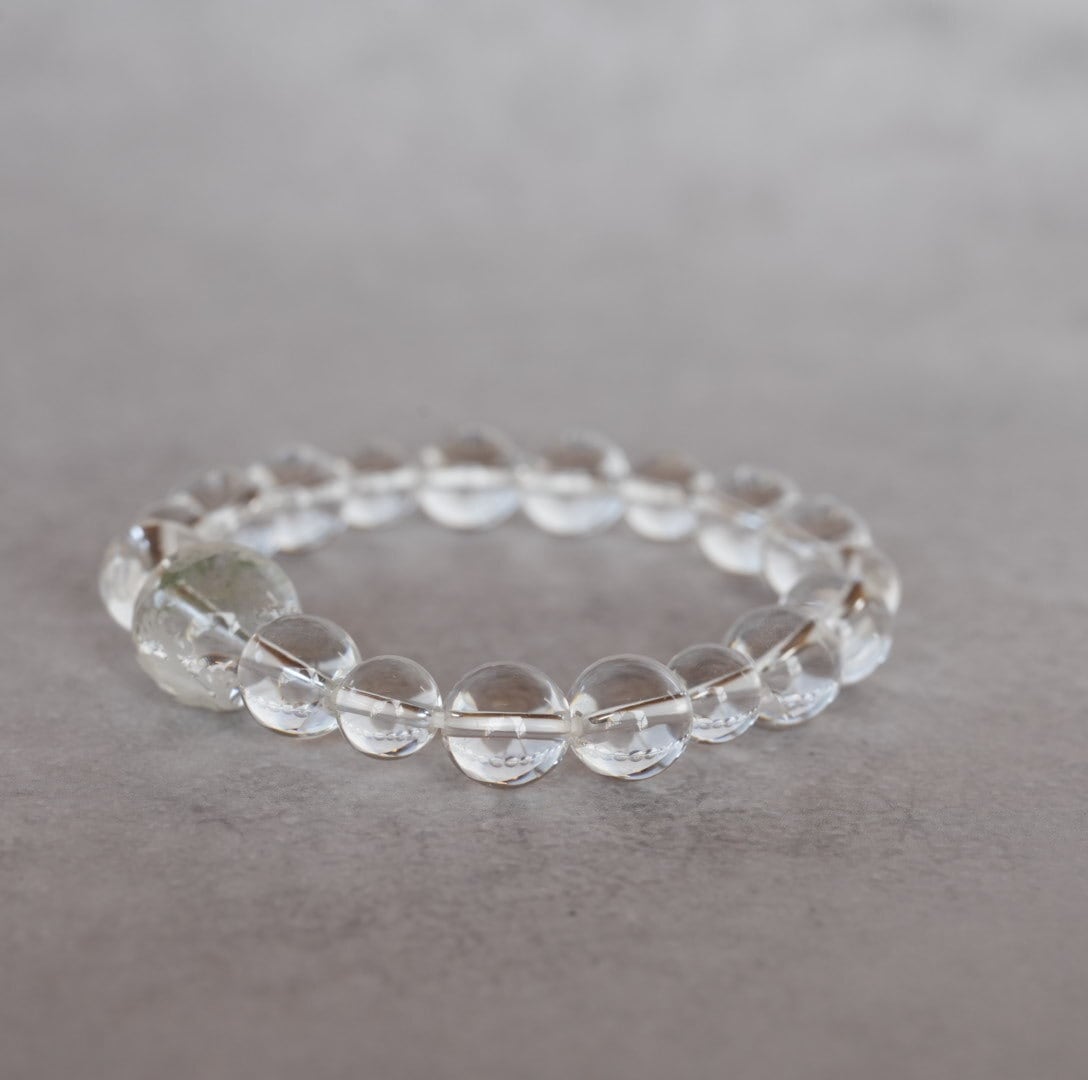 みずみずしく透明感のある10㎜と8㎜サイズの水晶に、龍が手彫りされているガーデンクォーツを合わせています。龍もしっかりと彫られているので身に着けているとなんだか守られているような気持ちになります。