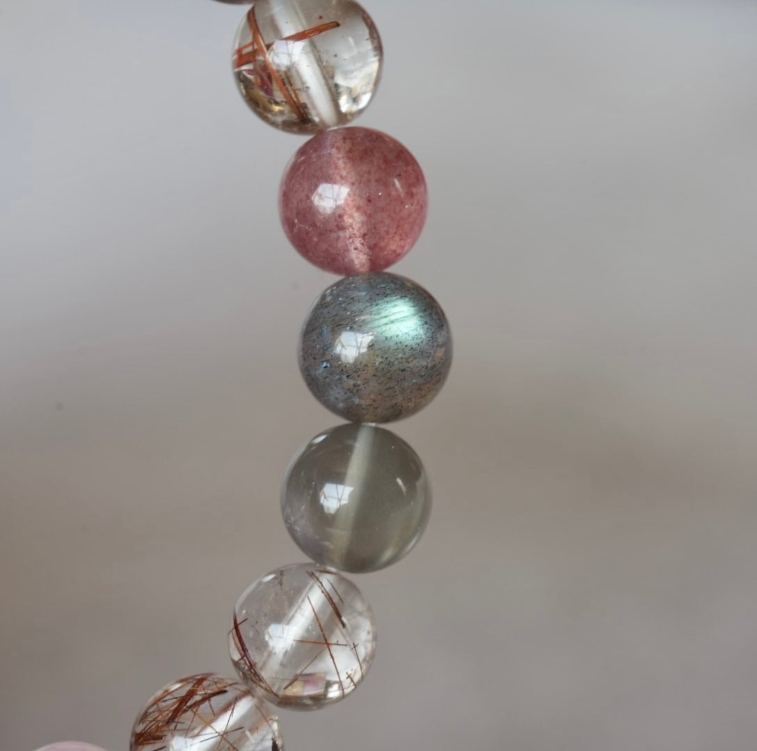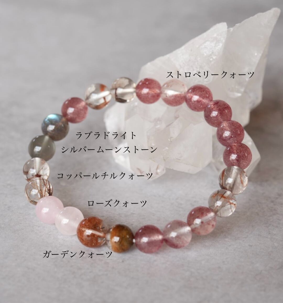 桜の時期に気になるピンクカラーの石たち。やわらかな透明感のあるピンク色のストロベリークォーツと、少し濃いめのピンク色のストロベリークォーツを軸にして、神秘的なガーデンクォーツ、ラブラドライトを合わせて
