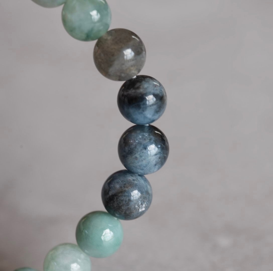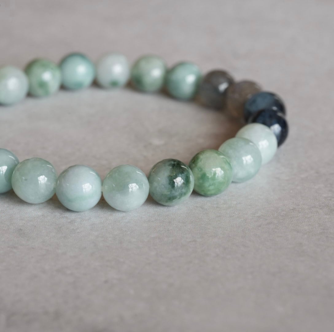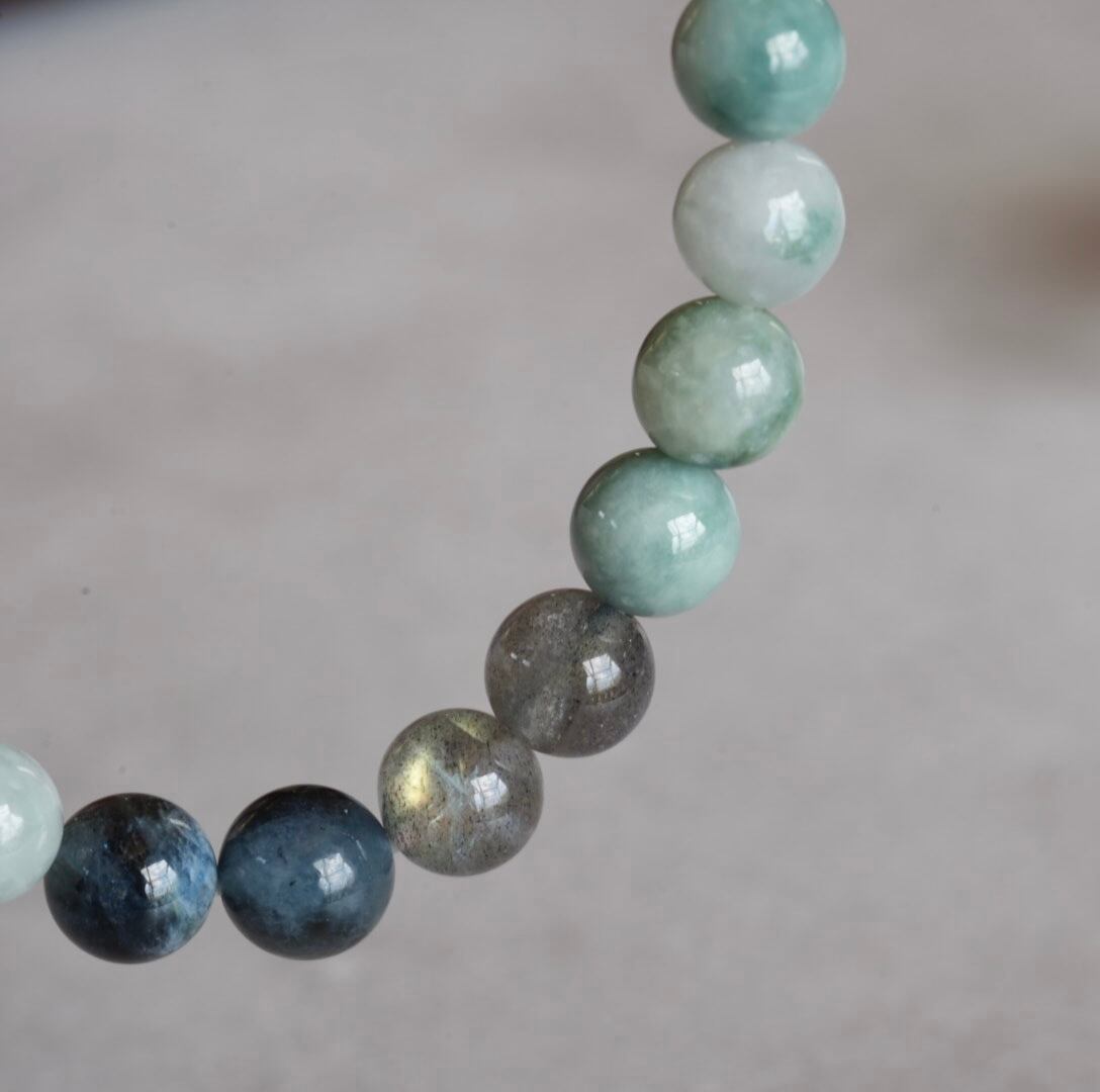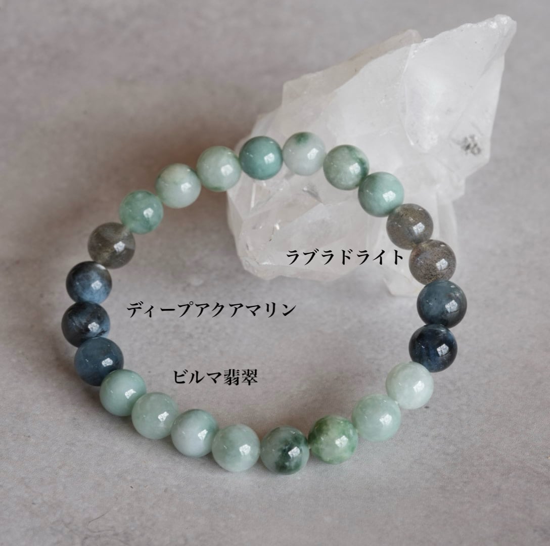 やわらかな翠色や、深い翠の墨を流したような翡翠、いろんなタイプの翡翠を集めてみました。藍色の輝きがクールなディープアクアマリン、ブルーのシラーが美しいラブラドライトを合わせて奥行きあるブレスレットに仕上げています。シックで肌馴染みの良いおすすめのブレスレットです。