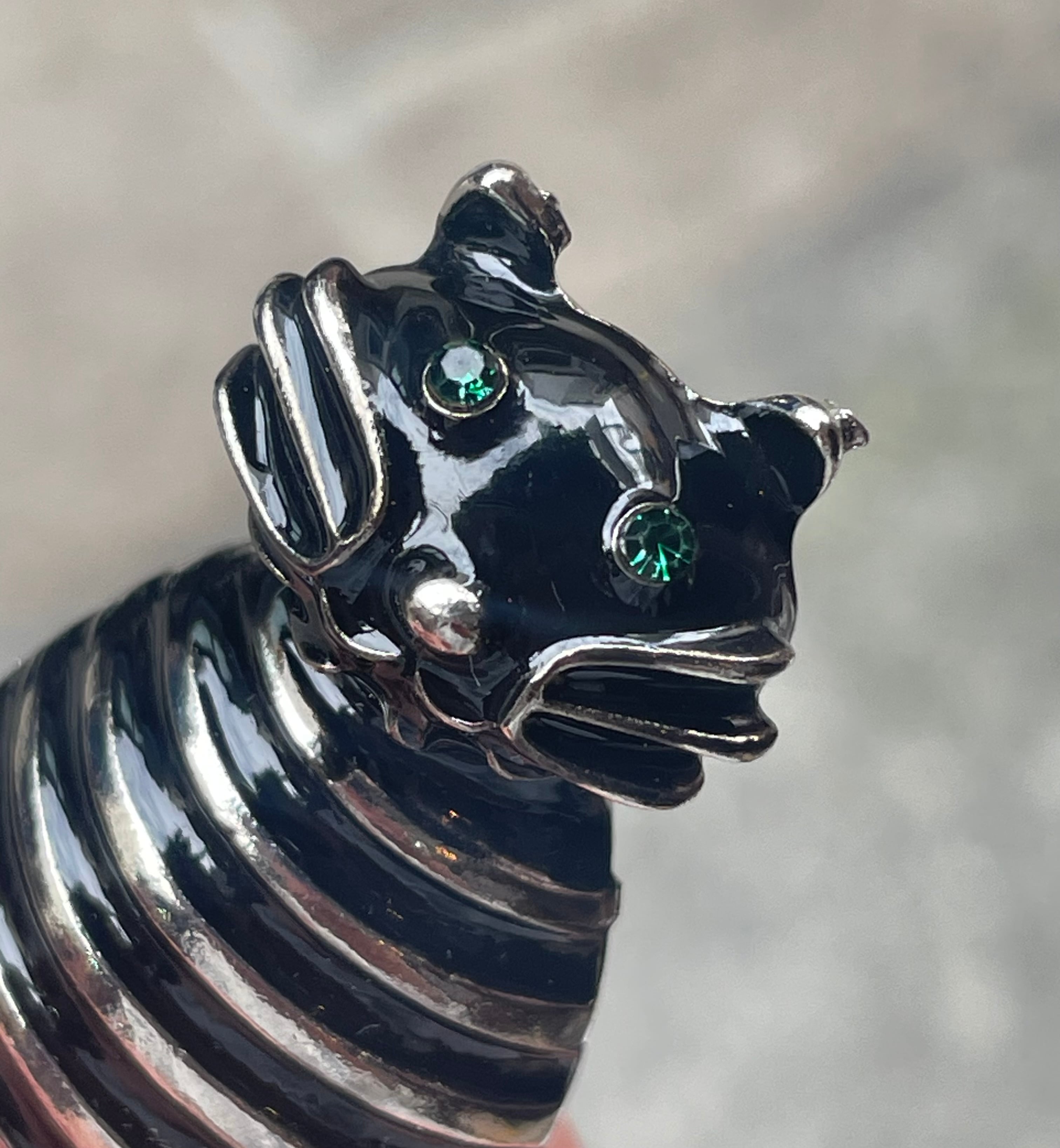 まぁるいお腹と緑色に光る目がチャームポイントの縞ネコのブローチです。黒にシルバーの縞なので、可愛い中にもクールさが感じられます。
