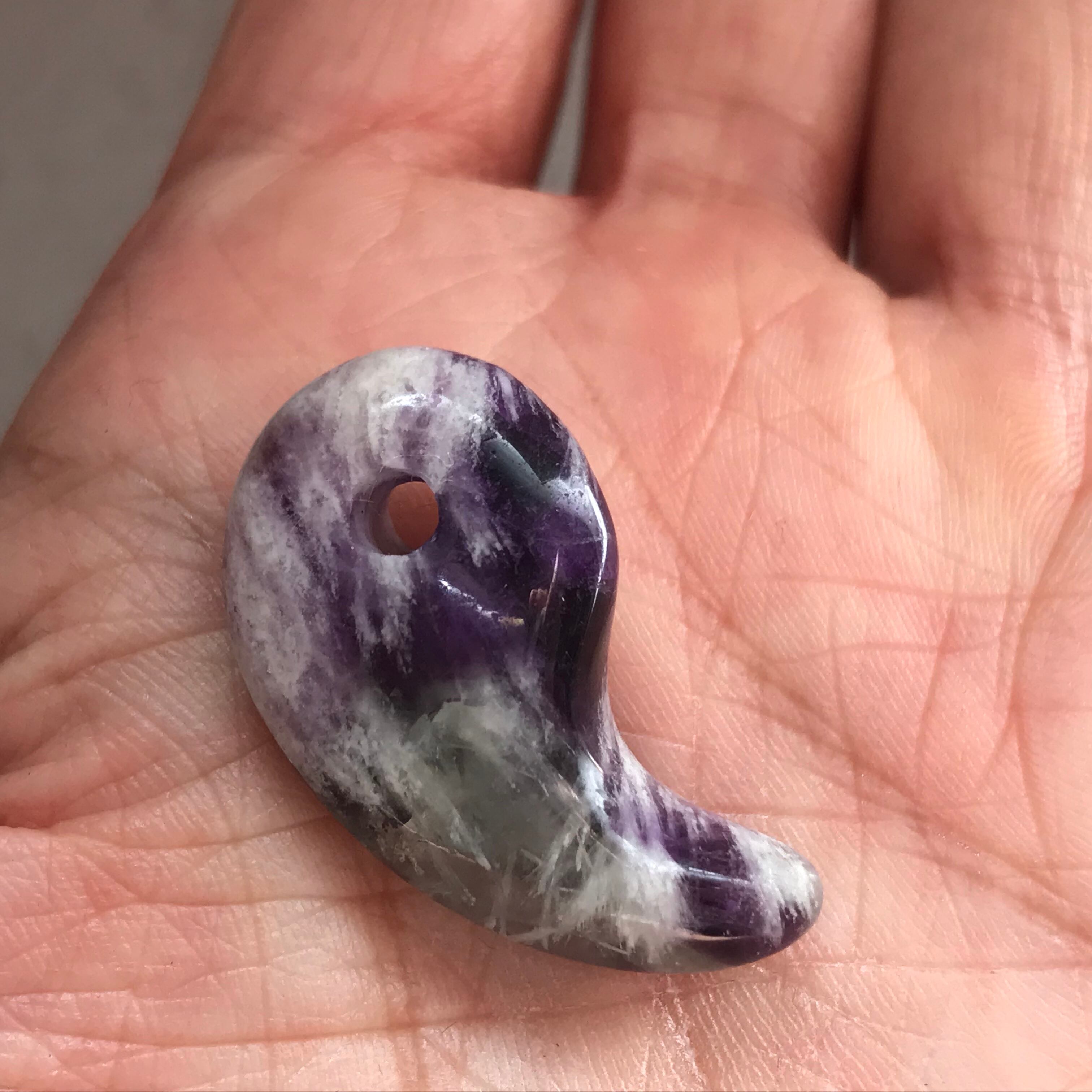 エンジェルフェザーフローライトの天然の羽のような模様が美しい勾玉です。