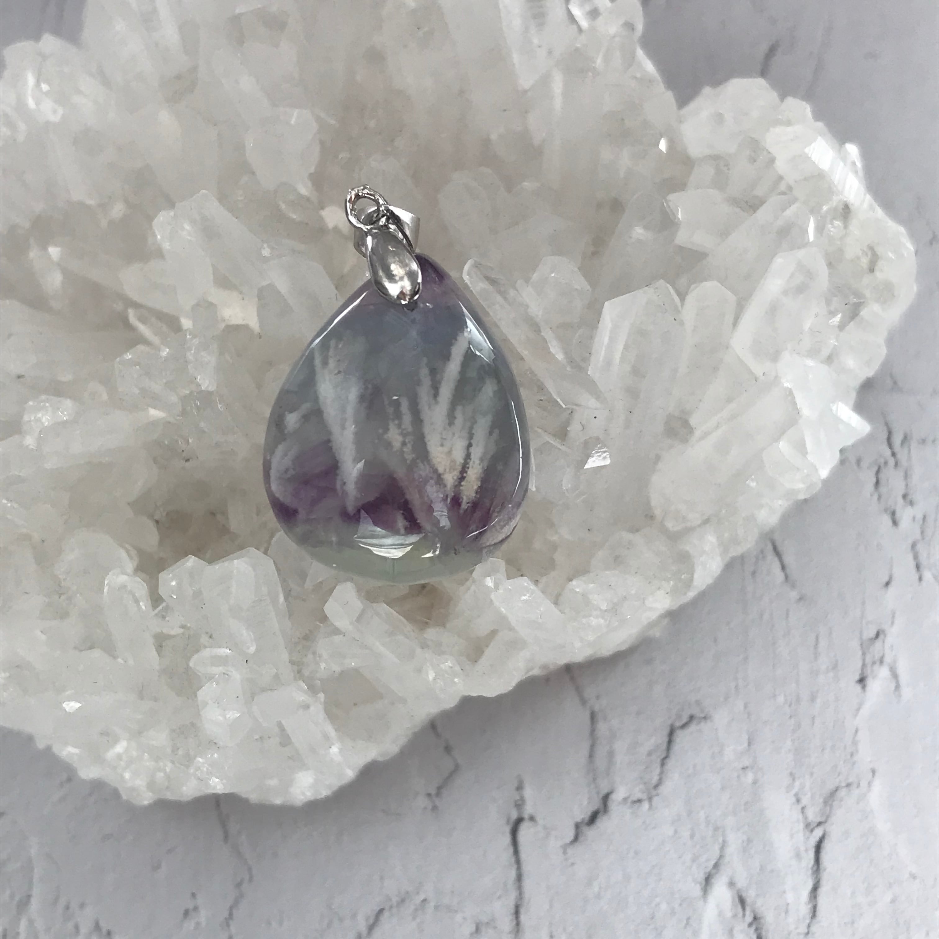 天使の羽を閉じ込めたような白い内包物が入っているフローライト。
