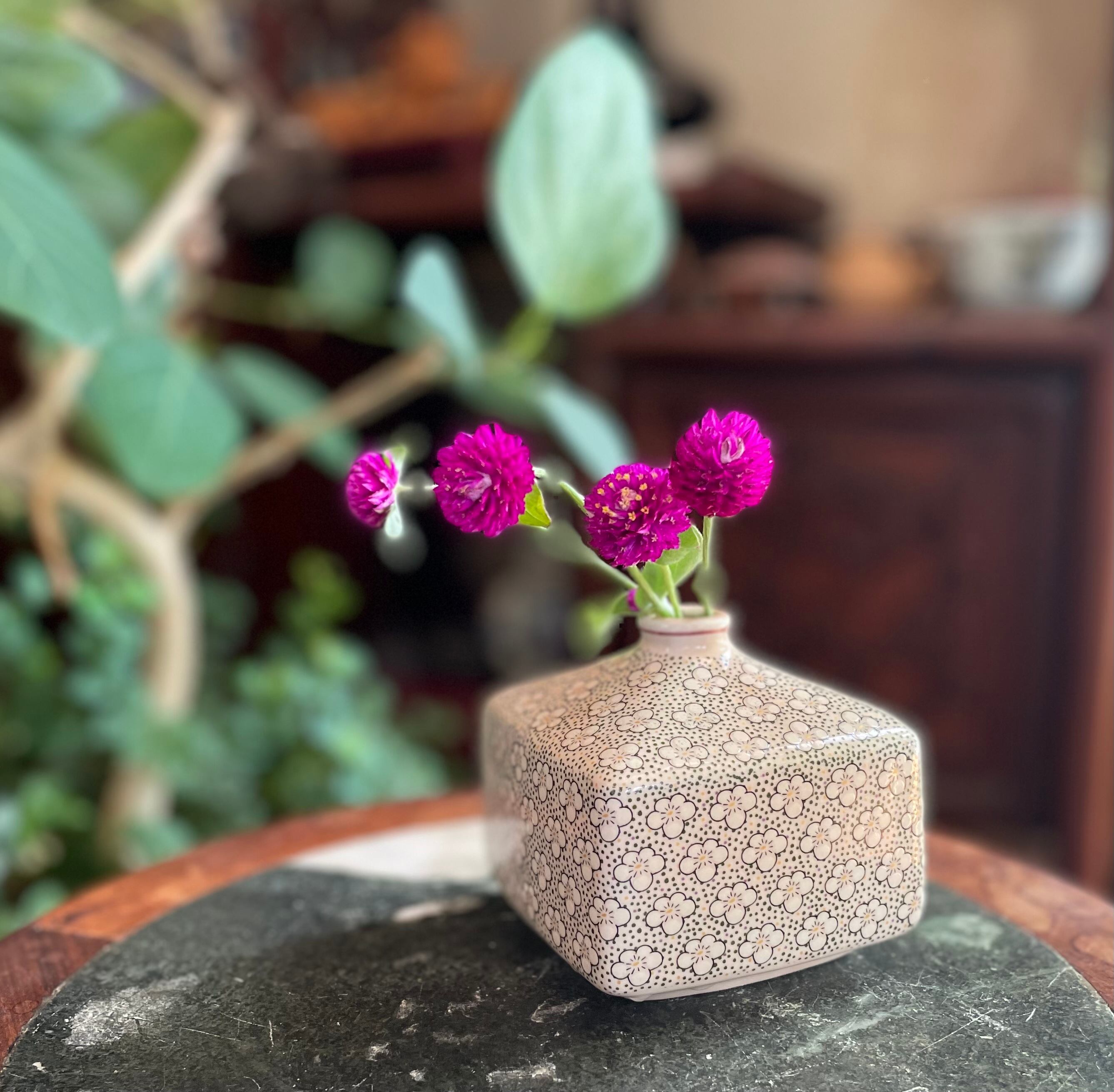 控えめな小花柄がかわいい陶器の一輪挿しです。