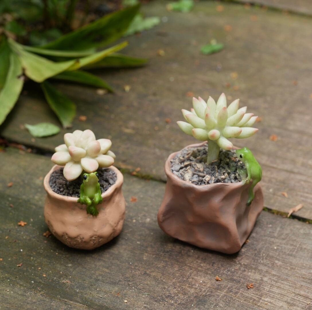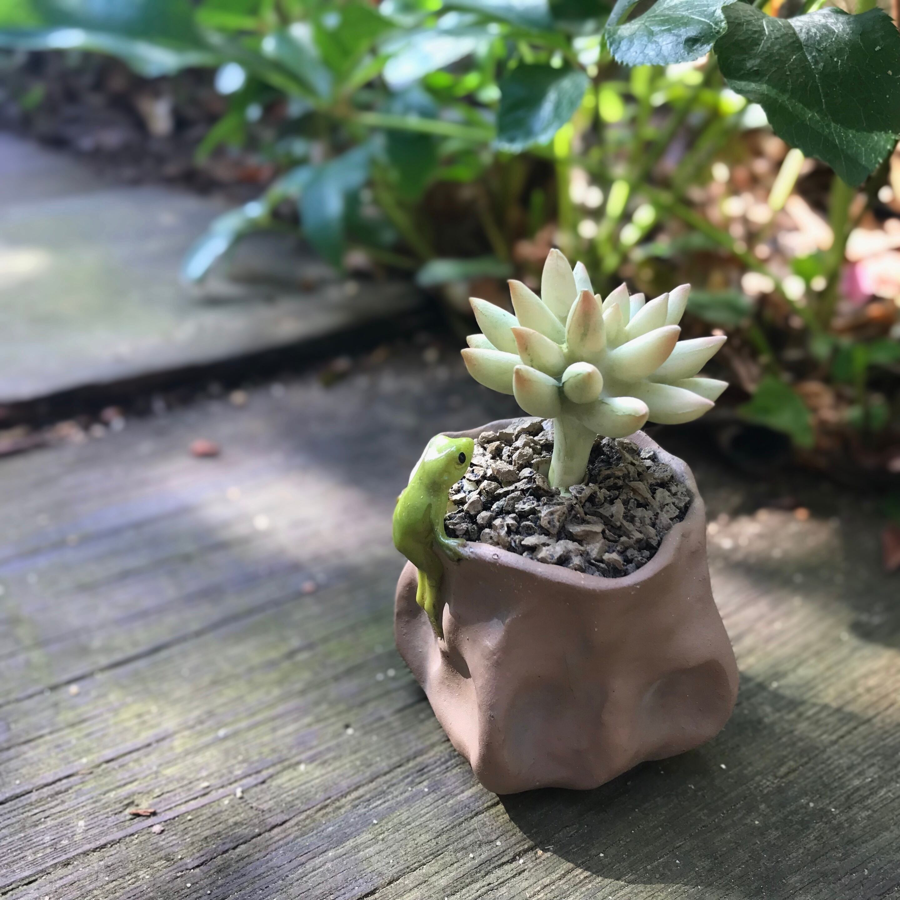 本物かと見間違えるほど良くできている多肉植物です。植木鉢にちょこんとカエルさんが登っています♫