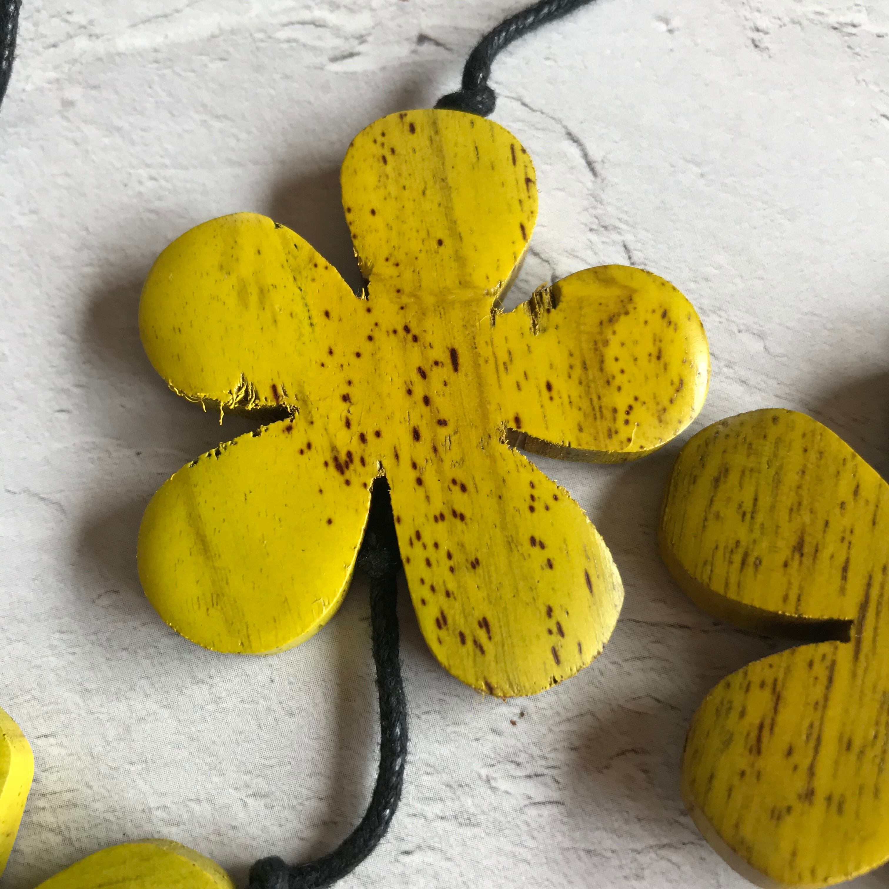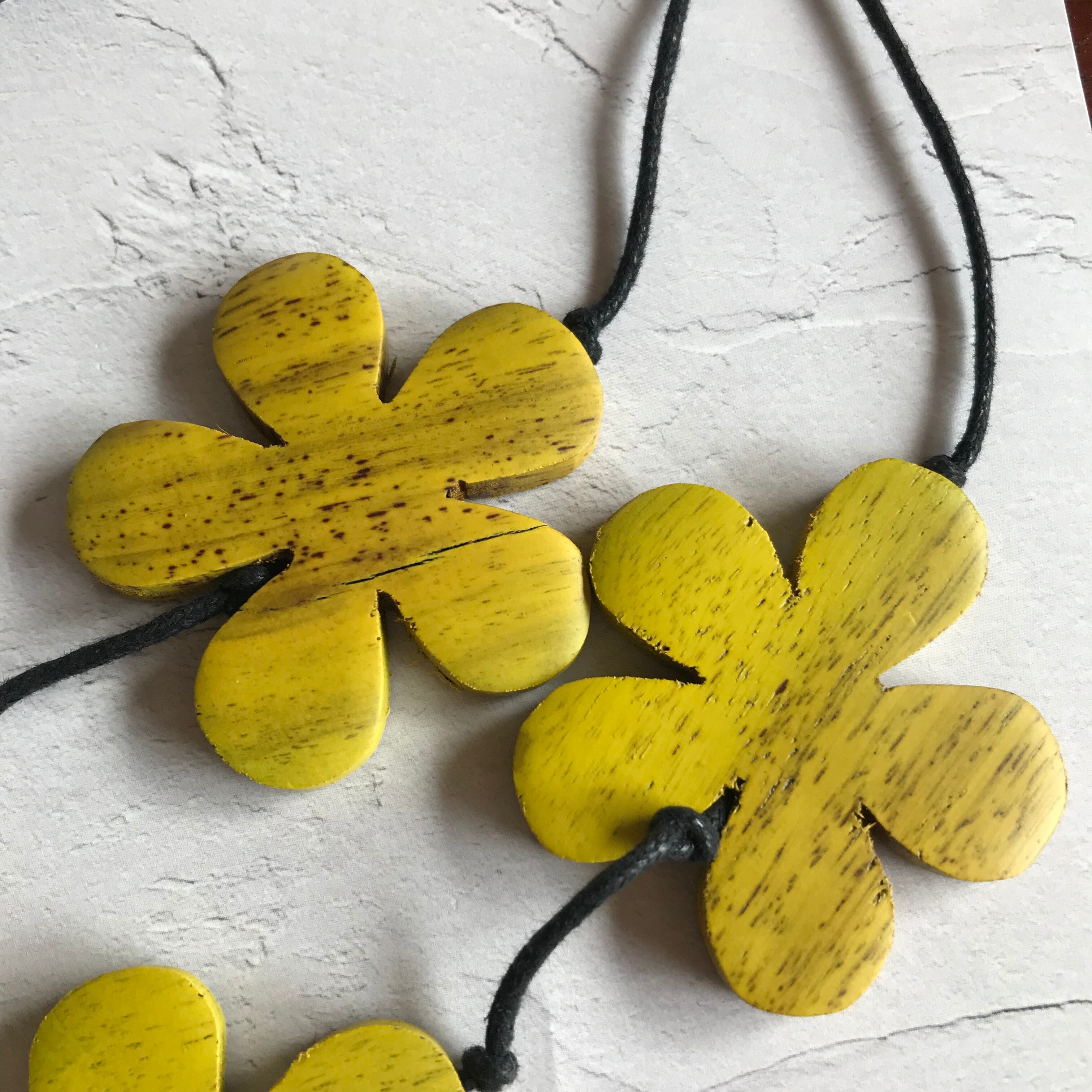 ランダムなかたちのフラワーデザインがかわいらしい木製のネックレスです。