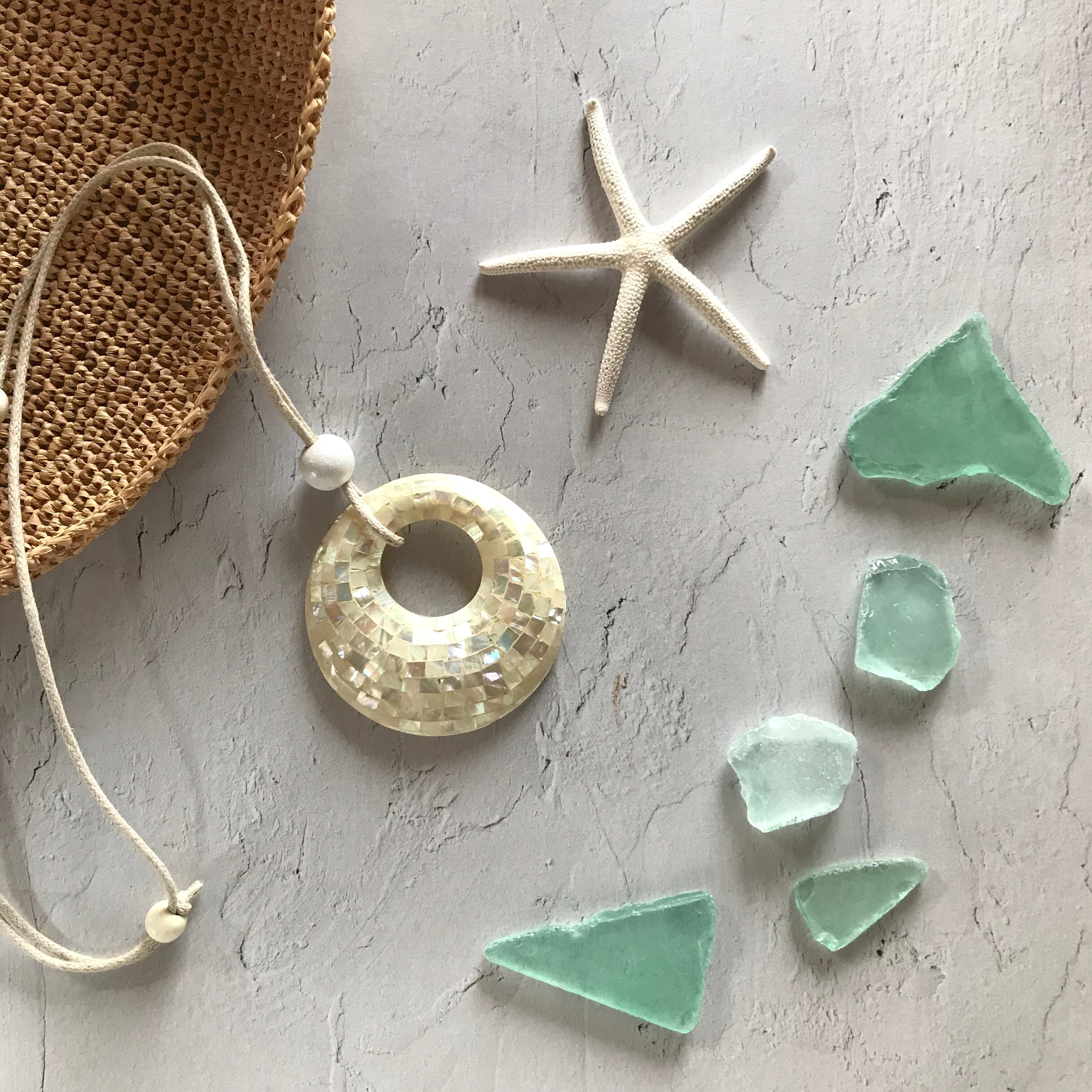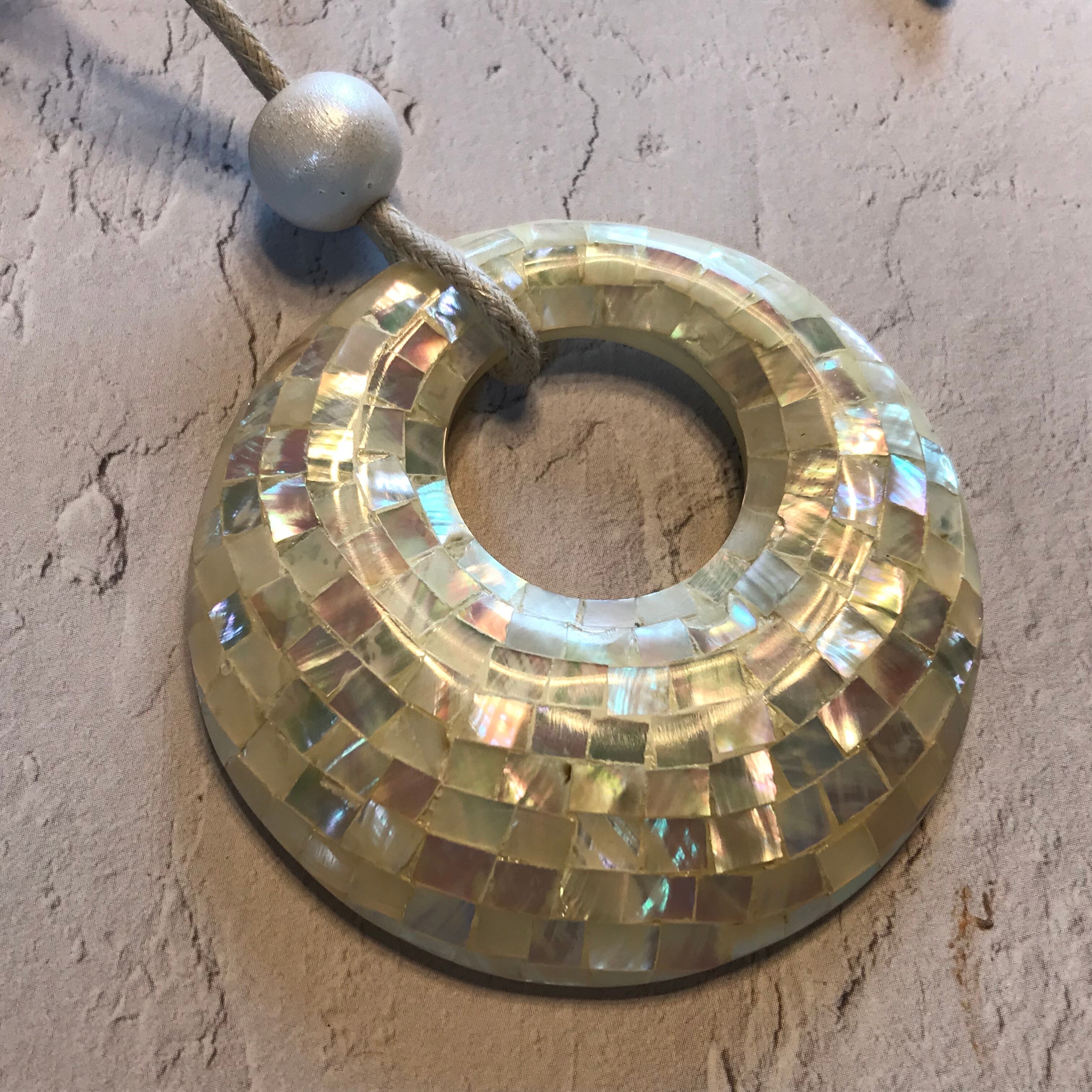 一見すると普通の丸いかたちのネックレスですが、細かなシェル(貝)がたくさんモザイク状に散りばめてあります。