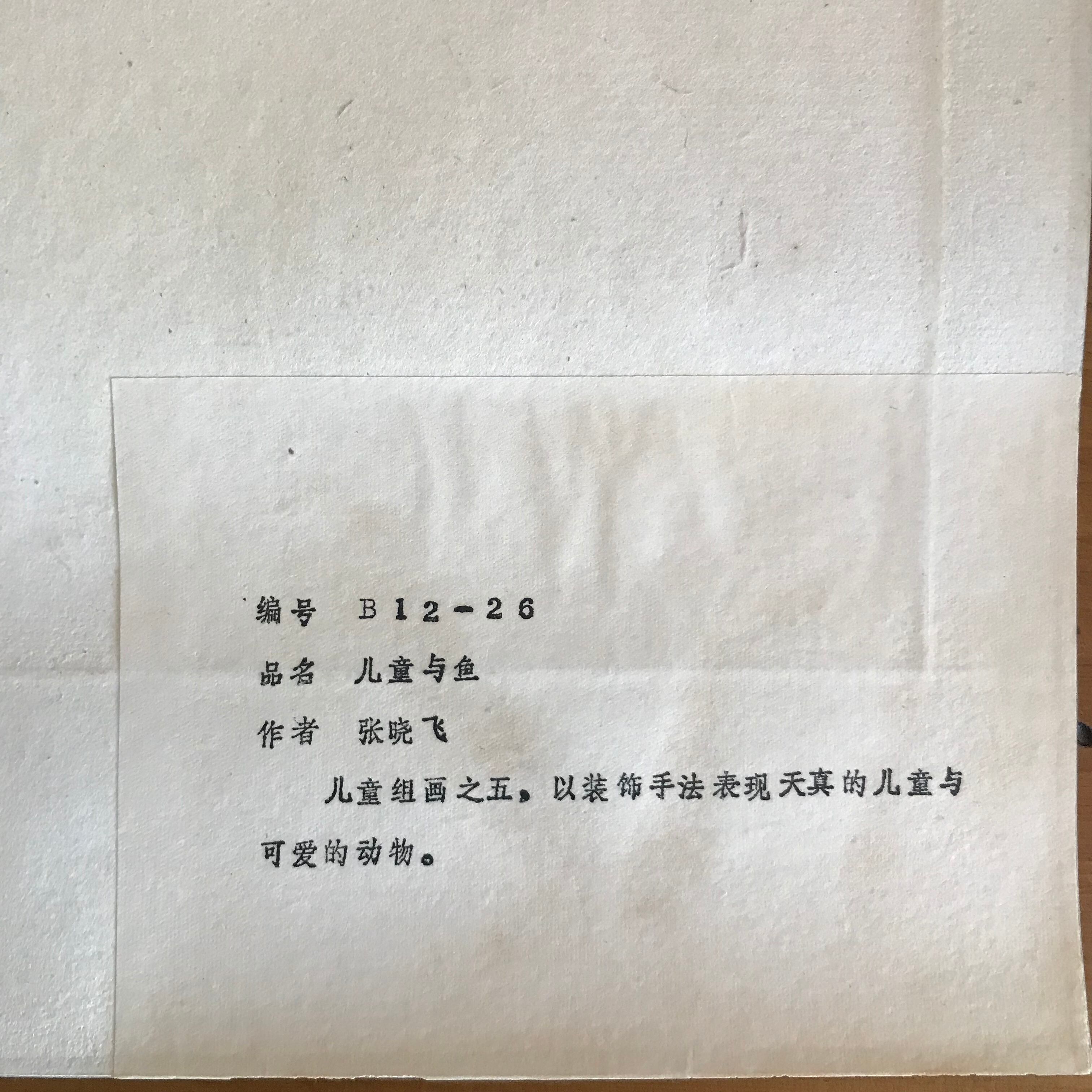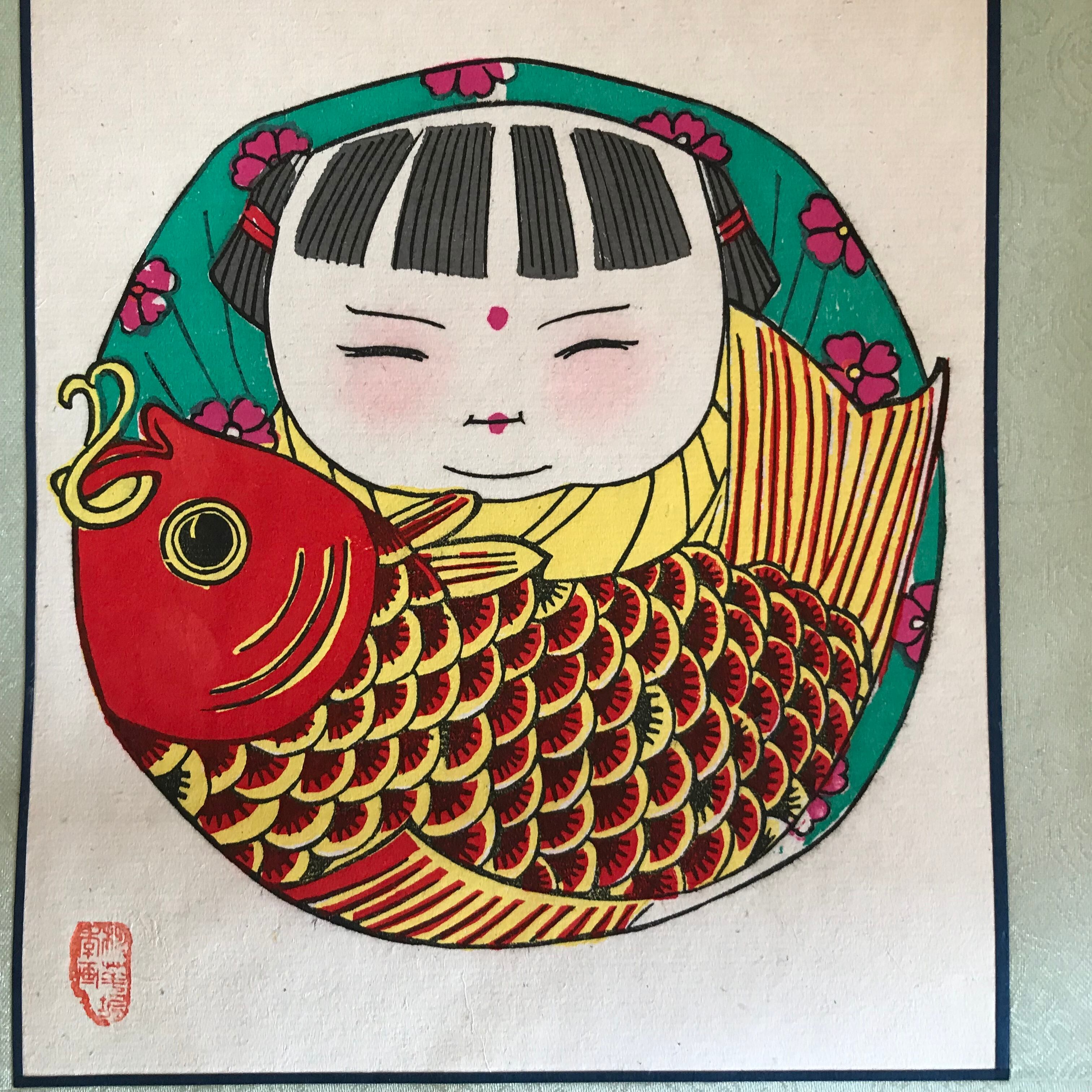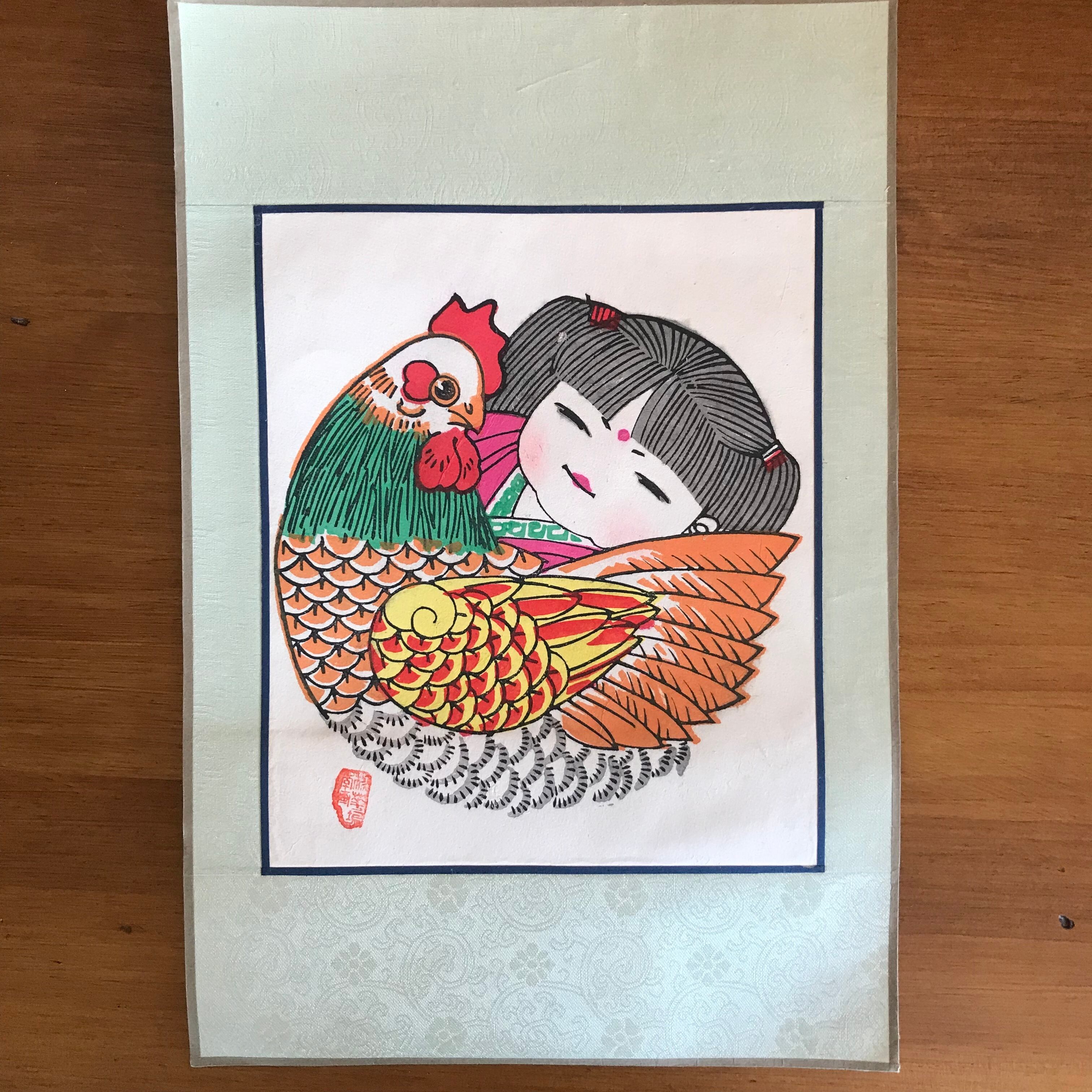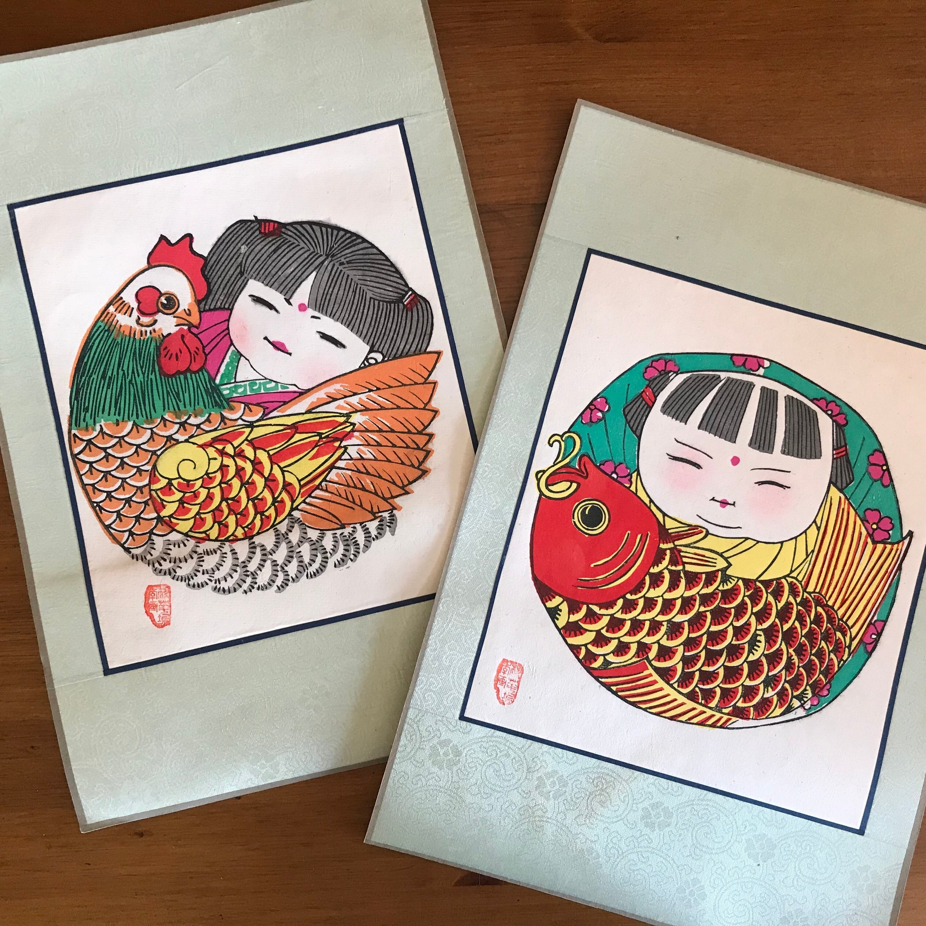 【シノワズリ】作家さんの古い版画 子どもとにわとり/魚