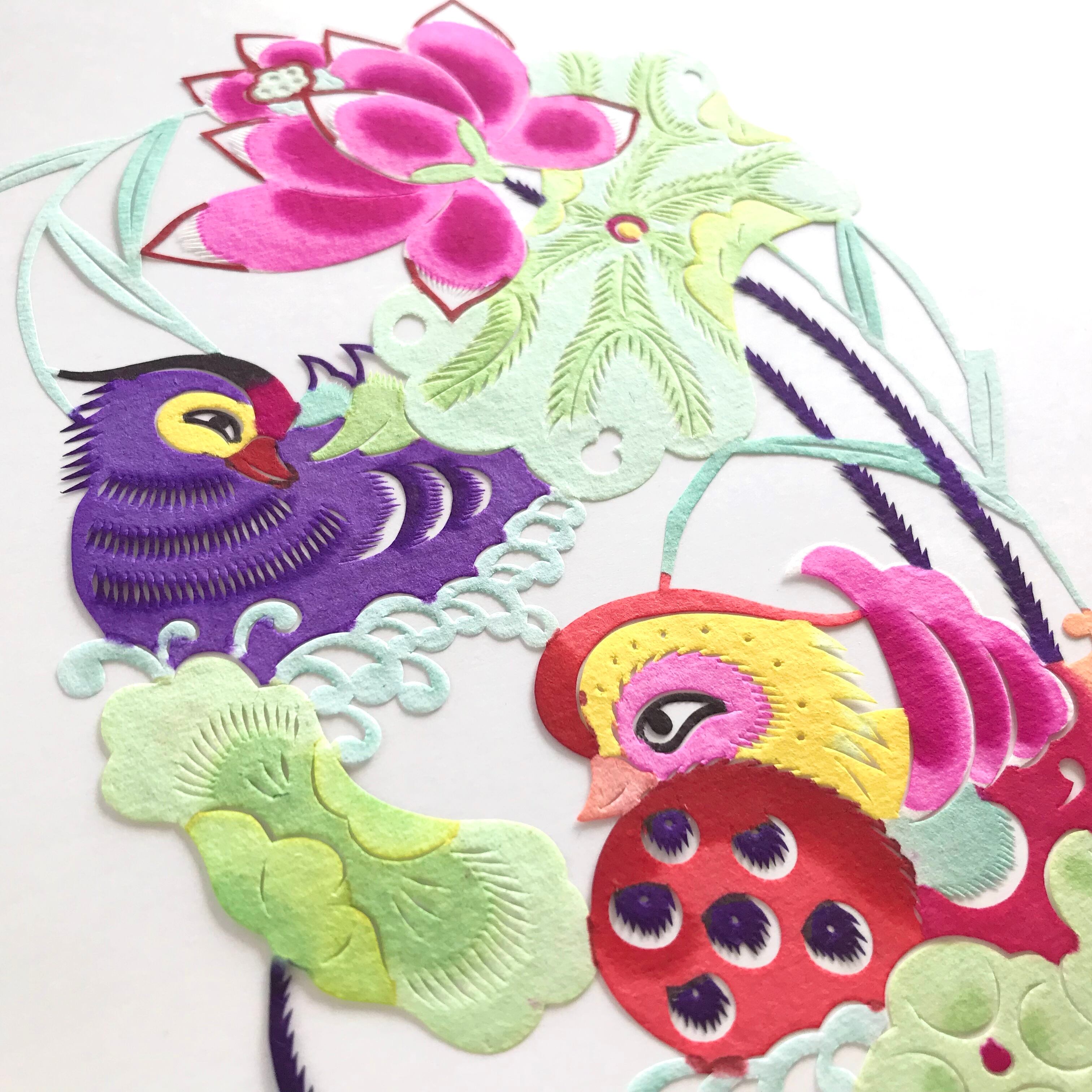 二羽の水鳥の表情と蓮の花が中国らしいデザインですね。